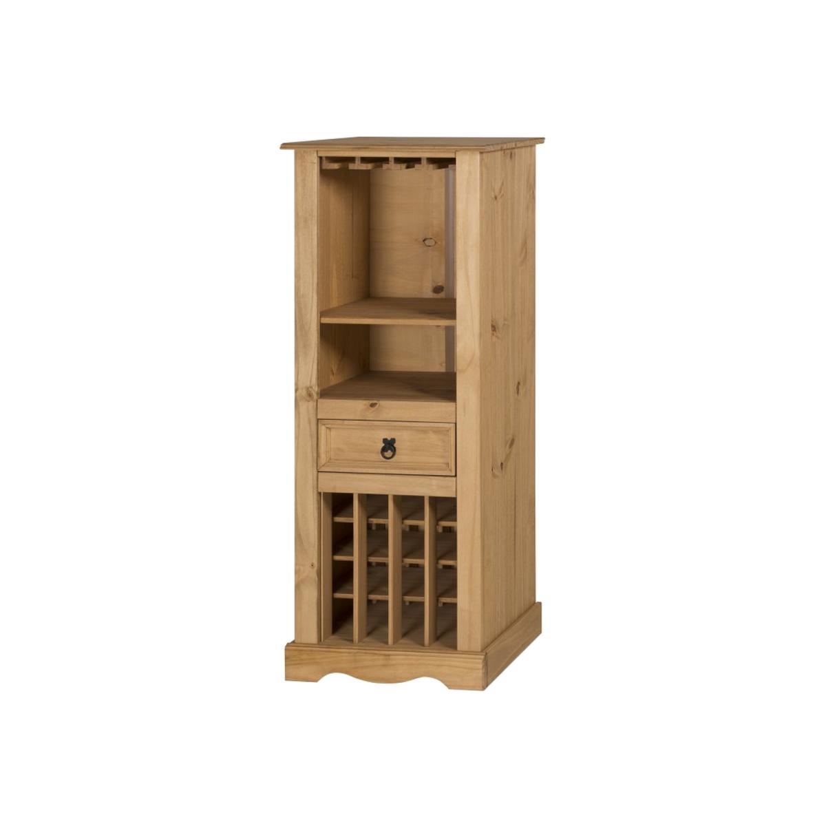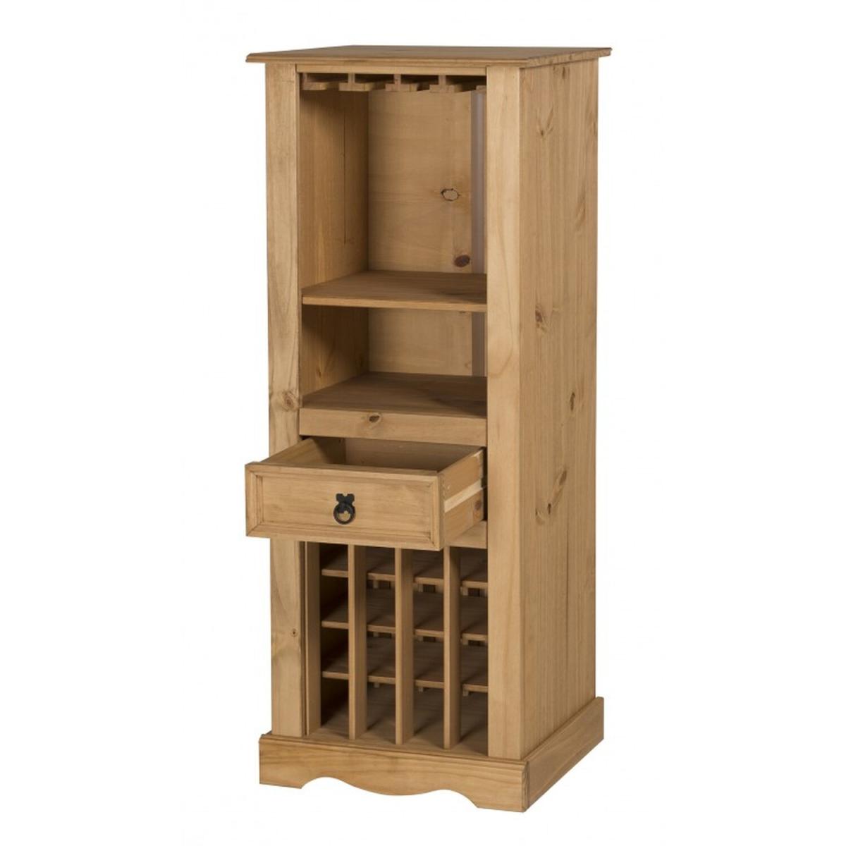 Mercers Furniture is happy to offer this Corona Wine Rack, the item is expertly crafted from solid pine and hand waxed to preserve as well as enhance the grain. It offers outstanding value for money with 1 drawer that would be a welcome addition to any room. It is finished off with black metal fittings which give the item its distinctive Mexican styling and offers that warm rustic country charm. The item has a hardboar drawer base, its delivered flat packed for easy home assembly with step-by-step instructions. Height - 135cm. Width - 56cm. Depth - 35cm