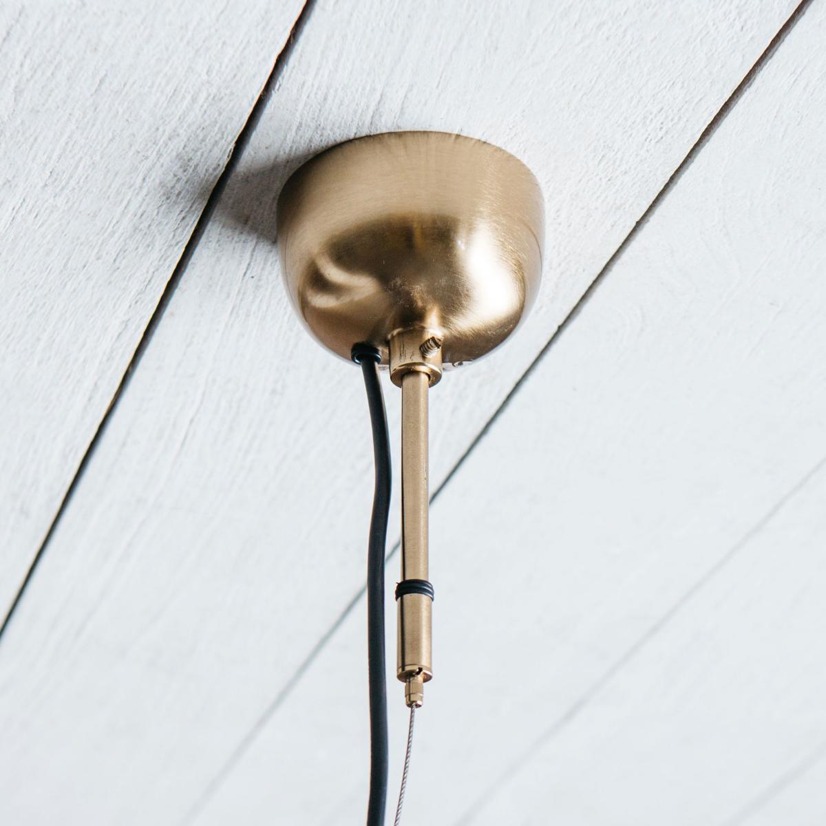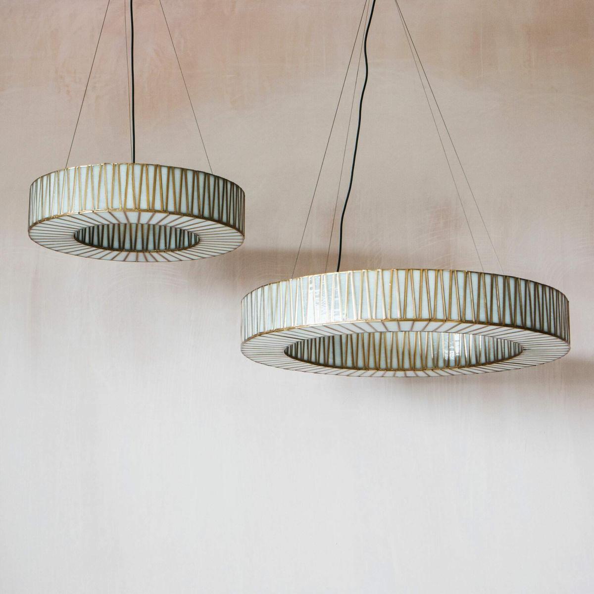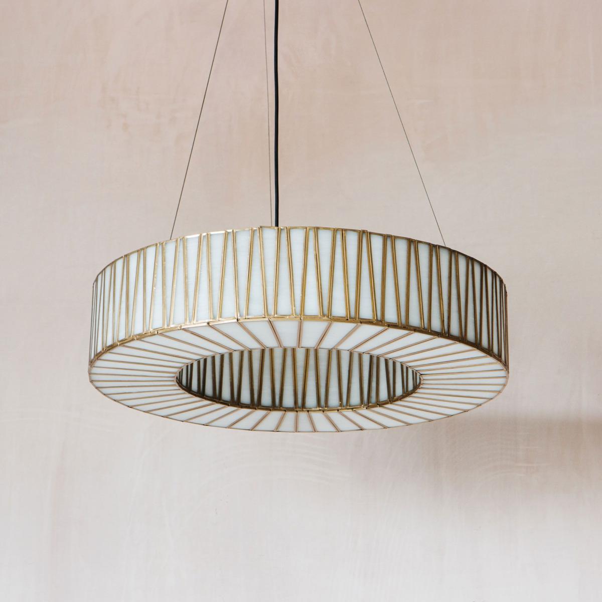 Drawing inspiration from Art Deco architecture, our Corrine chandeliers feature frosted glass panelling and gold geometric linework. This beautiful pendant will add a touch of splendour to any home. Available in two sizes.