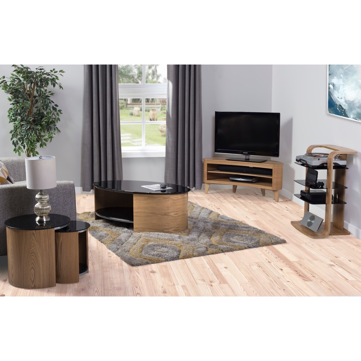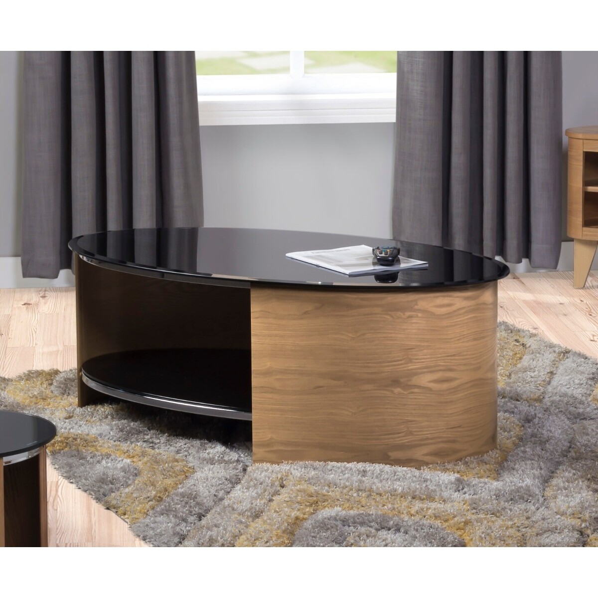 A coffee table can be a fantastic centrepiece for any living room and the Corsair 120cm Oak Oval Coffee Table is no exception. The curved oval design of the 120cm table is set off by the stunning black glass top and curved wood that opens up to a lower glass shelf that is ideal storage space. Beautifully manufactured, the coffee table is made with solid curved wood that is finished in a luxurious real oak veneer. The stunning black glass meets current British standard and is complemented by stunning chrome edging. Further Items in the Collection: Corsair Oak Coffee Table, Corsair Oak Sideboard, Corsair Oak Bookcase, Corsair Oak Oval Lamp Table and Corsair Oak TV Stand.