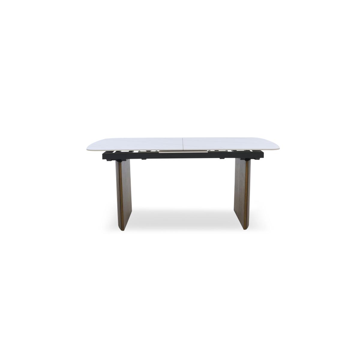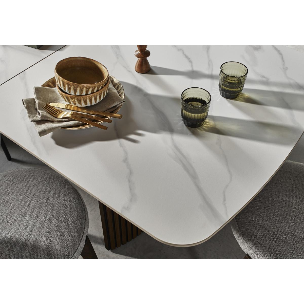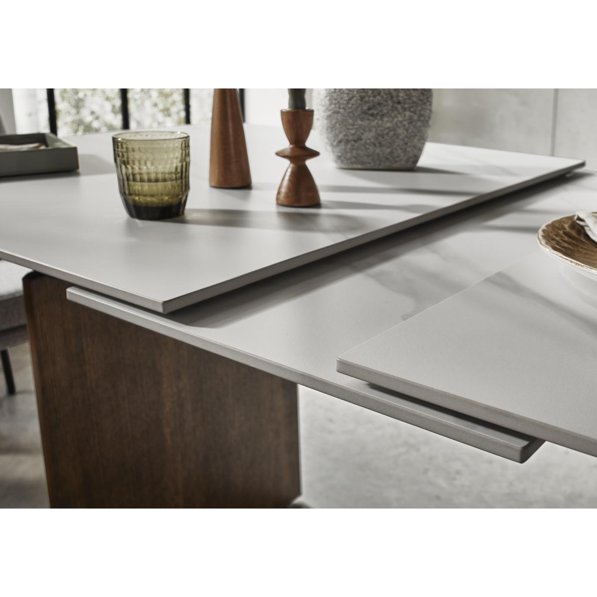 Excellence in design is evident from top to bottom of the Cortado extending dining table. With its matt ceramic surface, unique fluted leg design and smooth pop-up mechanism, it’s sophisticated and elegant. Why you'll love it A stylish mix of ceramic and wood creates a naturally sophisticated look. This stunning boat-shaped extending dining table has graceful curved ends. Gorgeous ceramic table top has an understated matt finish. It’s matched only by the distinctive curved and fluted base in solid ash and ash veneer. Super-easy pop-up extension mechanism – gently pull on the table ends and the extra leaf pops up. And it’s just as easy to maintain – ceramic is heatproof, scratch-resistant and chip-resistant. Arrives fully assembled. This extending dining table is part of the Cortado range. What you need to know 170 cm dining table seats up to 6 closed and extends to 210 cm to seat up to 8. We recommend using coasters and placemats at all times. Easy to care for. Simply wipe with a clean damp cloth.