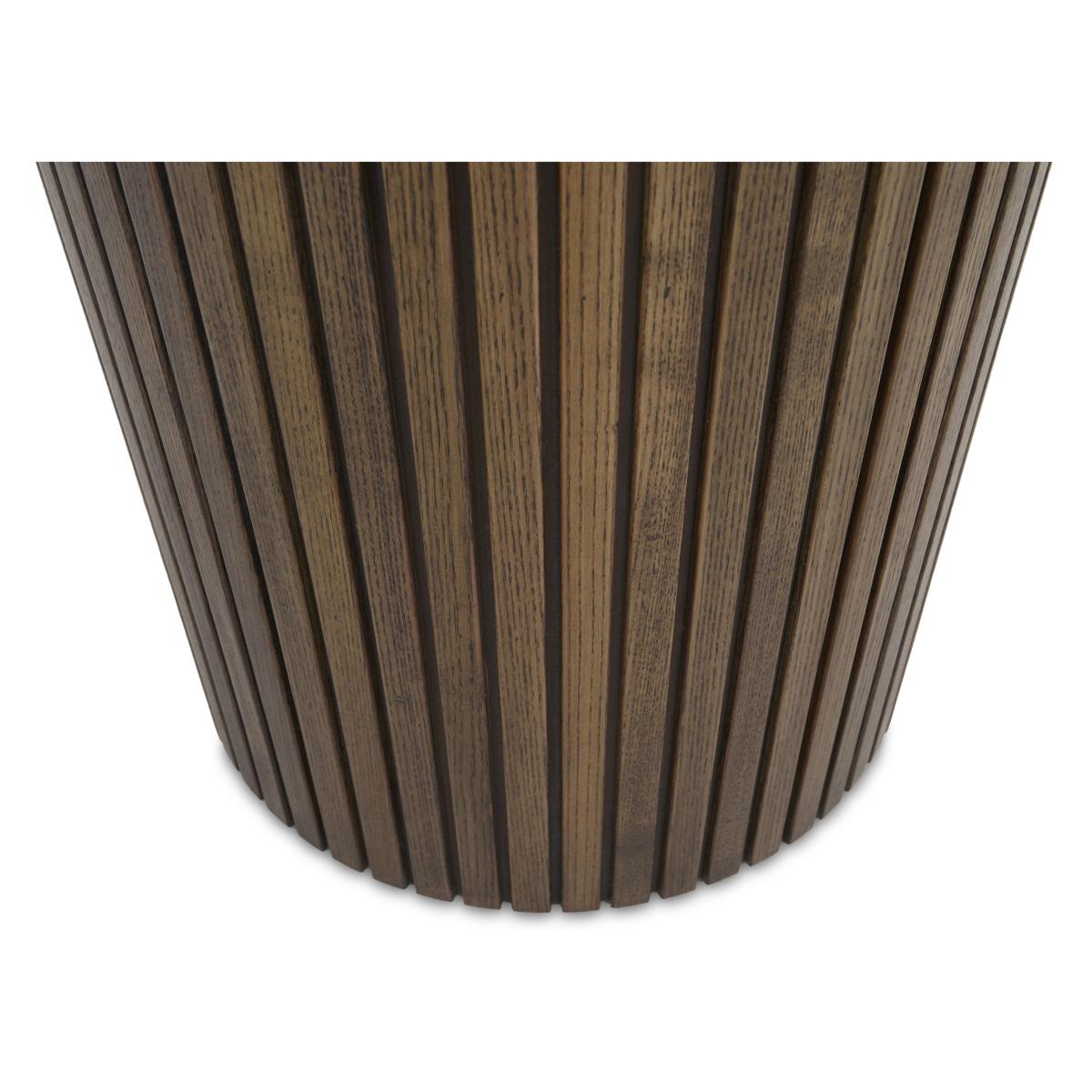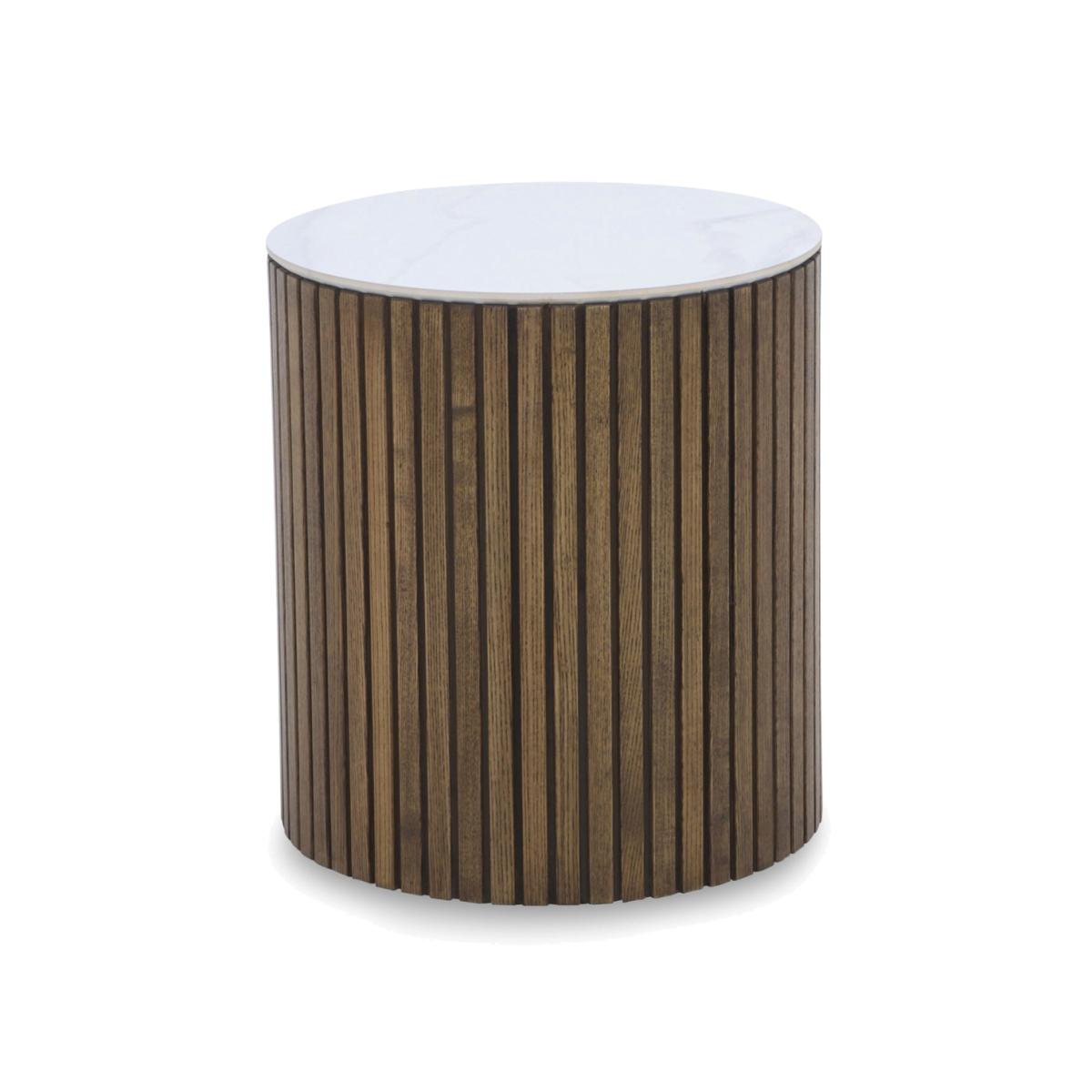I’ve been using this cortado table in everything from Scandi-inspired lounges to pared-back mid-century schemes because its fluted timber drum and white marble-effect top bring both texture and light. It’s the perfect small-footprint surface beside an armchair or sofa, and its round form softens harder lines in a space. For styling, keep it simple: a slender metal lamp or a small green plant balances the wood grain, while a neat stack of books or a ceramic vessel adds height and character. It also works brilliantly as a minimalist bedside spot.