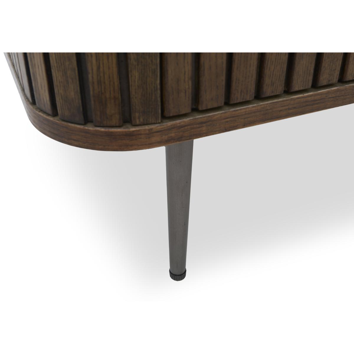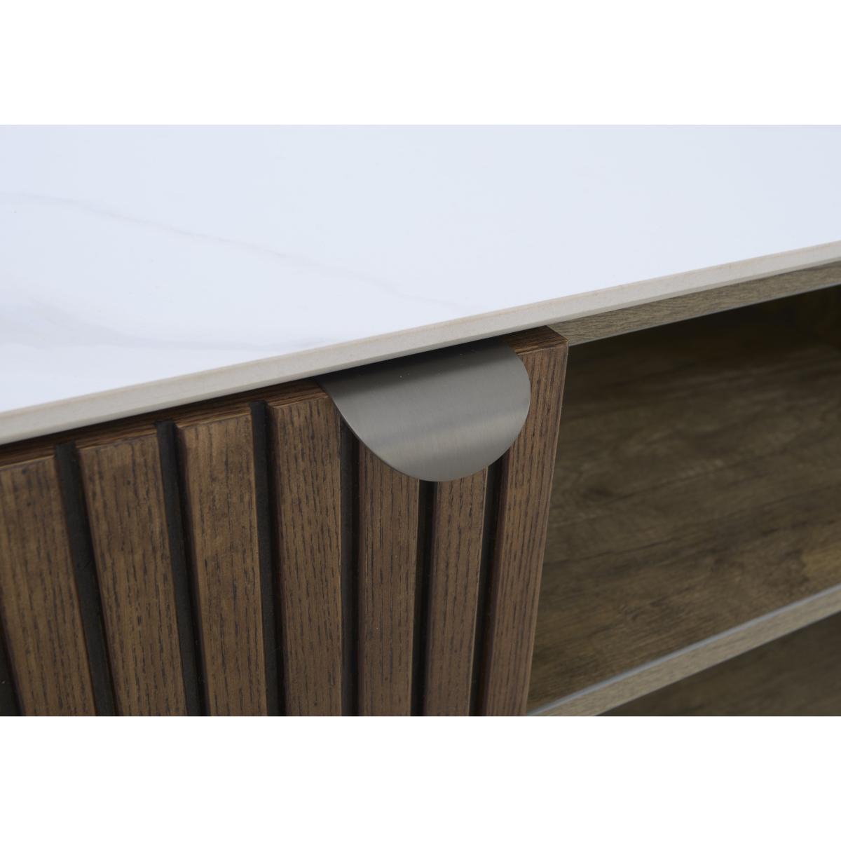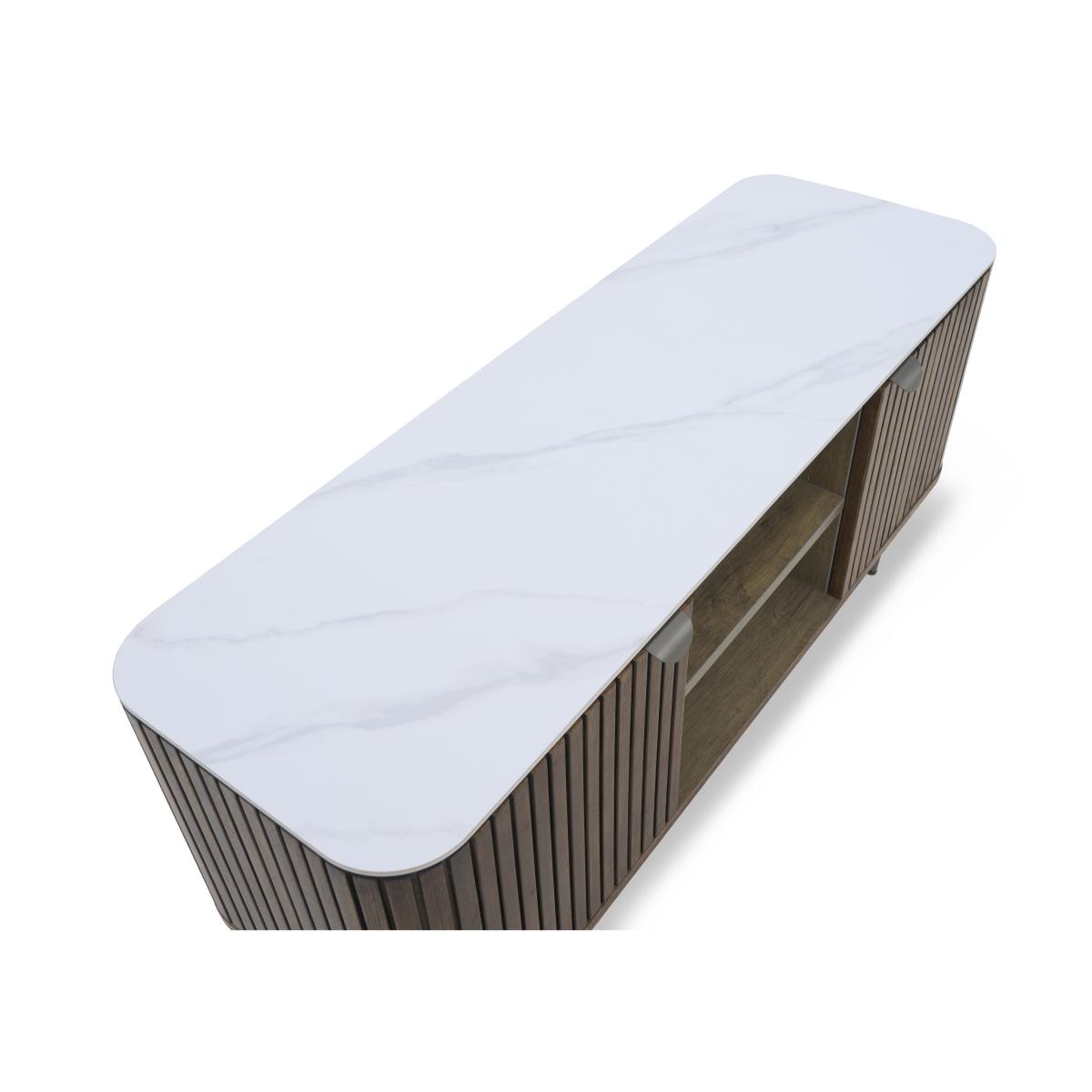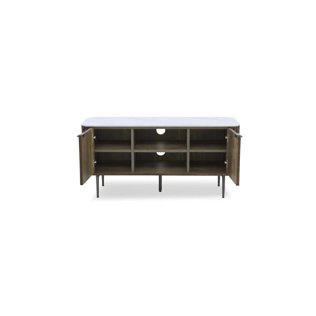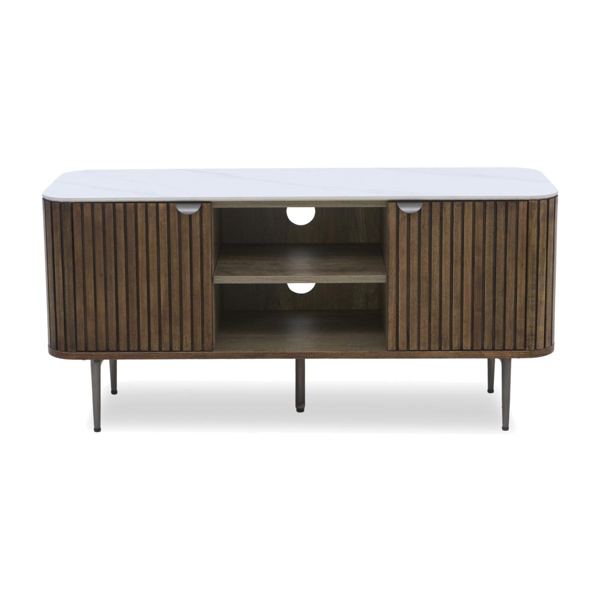 Make watching TV a more sophisticated pursuit with this stunning media cabinet. With a matt ceramic top and fluted wood frame, it provides storage with statement style. Why you'll love it A stylish mix of ceramic and wood creates a naturally sophisticated look. The curved ceramic top has an understated matt finish. It’s matched only by the distinctive curved and fluted frame in solid ash and ash veneer. Easy to keep looking perfect – ceramic is heatproof, scratch-resistant and chip-resistant. Neatly finished with a matching dark wood interior. Soft-closing cupboard doors. Arrives fully assembled. This TV unit is part of the Cortado range. What you need to know 1 wide cupboard with an adjustable shelf. We recommend using coasters and placemats at all times. Easy to care for. Simply wipe with a clean damp cloth. WARNING!