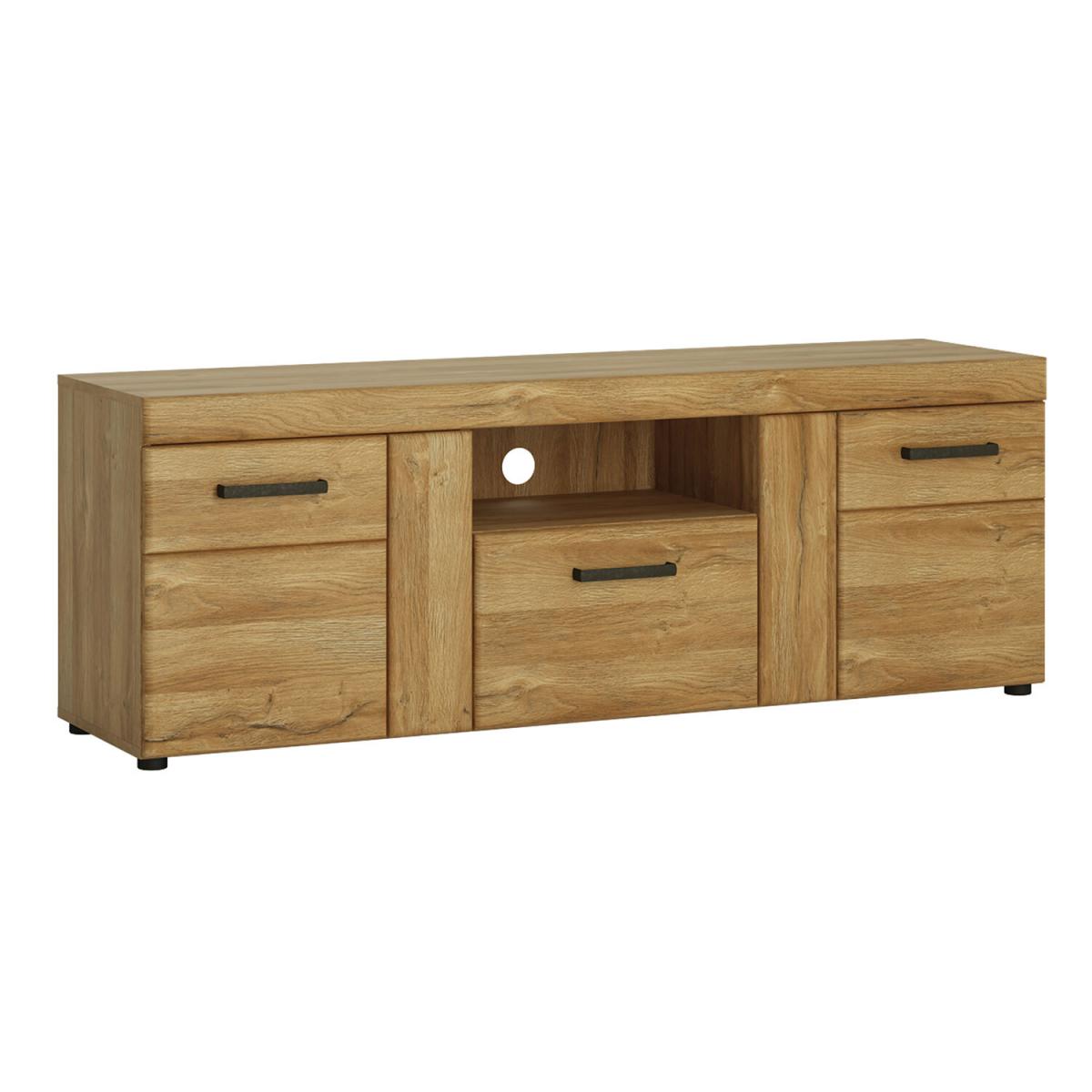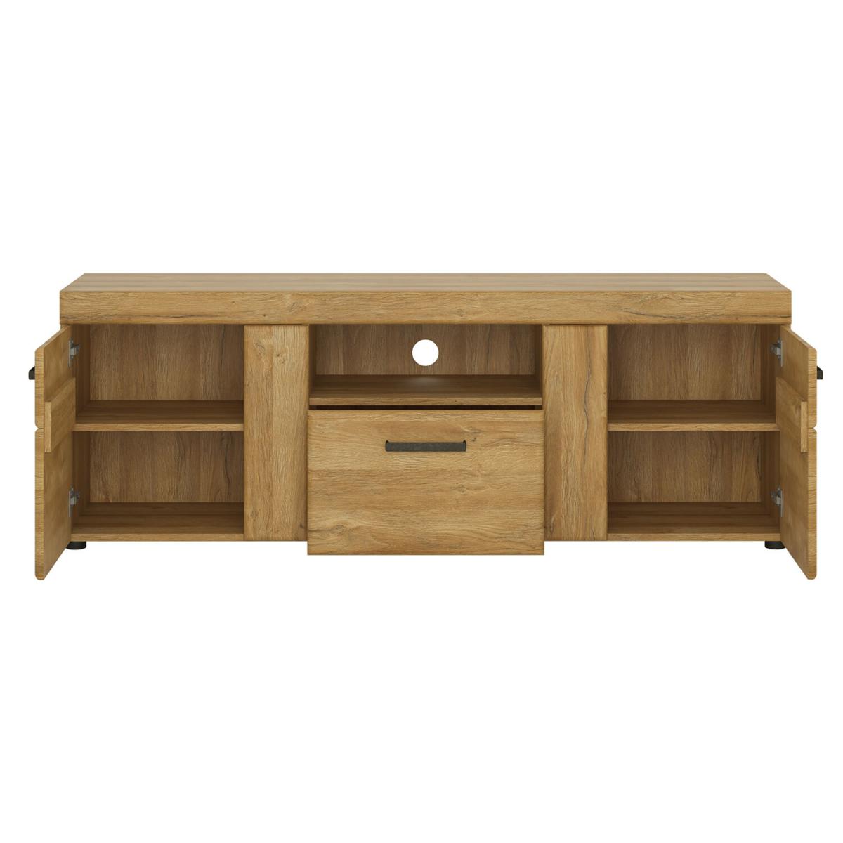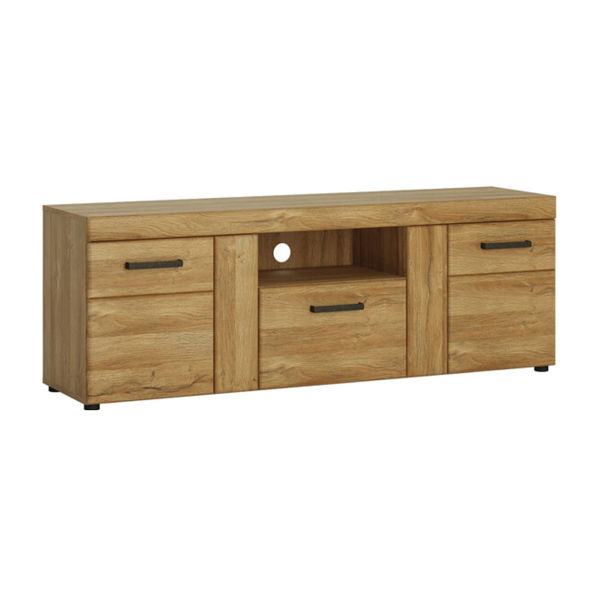 The Cortina 2-Door 1-Drawer Tall TV Cabinet is a unique, must-have element of any functional living room. There are two cabinets, a drawer, and an open shelf at your disposal – you can use these to store both large items and small knick-knacks. For lovers of natural wood, this unit offers you the opportunity to enjoy the charm of wooden furniture whilst being made from high-quality MDF in the colour of grandson oak, which looks just like natural timber. An additional feature is the beautiful antique metal handles which give a timeless elegance to the design.