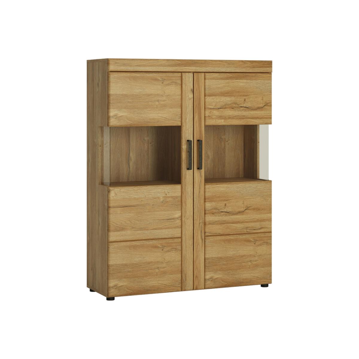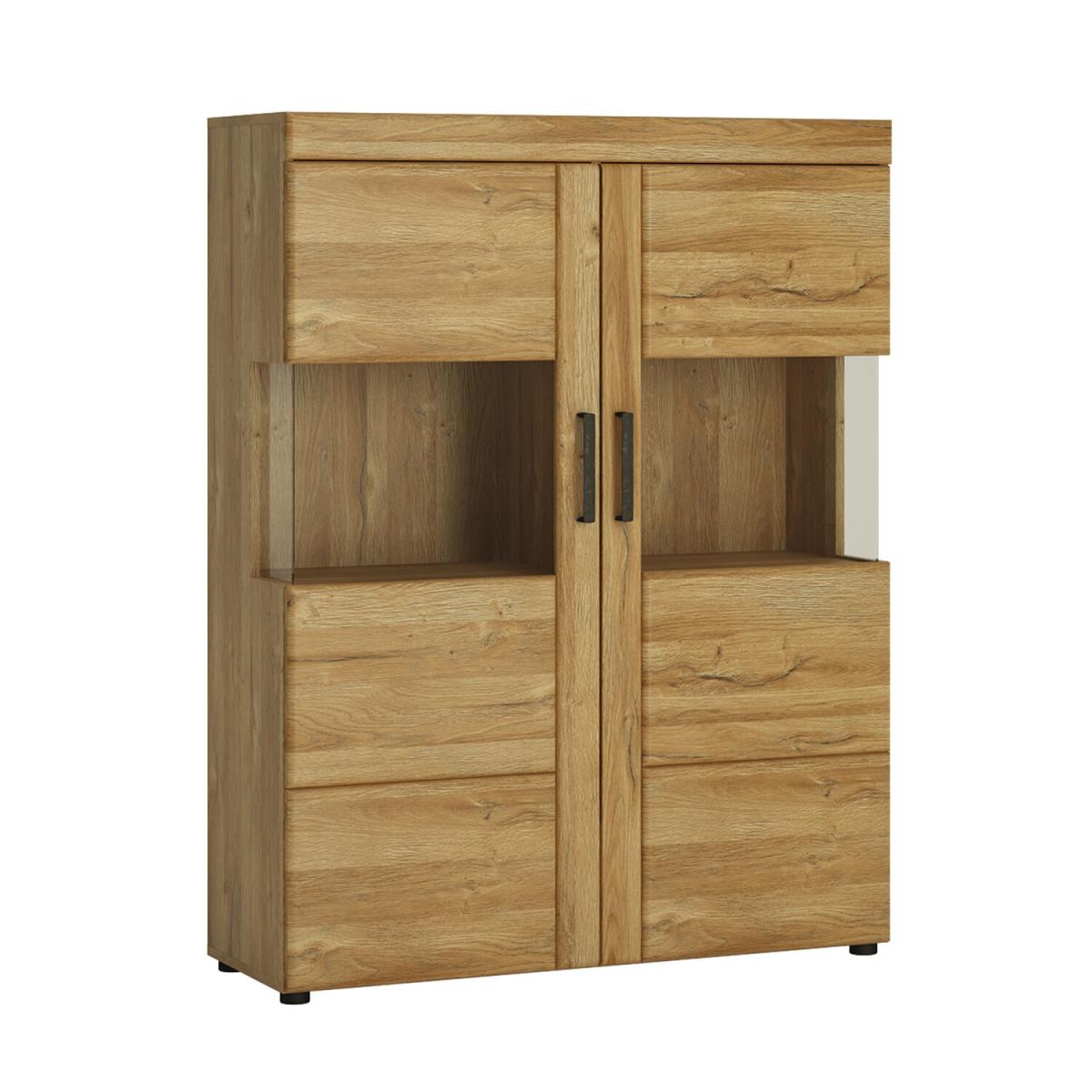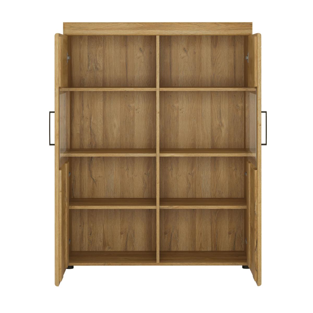 The Cortina Low Wide 2-Door Display Cabinet is a low glazed display cabinet with a total of 6 shelves, making it great for the living room or dining room. The glazed front lets you elegantly display both home decorations and porcelain. For lovers of natural wood, this cabinet offers you the opportunity to enjoy the charm of wooden furniture though it's actually made from high quality MDF in the colour of grandson oak, which looks just like natural timber. An additional feature is the beautiful antique metal handles which give a timeless elegance to the collection.
