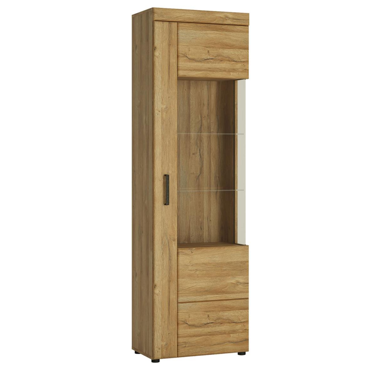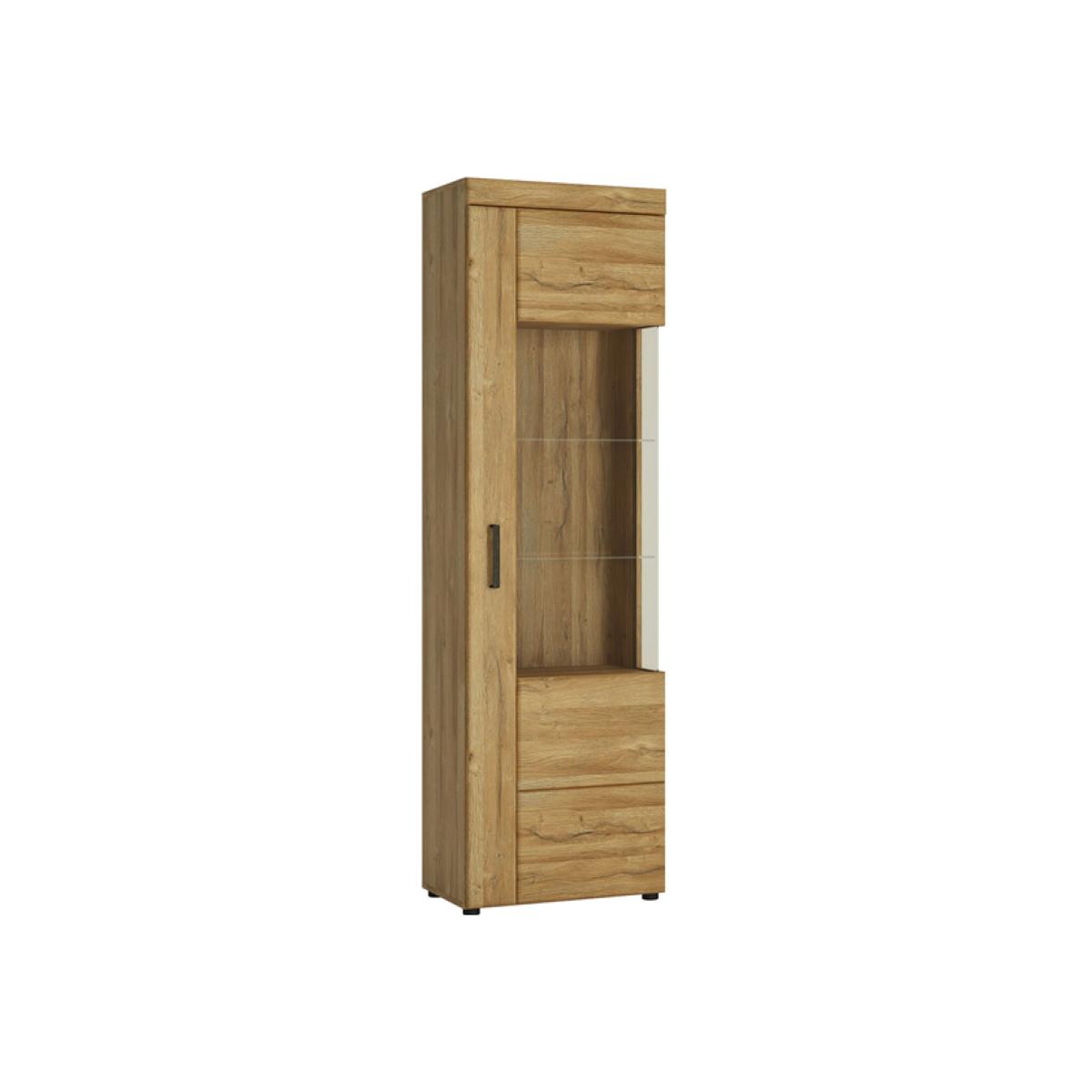 The Cortina Tall Glazed Display Cabinet is a narrow, glazed display cabinet with a total of 5 shelves – making it great for the living room or dining room. The glazed front lets you elegantly display both home decorations and porcelain on the 2 glass shelves. For lovers of natural wood, this piece offers you the opportunity to enjoy the charm of wooden furniture but is made from high-quality MDF in the colour of grandson oak, which looks just like natural timber. An additional feature is the beautiful antique metal handles which give a timeless elegance to the collection.