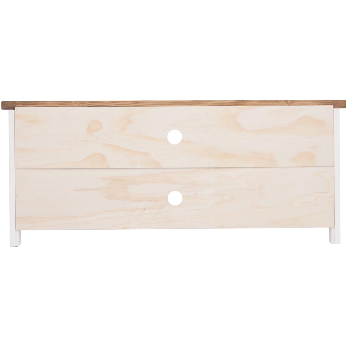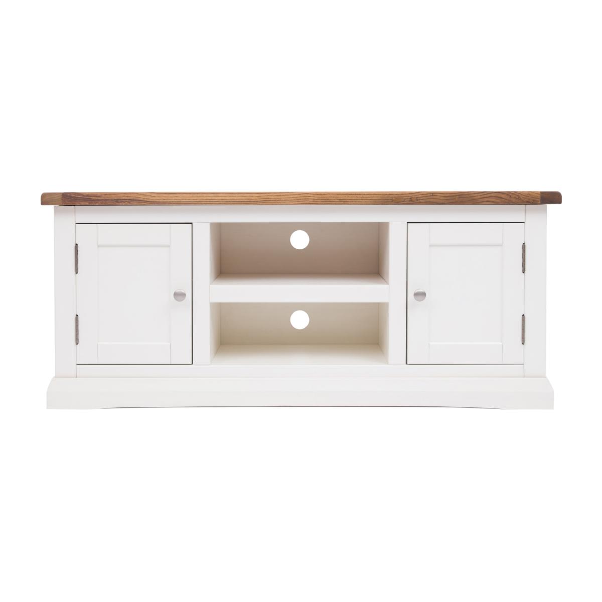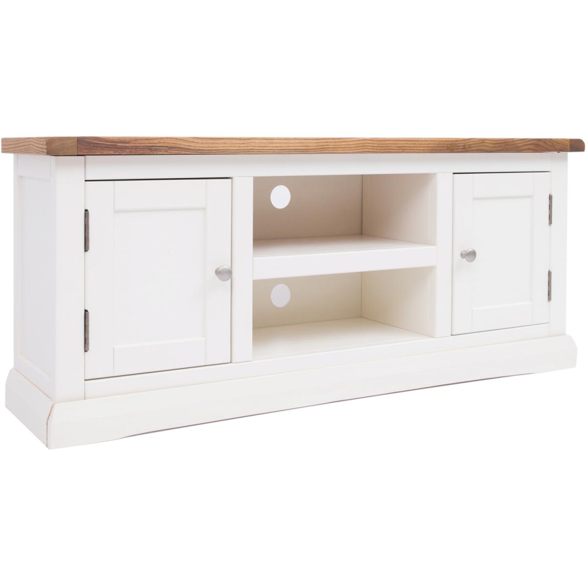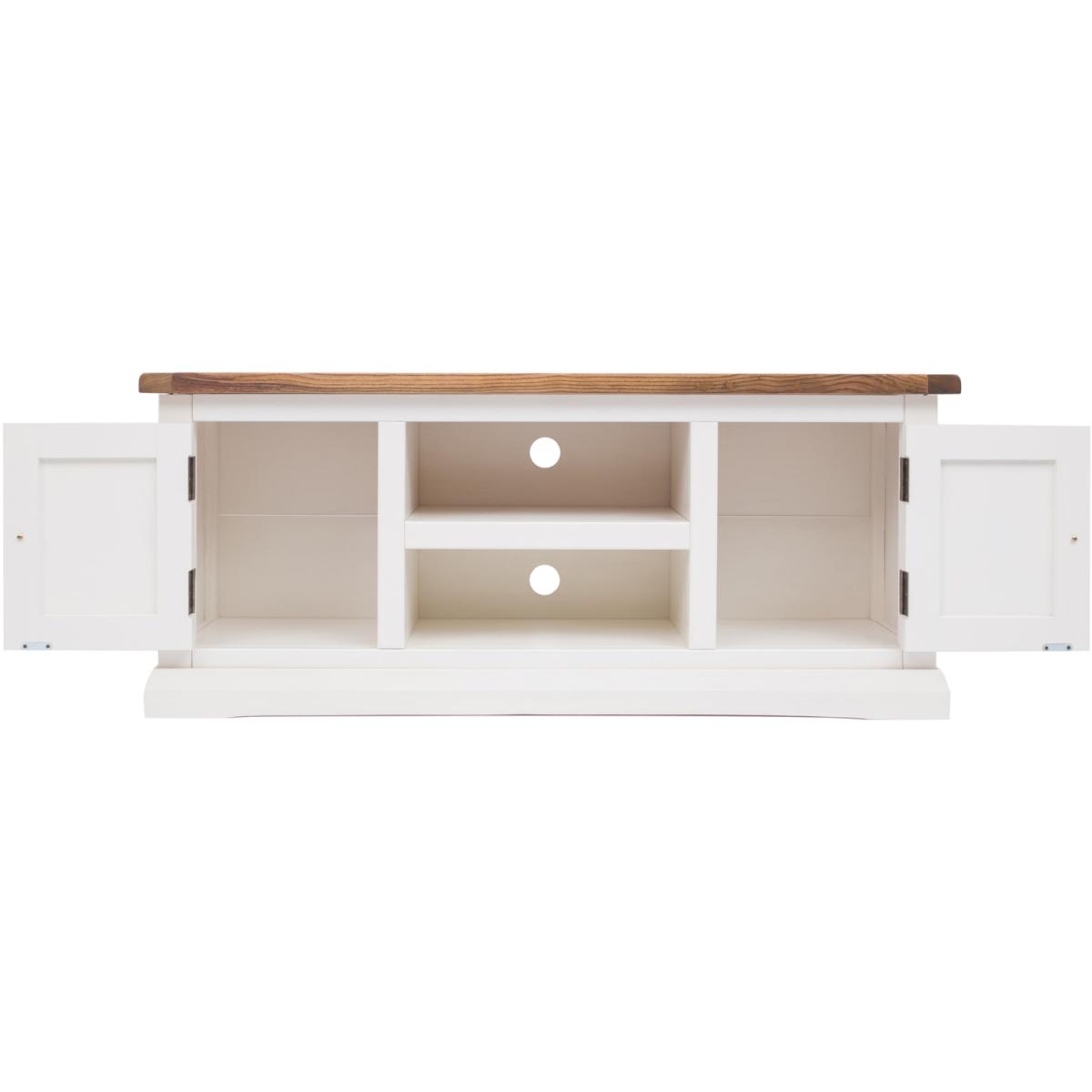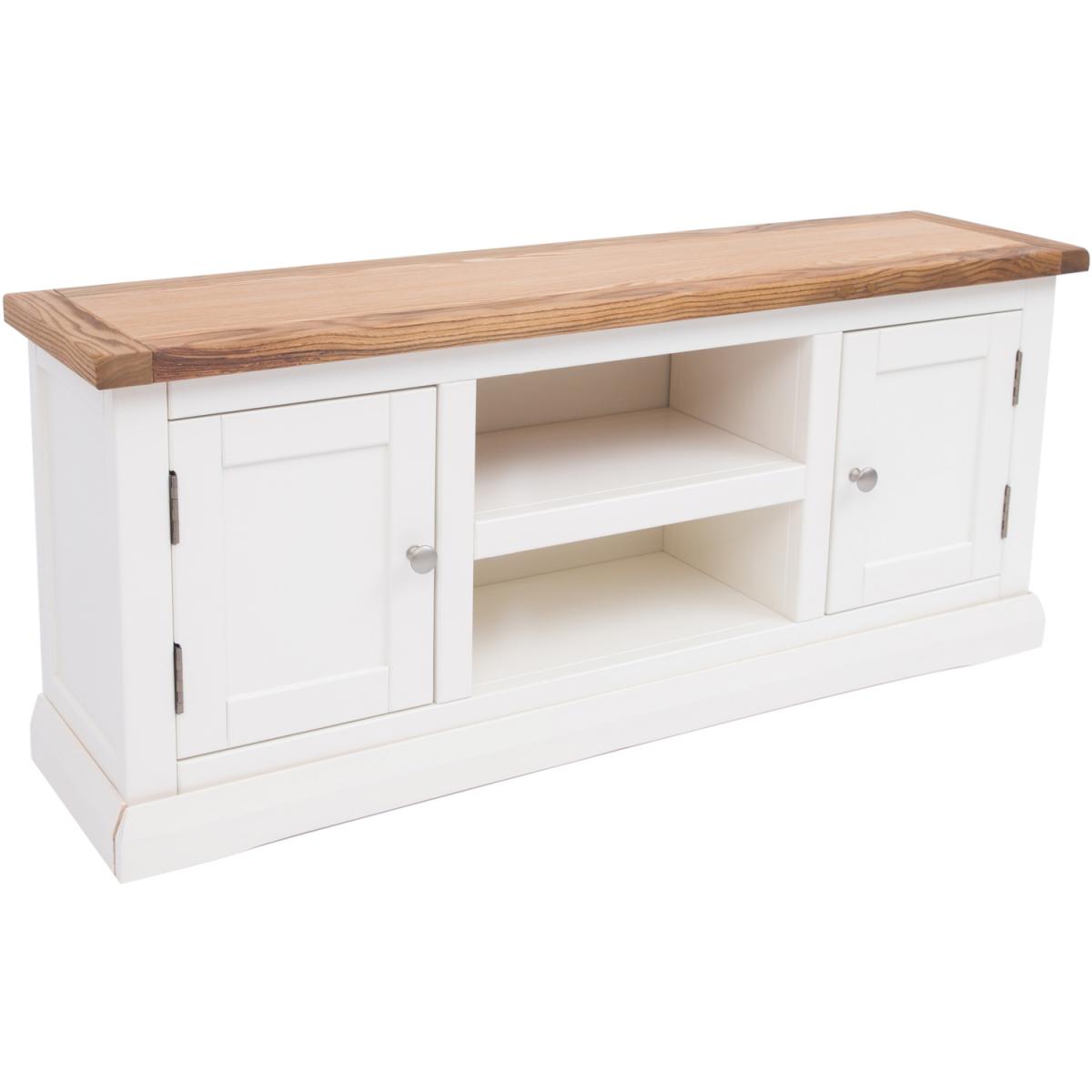 Our Cosenza collection has a simple but pleasing design and is produced by our skilled craftsmen to the highest standards using responsibly sourced wood and veneers. All tops are made using a combination of hardwood and ash veneer and are carefully hand waxed giving them a great look. The body is finished with high-quality eco-friendly water base paint in an off-white colour. This large TV unit has a mixture of storage and open space to house all your TV-related items together. There is plenty of space on top for your TV, in the centre below is an open space divided by a shelf creating two storage areas, easy access for wiring is available through the cable holes on the back of the unit. At either end are cupboards to hide away your games consoles or remotes, or even your snack for halftime! These attributes combined with a simple construction for easy assembly make it a great value product to be taken home today.