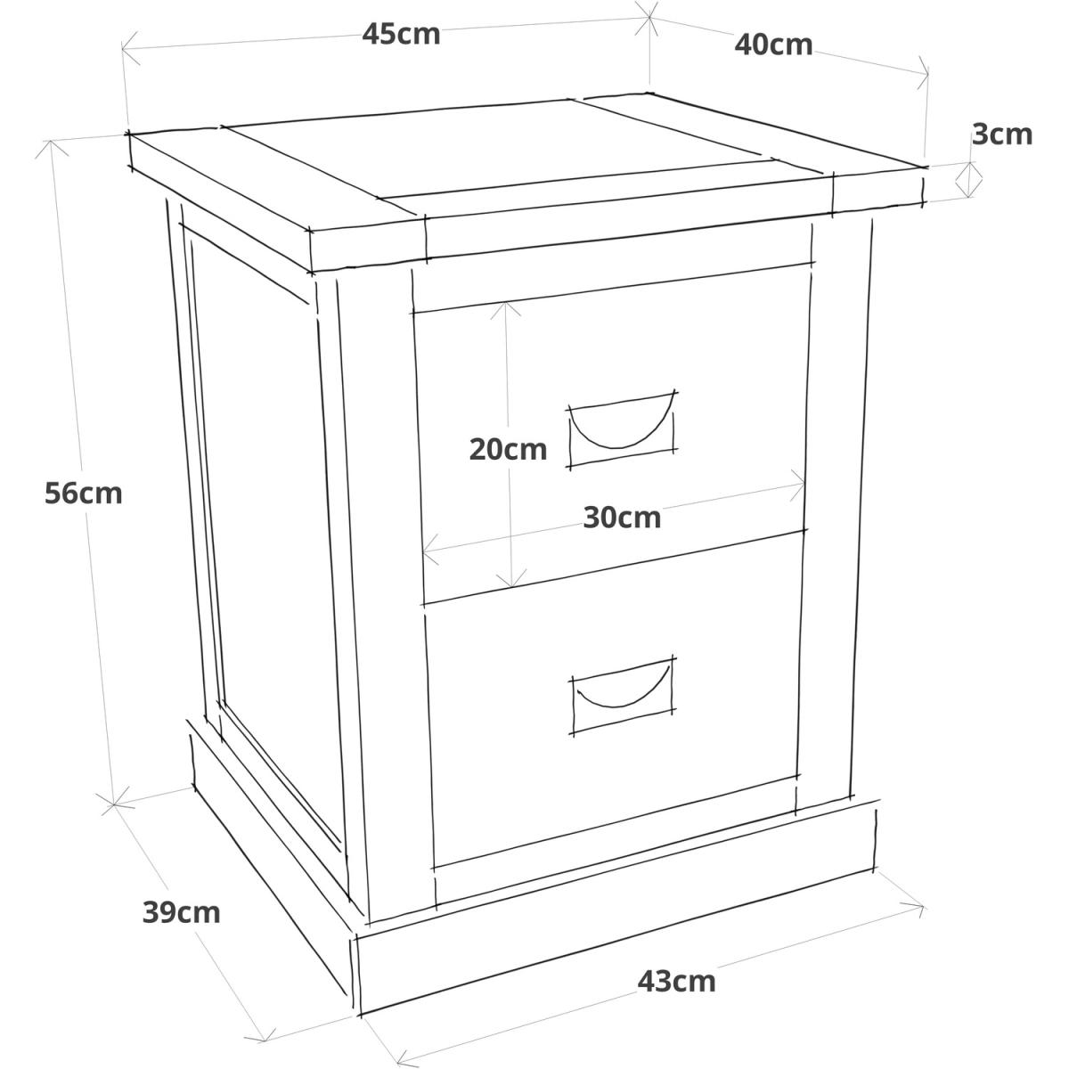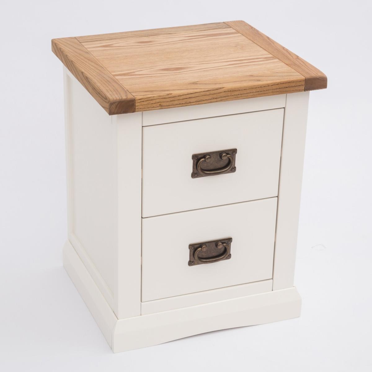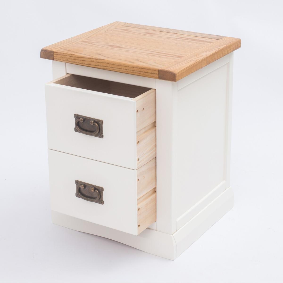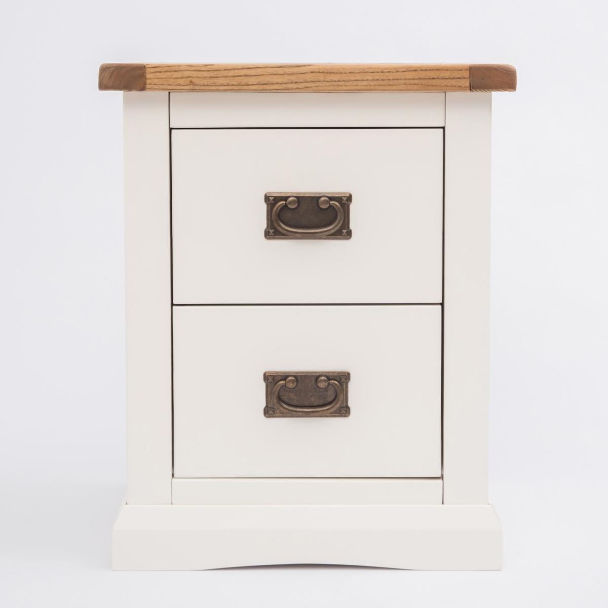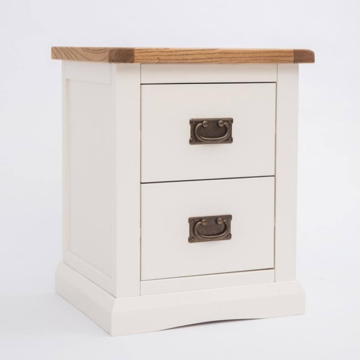 Our Cosenza collection has a simple but pleasing design and is produced by our skilled craftsmen to the highest standards using responsibly sourced wood and veneers. All tops are made using a combination of hardwood and ash veneer and are carefully hand-waxed giving them a great look. The body is finished with high-quality eco-friendly water-based paint in an off-white colour. This generous two-drawer bedside has deep drawers which allow all your requirements to be kept close to the bed and within easy reach, it also allows you to keep the top clutter-free and ready for your morning cuppa. These attributes combined with a simple construction for easy assembly make it a great value product to be taken home today.