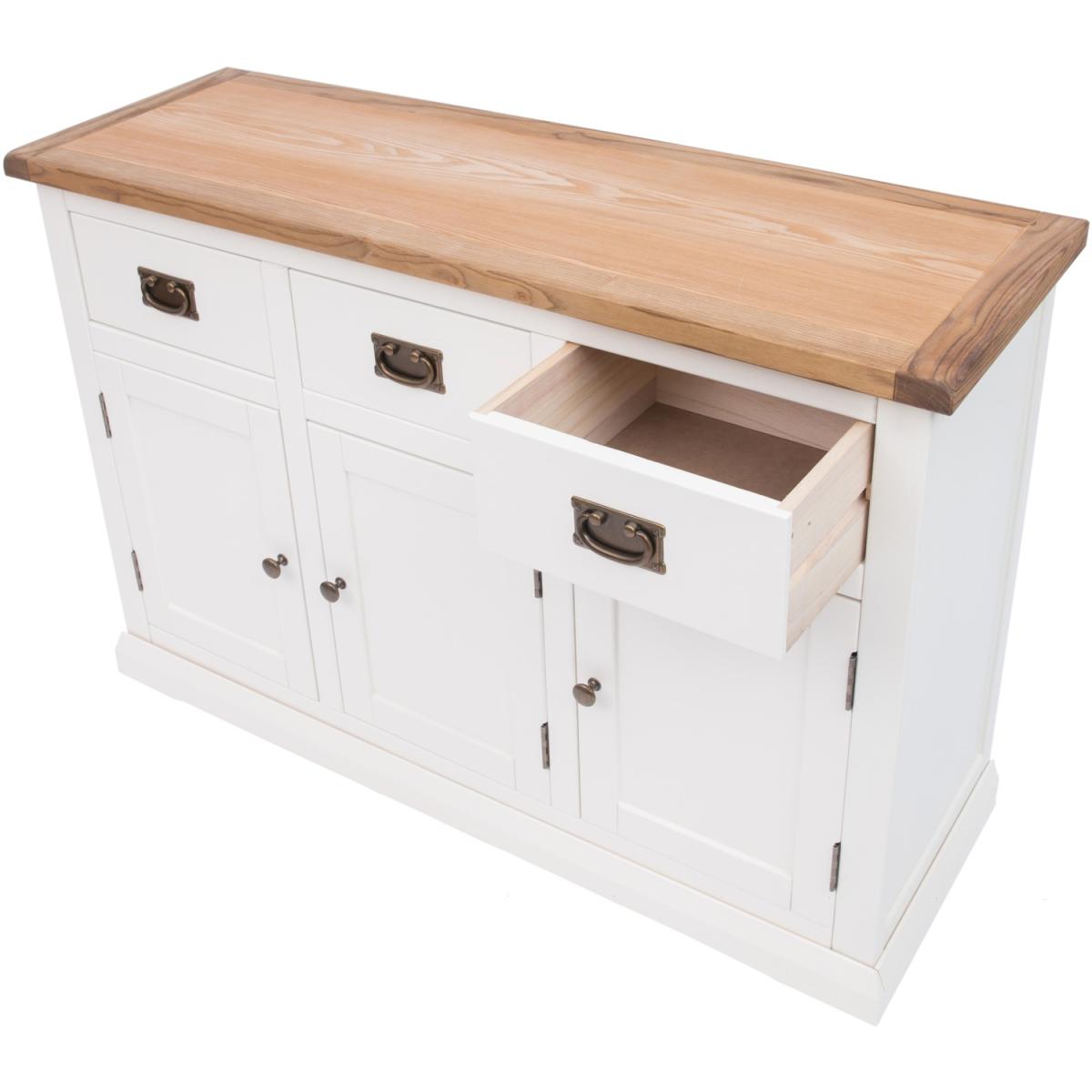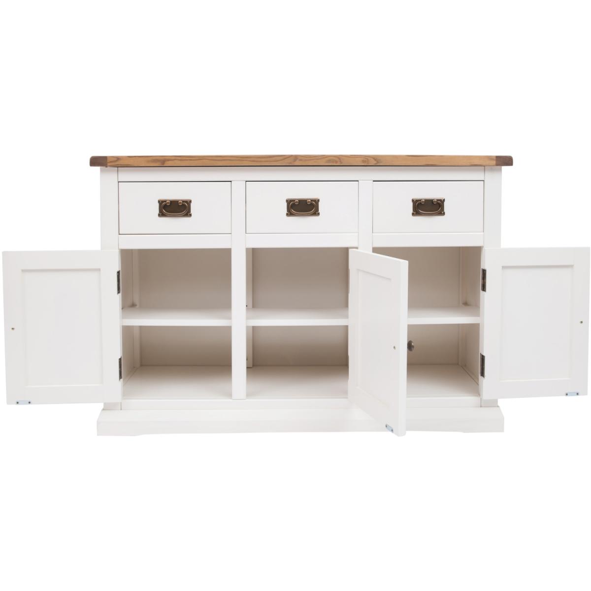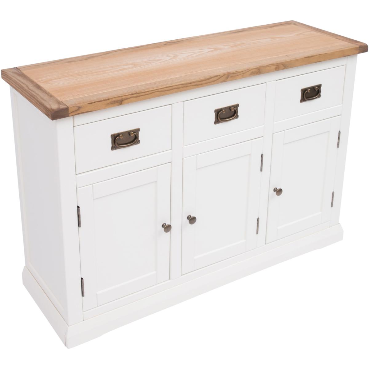 Our Cosenza collection has a simple but pleasing design and is produced by our skilled craftsmen to the highest standards using responsibly sourced wood and veneers. All tops are made using a combination of hardwood and ash veneer and are carefully hand waxed giving it a great look. The body is finished with a high quality eco-friendly water base paint in an off-white colour. This large 3 door 3 drawer sideboard will look at home in your dining room or lounge. The three doors conceal a large cupboard space for storing crockery, bottles or glassware and there is also a shelf to further organise your contents. Above this there are three drawers for storing your cutlery, napkins, coasters or even paperwork you need to hand. These attributes combined with a simple construction for easy assembly makes it a great value product to be taken home today.