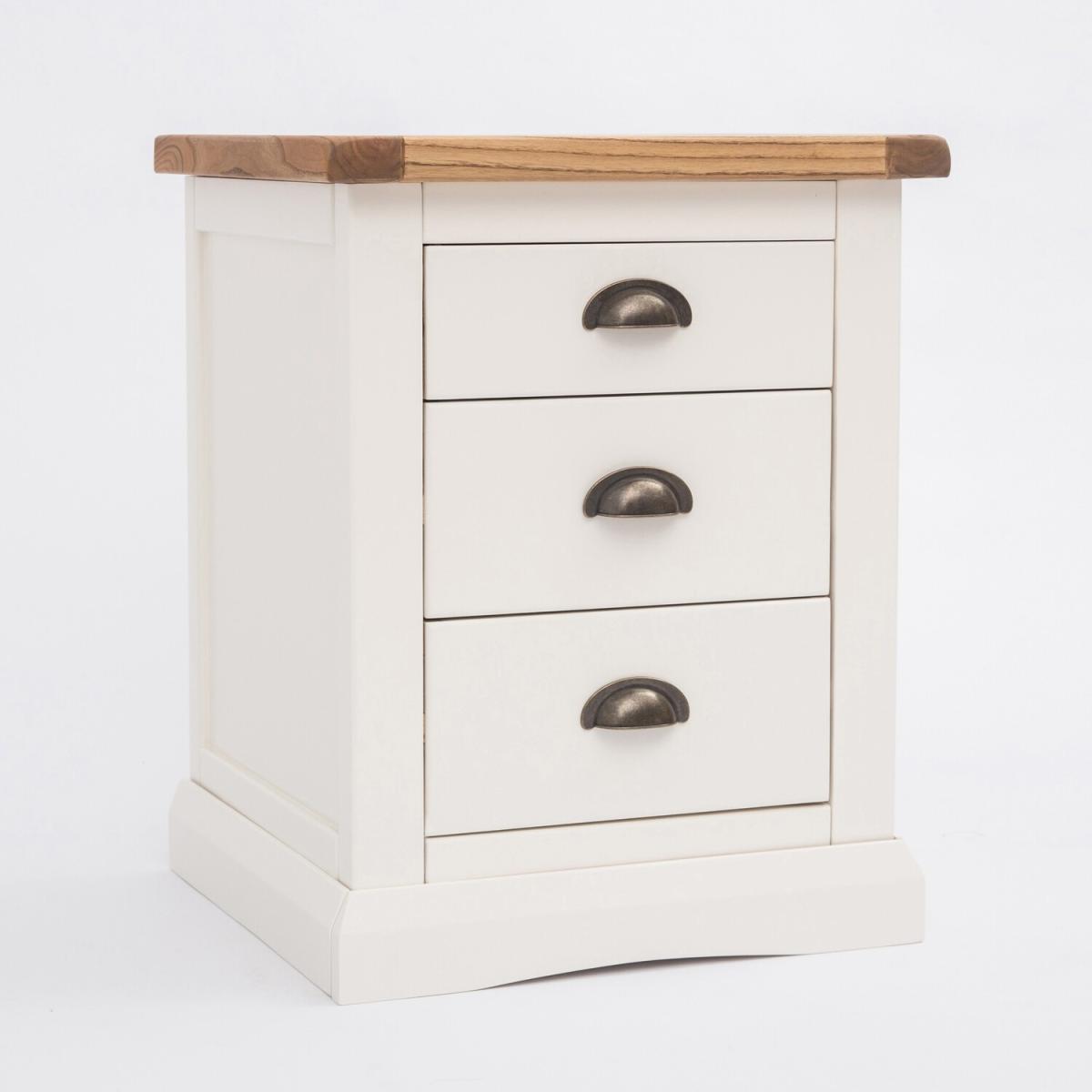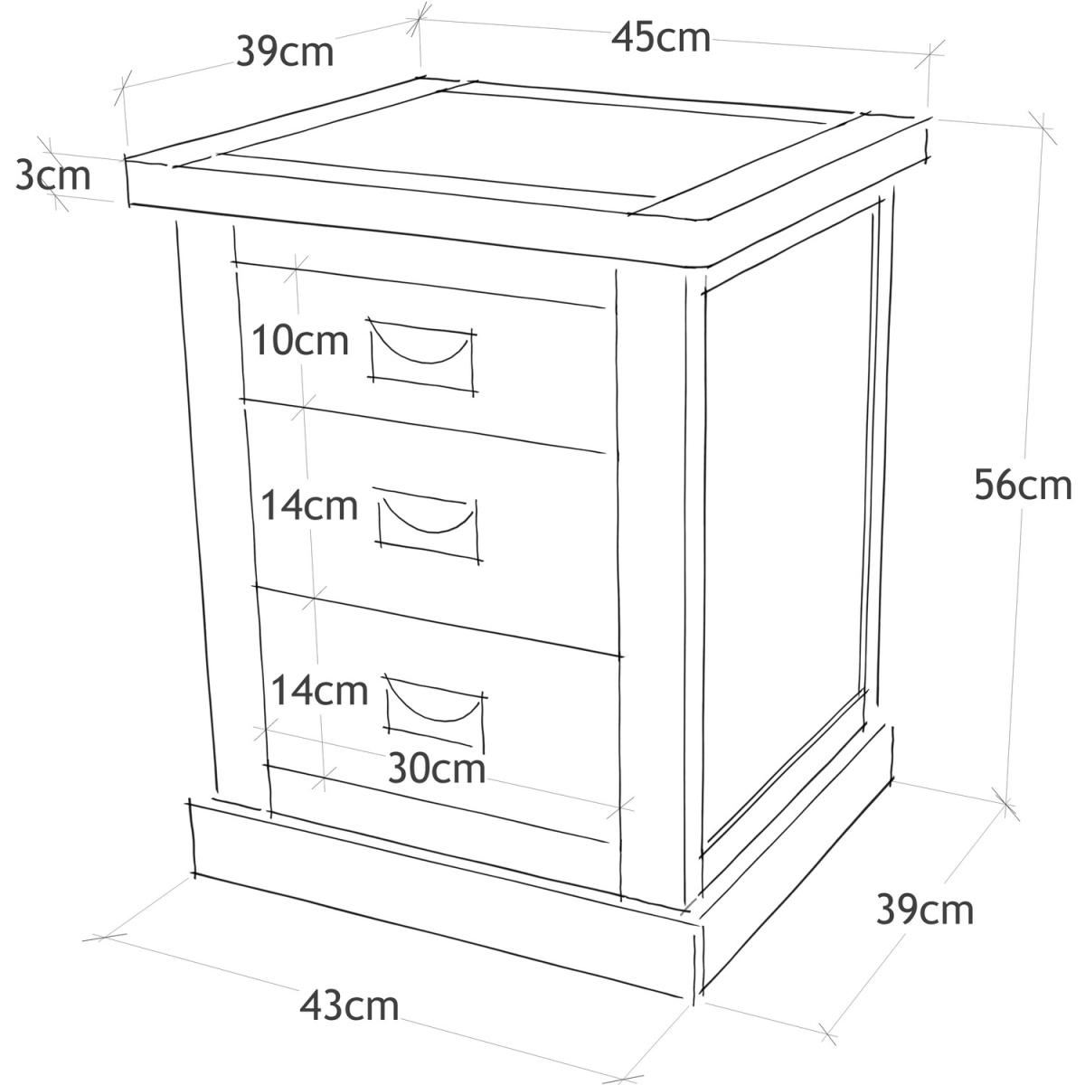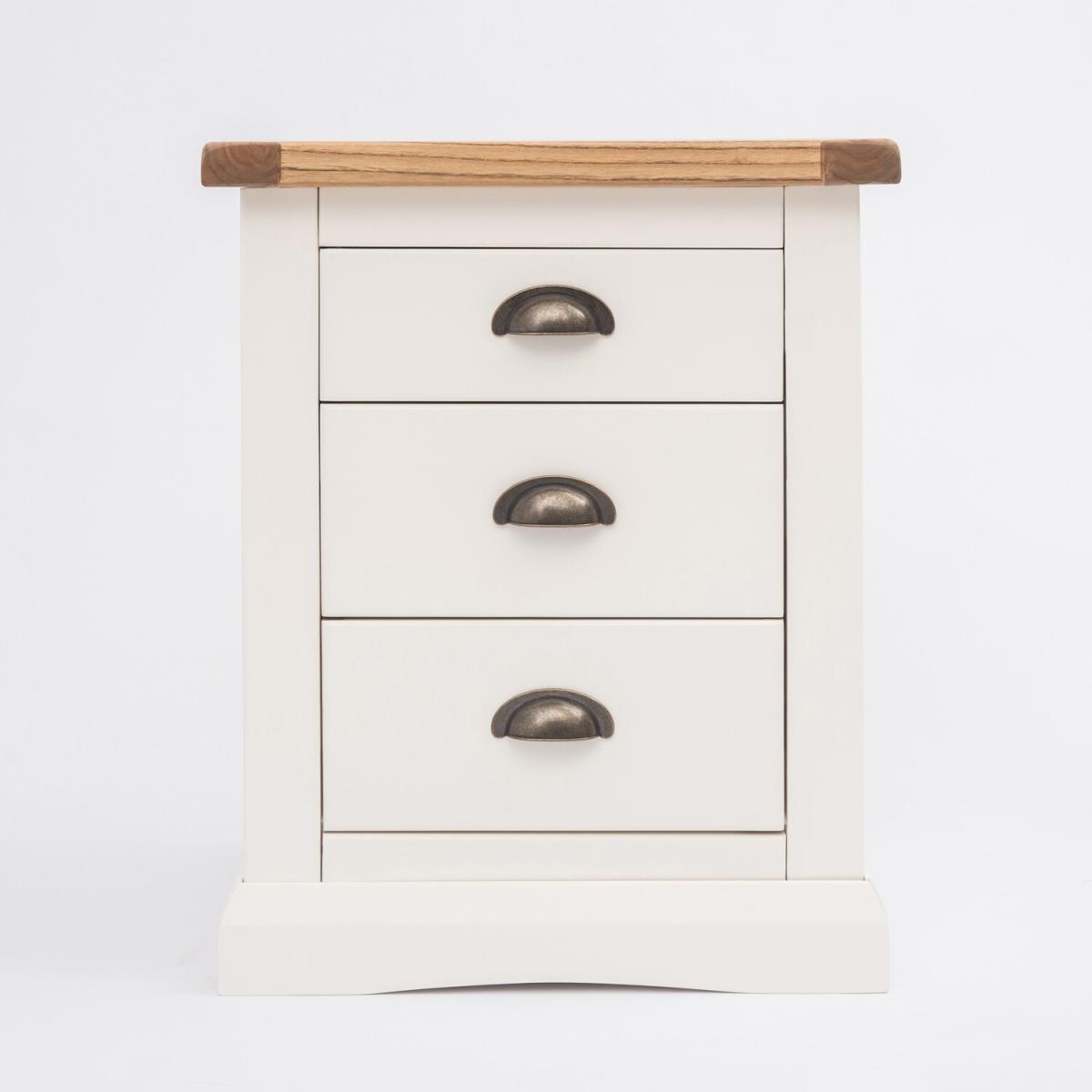 Our Cosenza collection has a simple but pleasing design and is produced by our skilled craftsmen to the highest standards using responsibly sourced wood and veneers. All tops are made using a combination of hardwood and ash veneer and are carefully hand-waxed giving them a great look. The body is finished with high-quality eco-friendly water-base paint in an off-white colour. A combination of drawer sizes means this 3-drawer bedside allows for flexible storage. The top drawer is shallow and perfect to house your reading material, medication or jewellery. The two drawers below are deeper and ideal for storing underwear or accessories. These attributes combined with a simple construction for easy assembly make it a great value product to be taken home today.