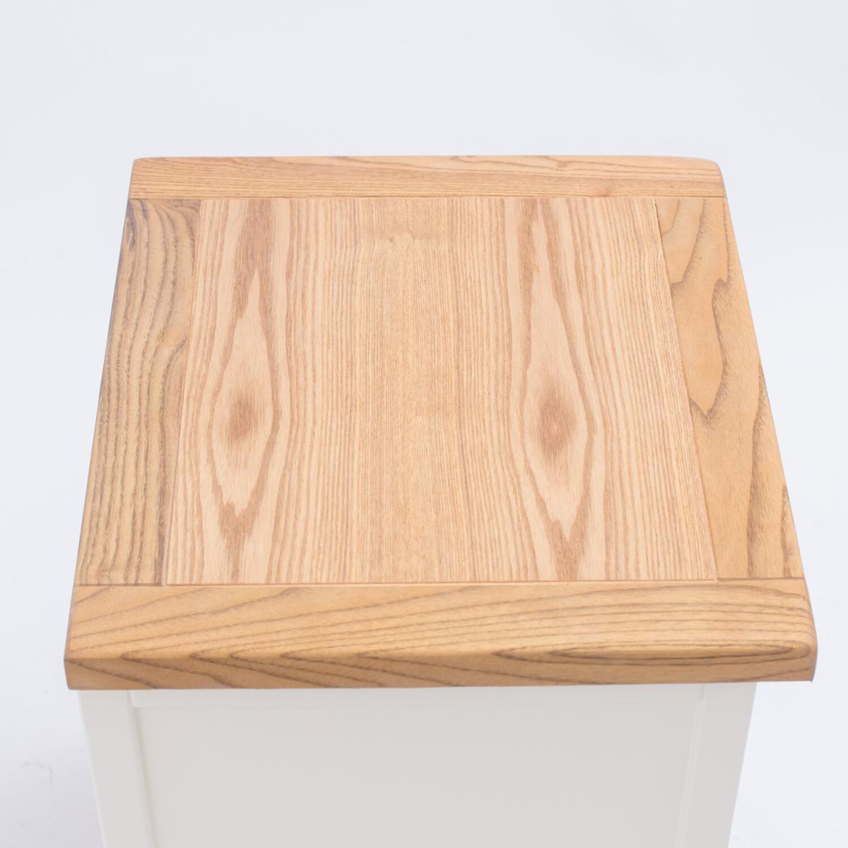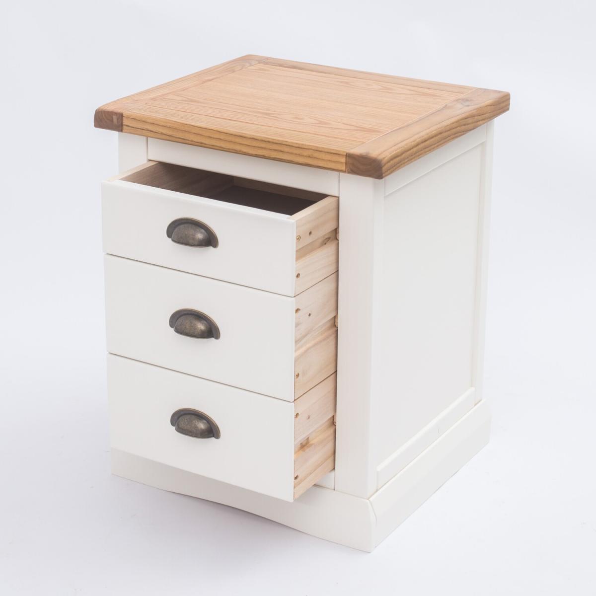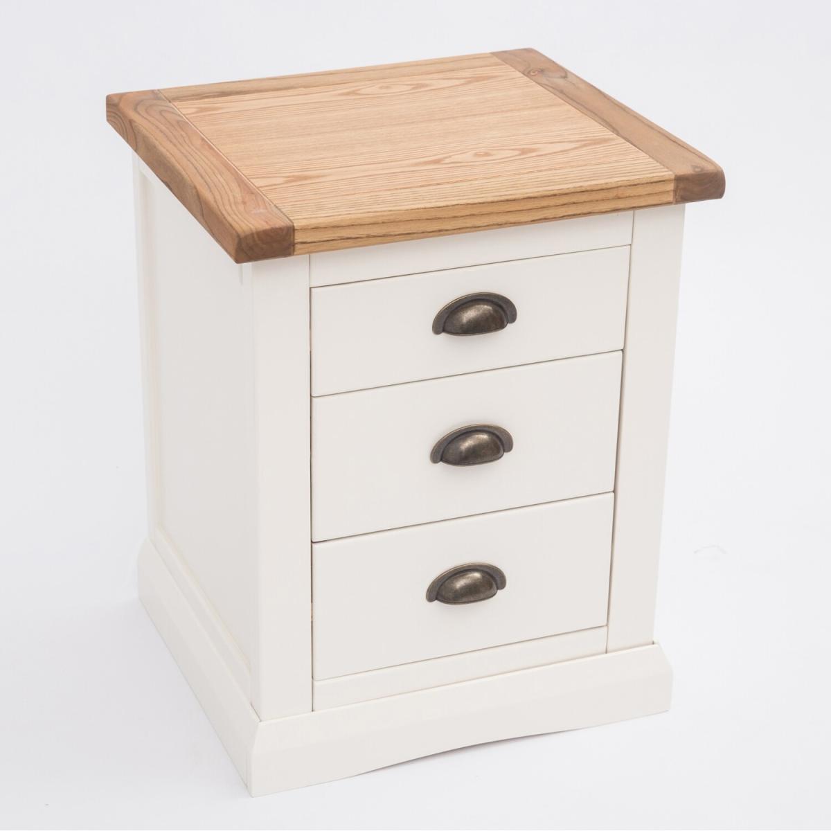 Our Cosenza collection has a simple but pleasing design and is produced by our skilled craftsmen to the highest standards using responsibly sourced wood and veneers. All tops are made using a combination of hardwood and ash veneer and are carefully hand-waxed giving them a great look. The body is finished with high-quality eco-friendly water-base paint in an off-white colour. A combination of drawer sizes means this 3-drawer bedside allows for flexible storage. The top drawer is shallow and perfect to house your reading material, medication or jewellery. The two drawers below are deeper and ideal for storing underwear or accessories. These attributes combined with a simple construction for easy assembly make it a great value product to be taken home today.