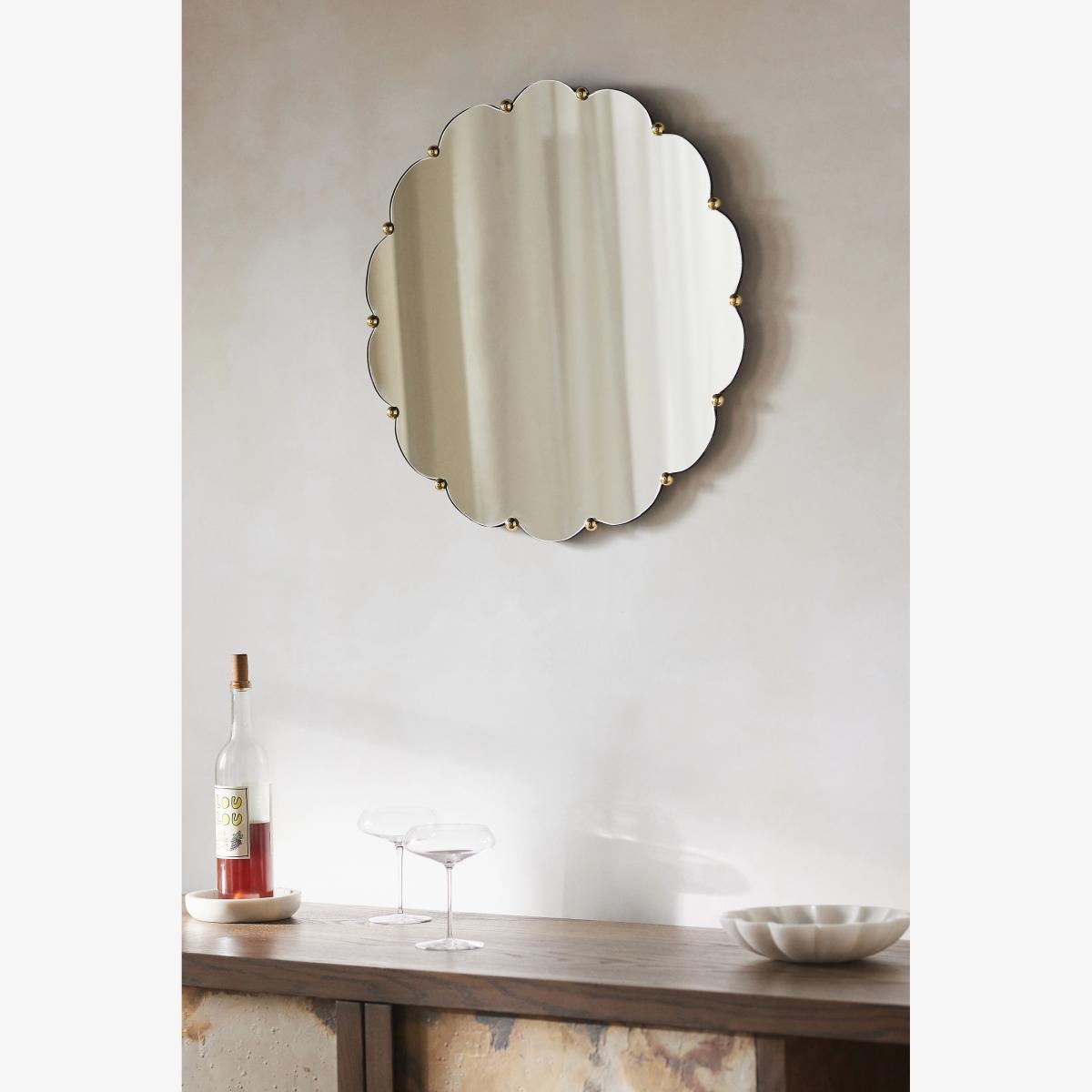 Elegantly scalloped, this wall mirror adds sweet whimsy to your space. * Brass, stainless steel, mirrored glass * Hanging hardware included * Imported