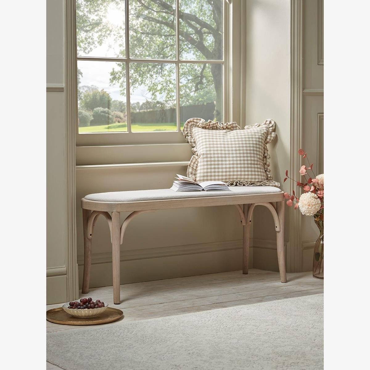 A simple bentwood frame bench in oak with a gentle lozenge shaped seat upholstered in linen.  This versatile and elegant piece makes an ideal seating option whether set alongside the dining table or placed at the foot of the bed.
