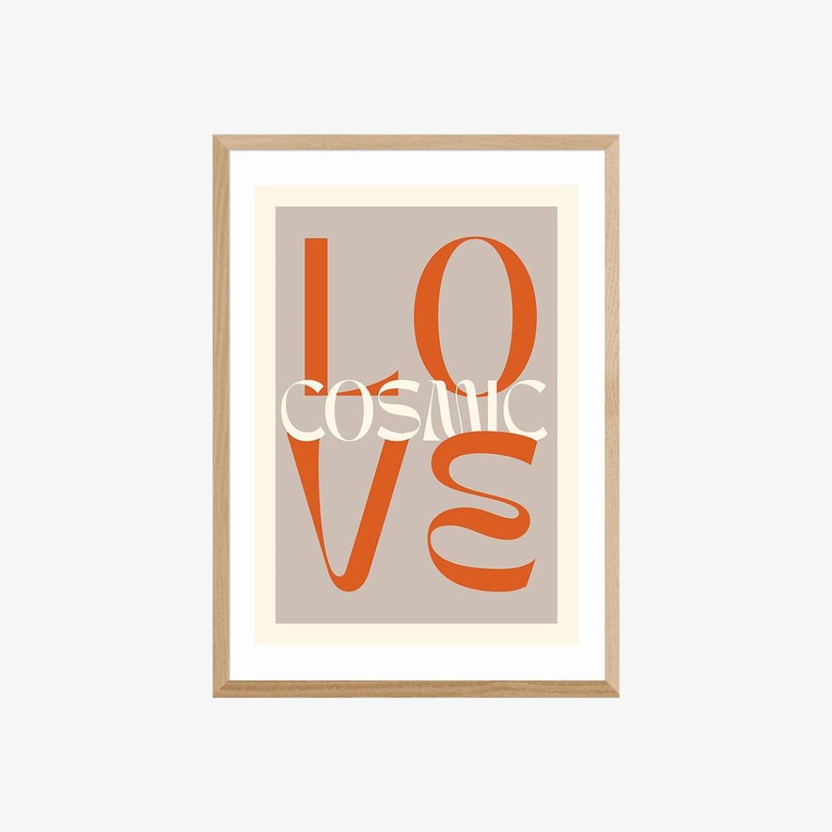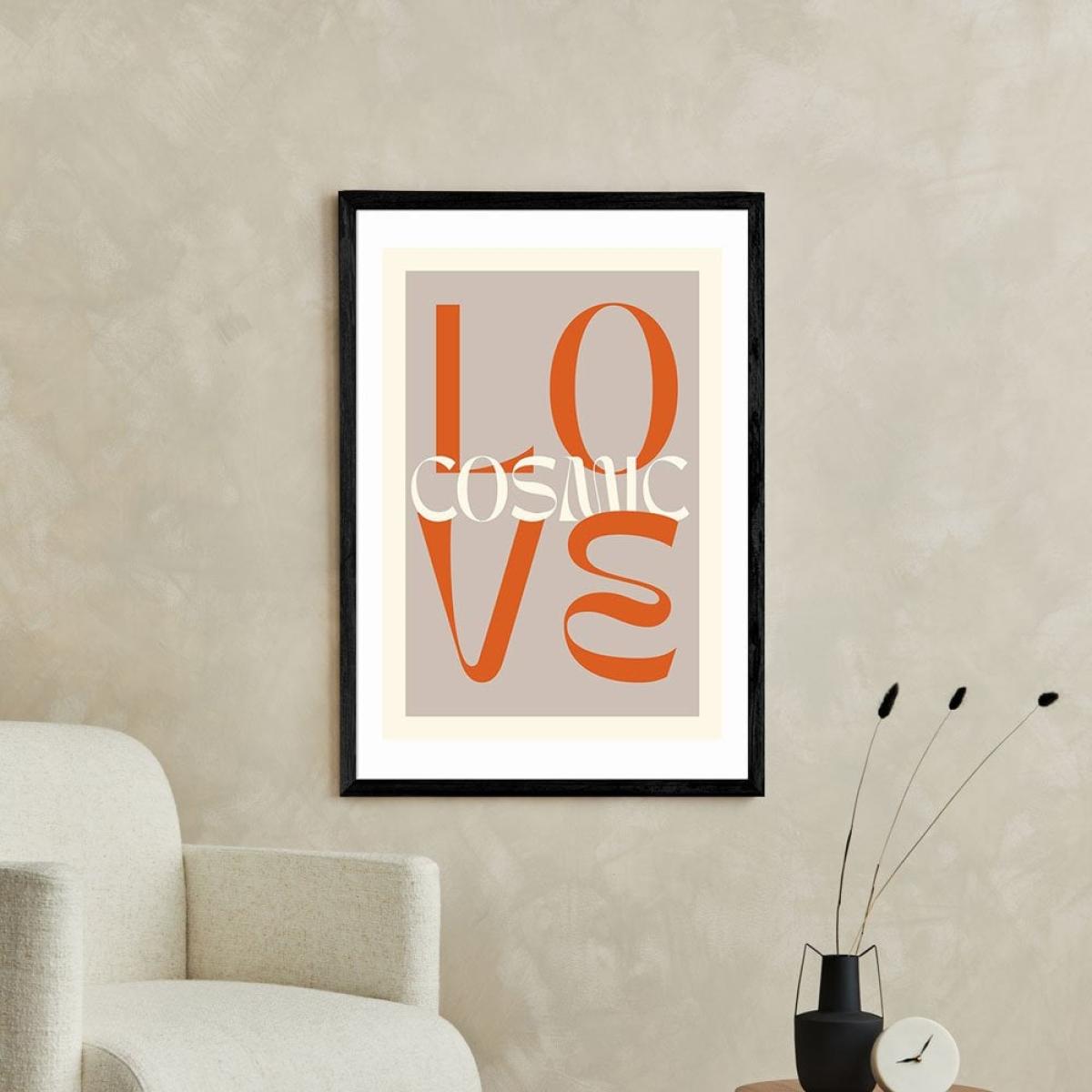 The Cosmic Love playful typography design will add a touch of elegance to your home. The orange typography pops out of the frame to give some retro flair to your interiors while the taupe background will keep it neutral for a perfect match to any room. Only giclée printing processes are used for this print resulting in the highest quality museum-level colours and sharpness. Choose between a number of different coloured frames and three sizes for the perfect print for your space.