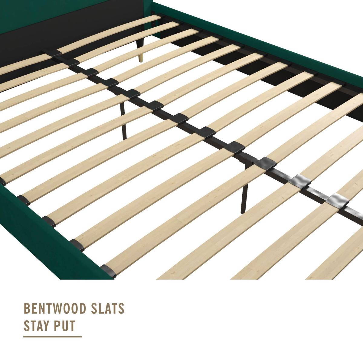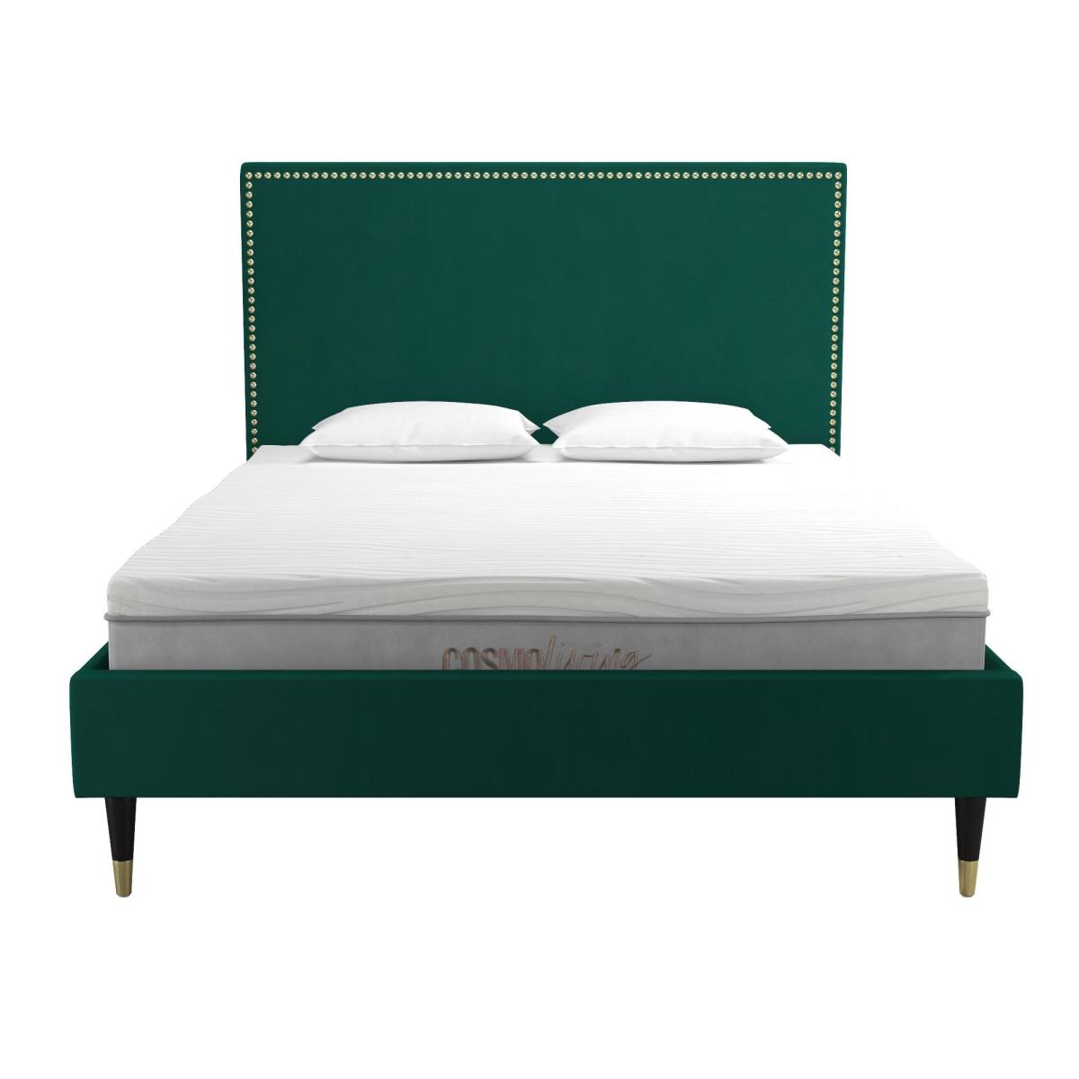 * Stunning velvet upholstery in a choice of colours* Gold coloured studded headboard border* Gold coloured dipped black legs* Sprung slat base The Cosmo Living Audrey Upholstered Bed will bring a touch of stunning opulence to any bedroom space. Bring out your glam side with the gold headboard nail head trim and black, gold-coloured dipped solid wood legs. What’s even better, the bed frame is fully upholstered in velvet and is offered in a choice of rich colour options, perfect for transforming your room. The sturdy wood frame also includes a bentwood slat system for optimal support.