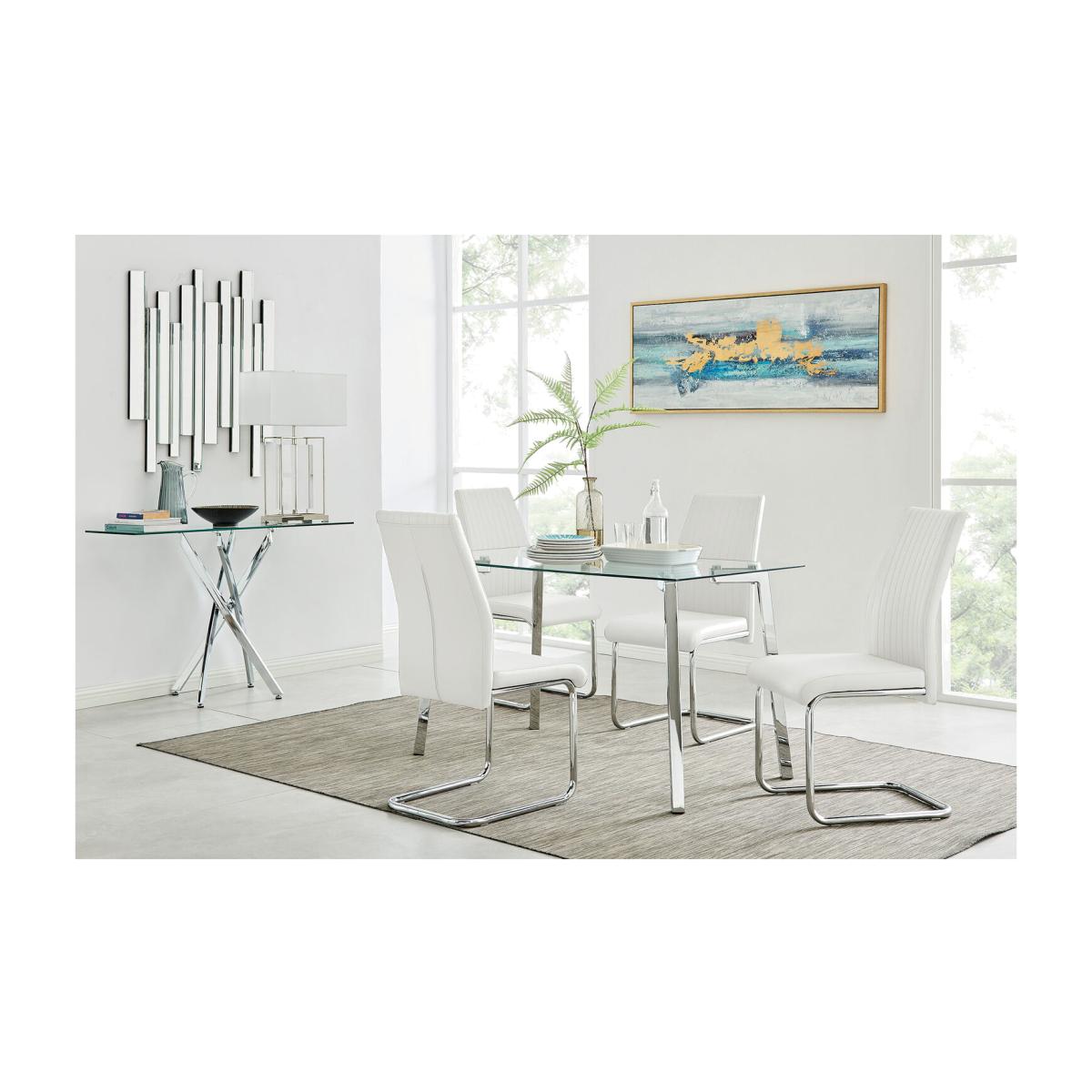 This Cosmo dining table is a simplistic yet stylish combination of chrome metal and glass. It has a light open look, giving it a bright, spacious feel to your dining space. The chrome metal legs provide a sleek flourish, making this table the perfect centrepiece for your dining space. The glass table top is made from great quality 8mm thick tempered safety glass, making the table sturdy, durable, and hard-wearing. From mealtimes to doubling as a workspace when needed, the Cosmo glass and chrome table is built for modern life and a solid long term investment for your home. Acting as the hub of the home, the spacious 130x75cm top allows plenty of room to gather with family and friends to share food and quality time. Add a Cosmo glass and chrome dining table to your basket, and transform your dining room with a statement table that blends function and style. The stylish, curved chrome leg and stitched leather combination gives this chair a contemporary edge, whilst it's simple design allows for practical everyday usage. The Lorenzo chairs are made from high quality, soft touch faux leather and are ergonomically designed for maximum comfort and support. Featuring a deep foam seat cushion these chairs are a delight to sit on and the plastic feet protect the floor from any damage! At a truly unbeatable price add some class to your dining room with these Lorenzo dining chairs!