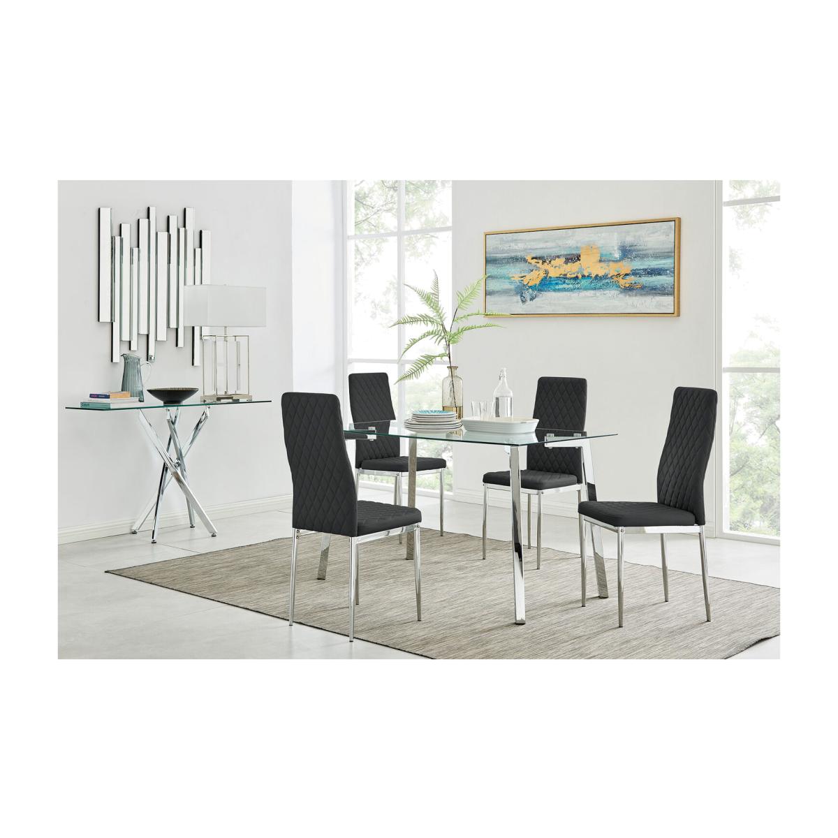 This Cosmo dining table is a simplistic yet stylish combination of chrome metal and glass. It has a light open look, giving it a bright, spacious feel to your dining space. The chrome metal legs provide a sleek flourish, making this table the perfect centrepiece for your dining space. The glass table top is made from great quality 8mm thick tempered safety glass, making the table sturdy, durable, and hard-wearing. From mealtimes to doubling as a workspace when needed, the Cosmo glass and chrome table is built for modern life and a solid long term investment for your home. Acting as the hub of the home, the spacious 130x75cm top allows plenty of room to gather with family and friends to share food and quality time. Add a Cosmo glass and chrome dining table to your basket, and transform your dining room with a statement table that blends function and style. Upholstered in soft faux leather and finished with diamond pattern stitching the Milan dining chairs would seamlessly fit in with most dining spaces, whilst not compromising on either style or comfort. The stylish chrome leg and hatched leather combination gives this chair a contemporary edge, whilst it's simple design allows for practical everyday usage. The chairs are made from high quality faux leather and are ergonomically designed for maximum comfort and support. They feature soft touch faux leather with a deep foam seat cushion and plastic feet to protect the floor from any damage! At an unbeatable price you cannot go wrong with these chairs!