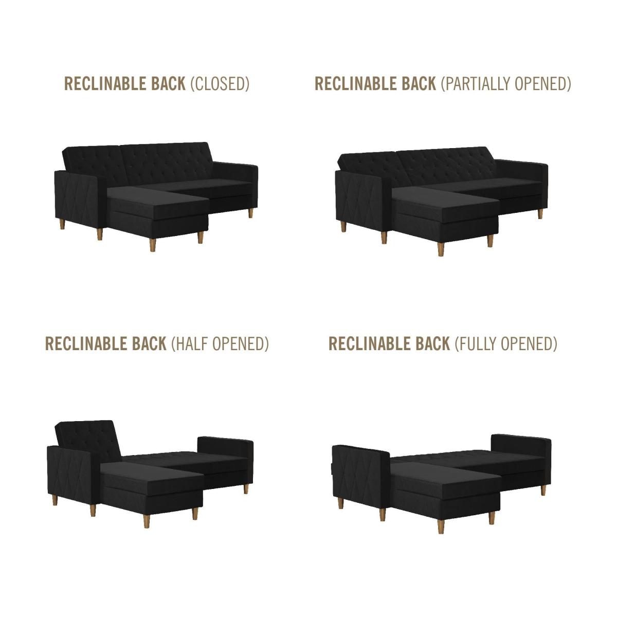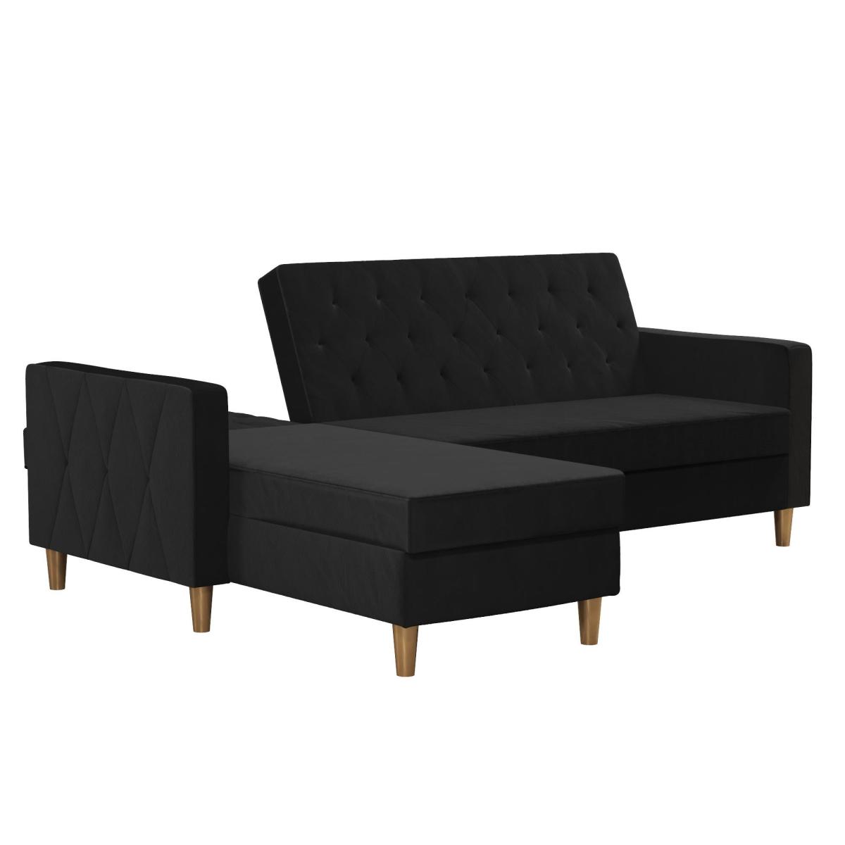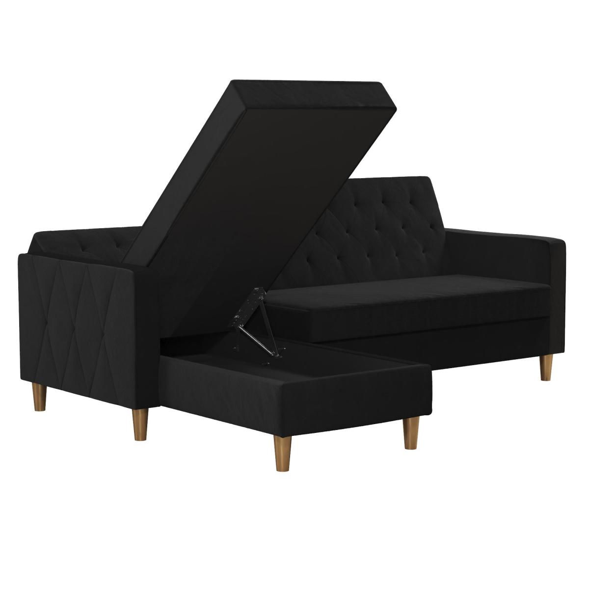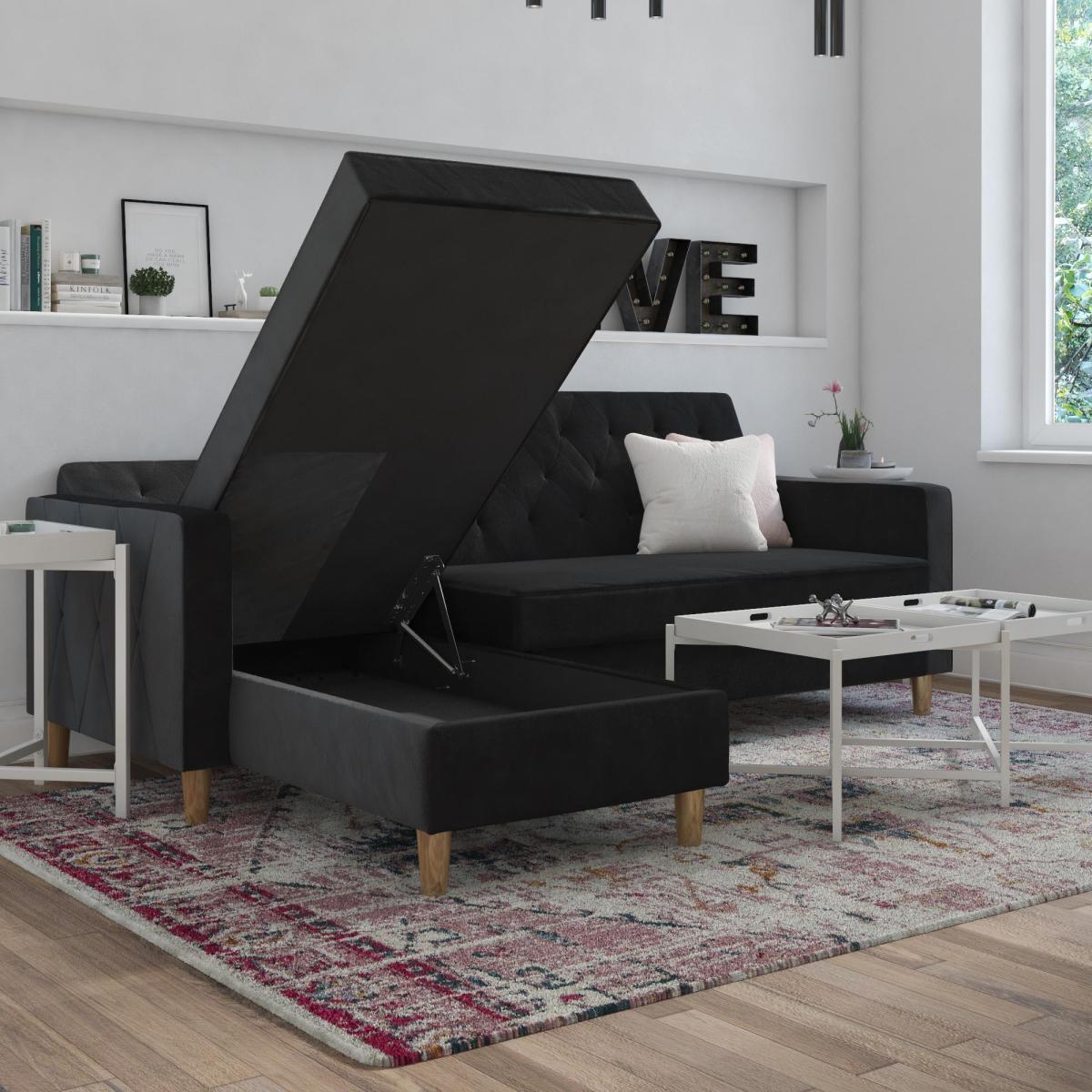 The Cosmo. Living Liberty Sectional Sofabed is simple, stylish and the perfect small space solution with its compact design and functional features. Available in a choice of colours, this sofa bed features soft velvet upholstery and a glamorous buttoned backrest, and can easily be folded down to create a sleeping space for overnight guests. The corner chaise section also opens up to reveal a handy storage space, perfect for guest bedding or spare blankets. Please note: The foot stool can be moved to change the sofa from left to right orientation!.