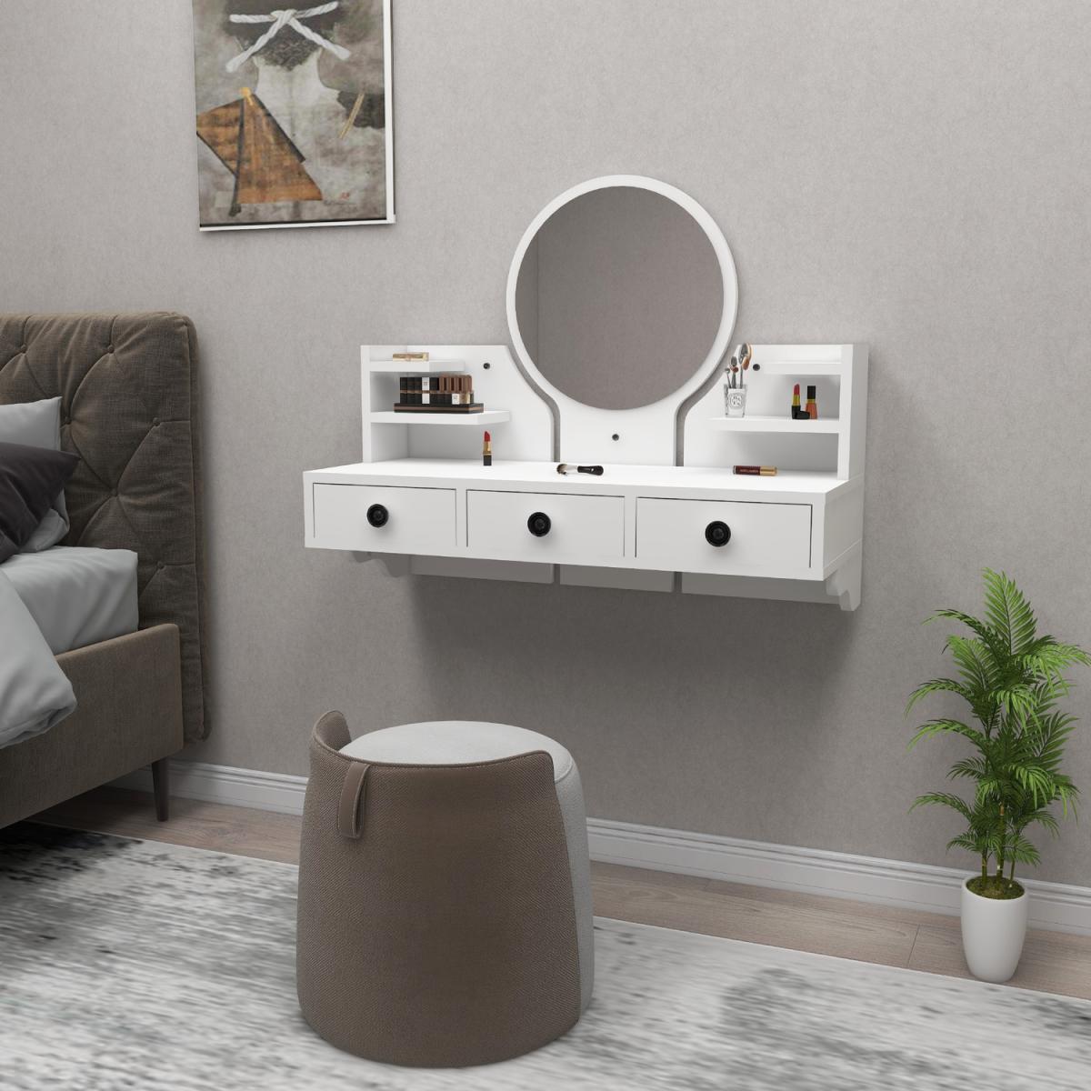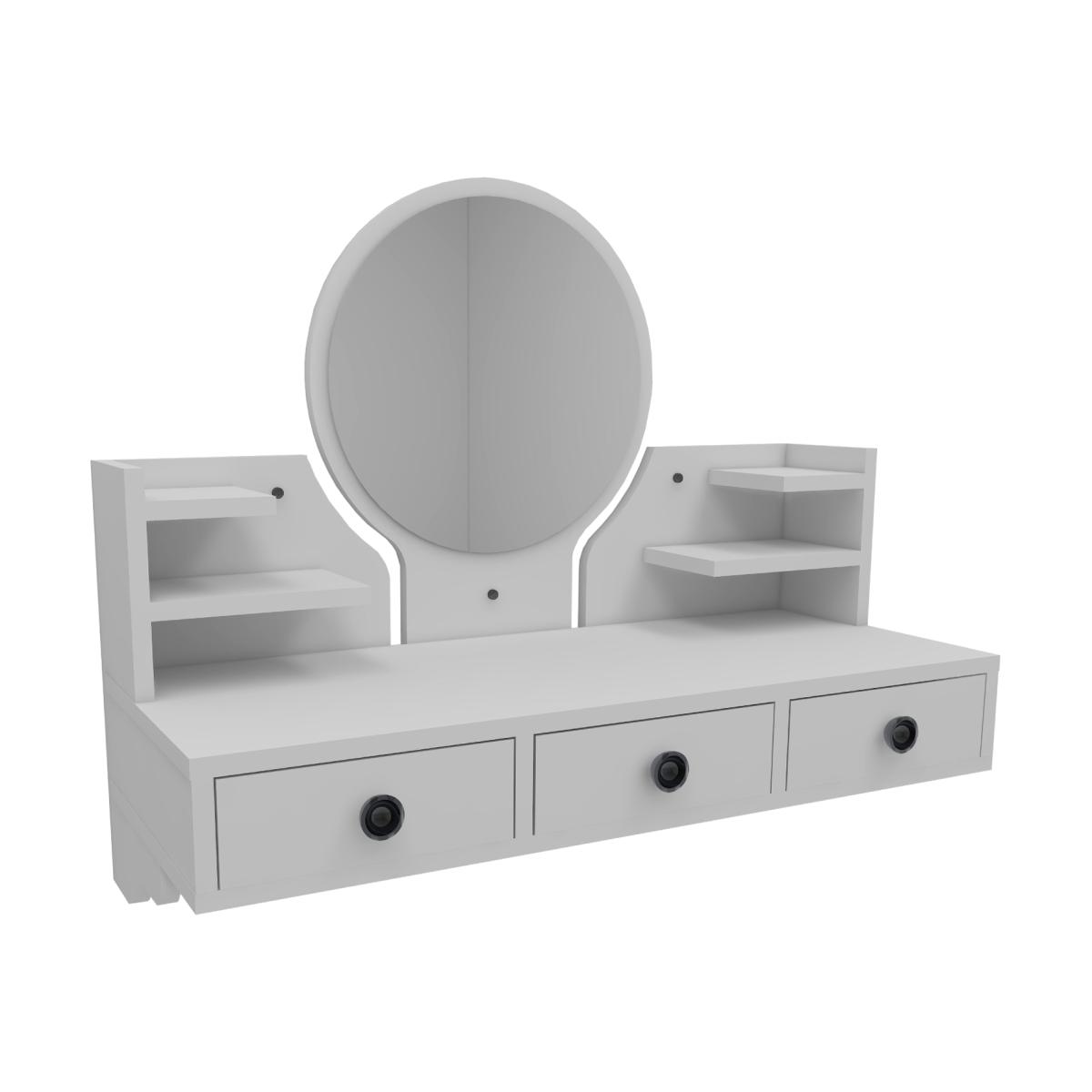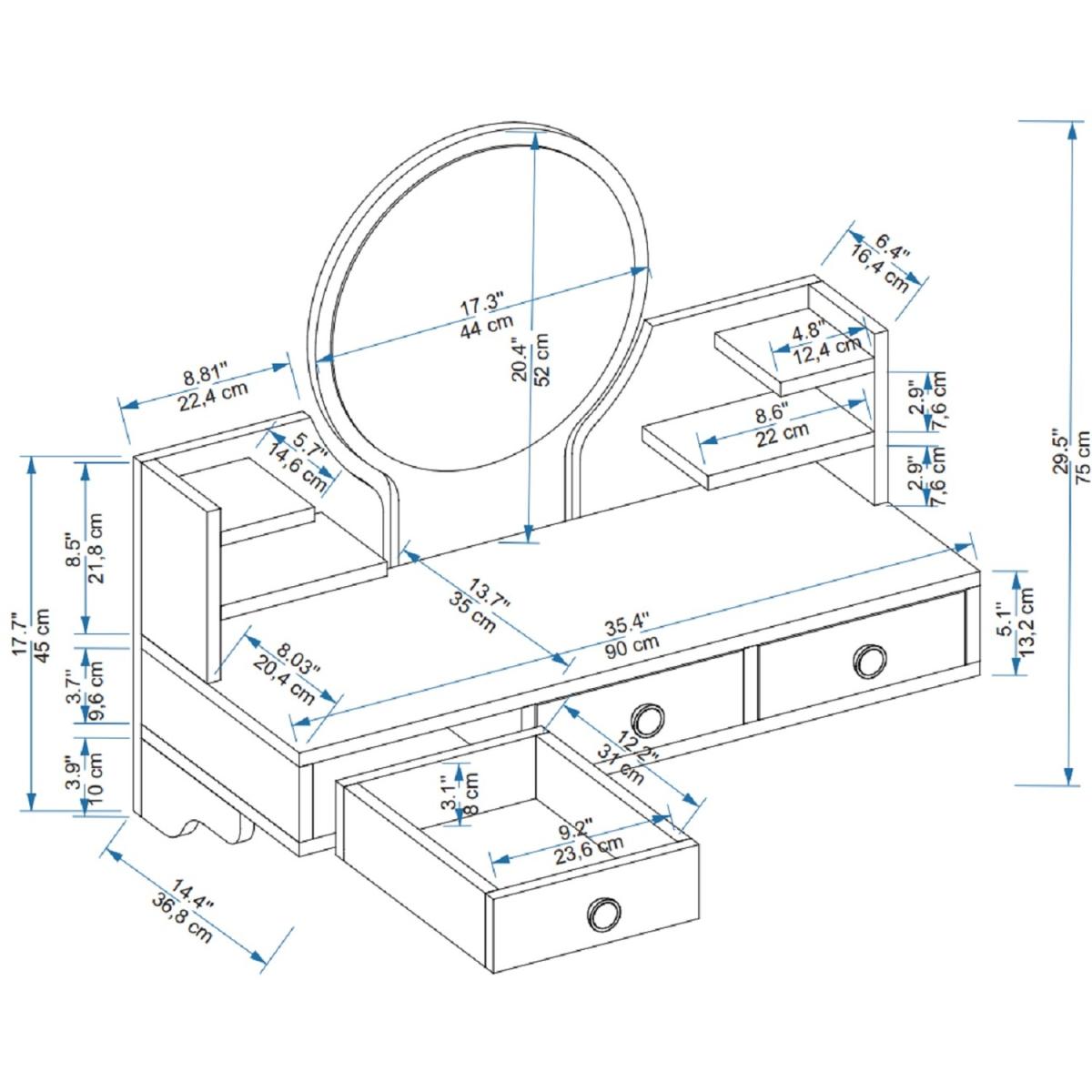 MATERIAL The makeup table is made of an 18 mm thick quality melamine-coated particleboard. The manufactured wood surface is water-resistant to some extent and the edges are banded with PVC edge banding tape. First-class assemblyinstallation hardware and accessories are used. Our products are produced from certified raw materials that do not contain carcinogenic substances and comply with European Union health norms. CLEANING You can clean your furniture with a dry cloth. Avoid prolonged contact of your product with moisture and water. ASSEMBLY The product will be delivered to the customer in the original package as disassembled. It is designed to be assembled by the customer using a power drill and screwdriver. Assembly instructions and installation hardware are included in the box. Product parts are numbered with stickers per the assembly guide for fast and error-free installation.