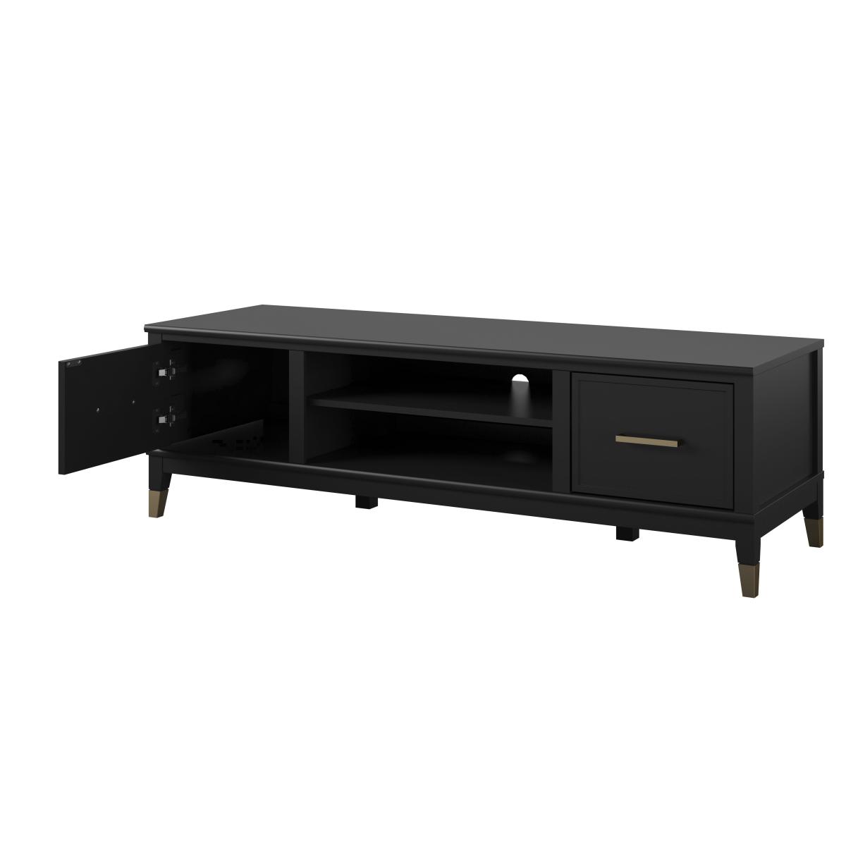 Make a statement with the Cosmo. Living Westerleigh TV Stand. Available in crisp white, graphite gray, or matte black, this TV stand is accentuated by trendy gold hardware. Featuring two doors and a fixed center shelf, it offers convenient storage for your top-notch equipment. Made with sturdy wooden construction, it can hold TVs weighing up to 120 lbs and up to 65" wide. Say goodbye to clutter and unwind in style after a long day.