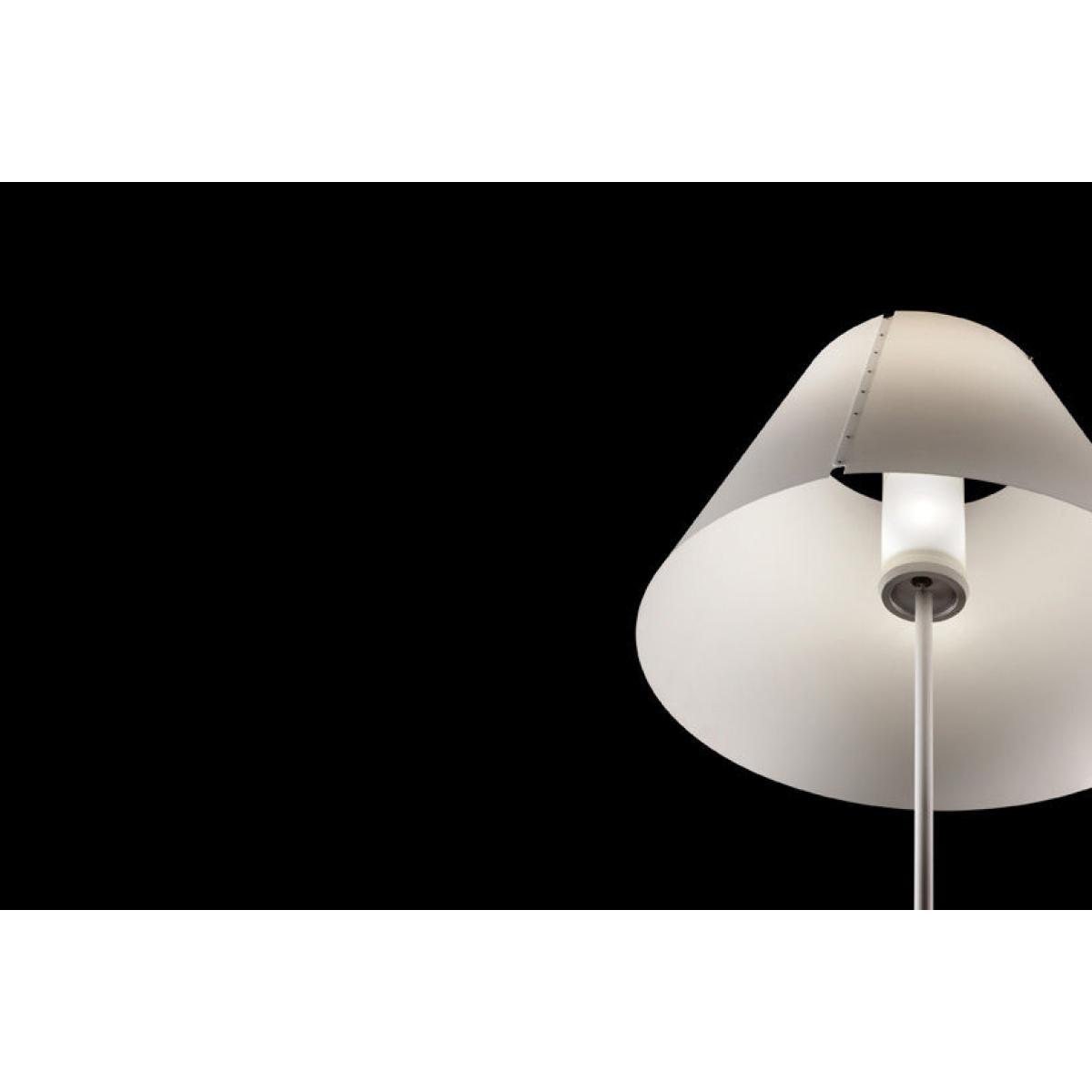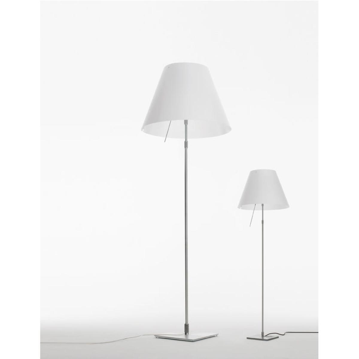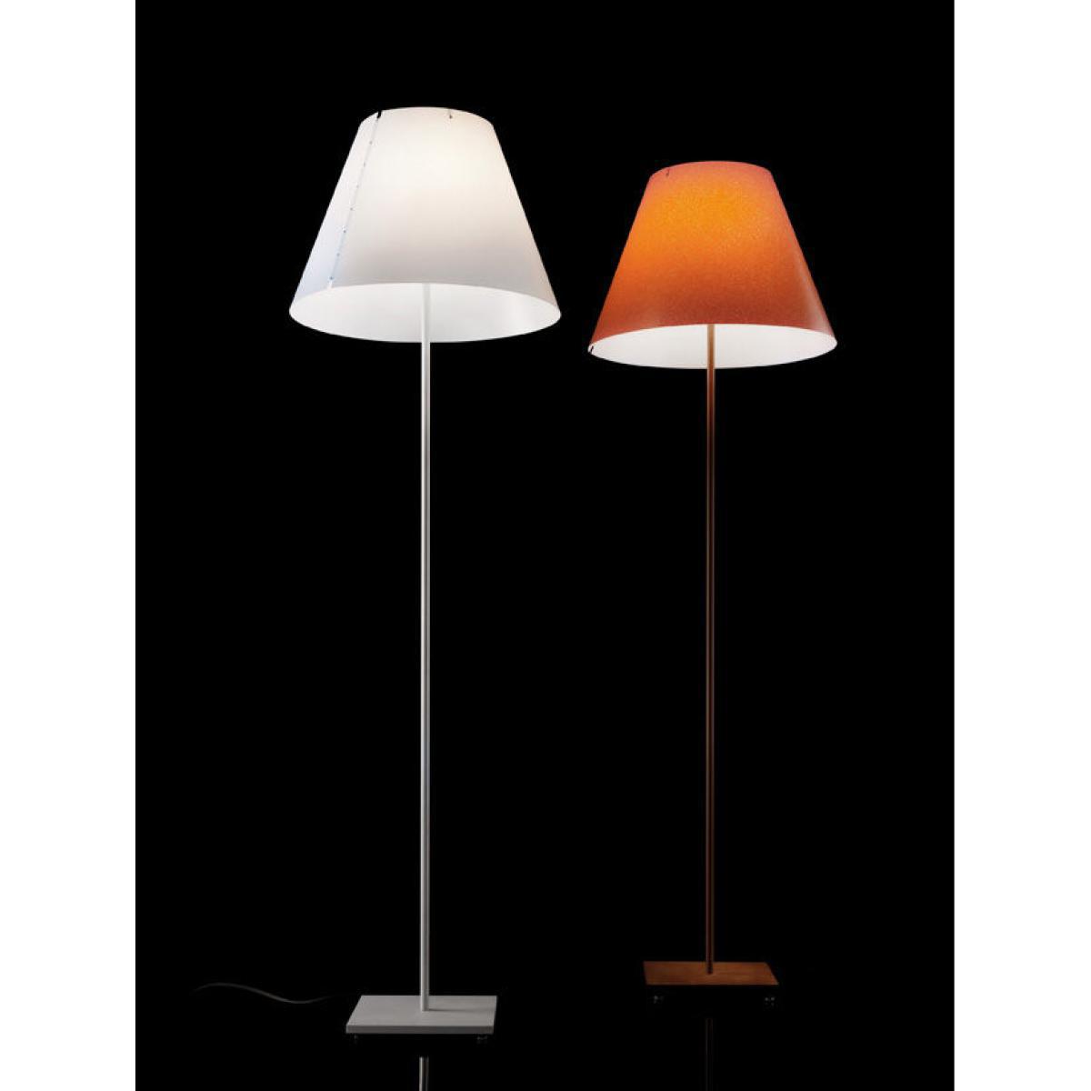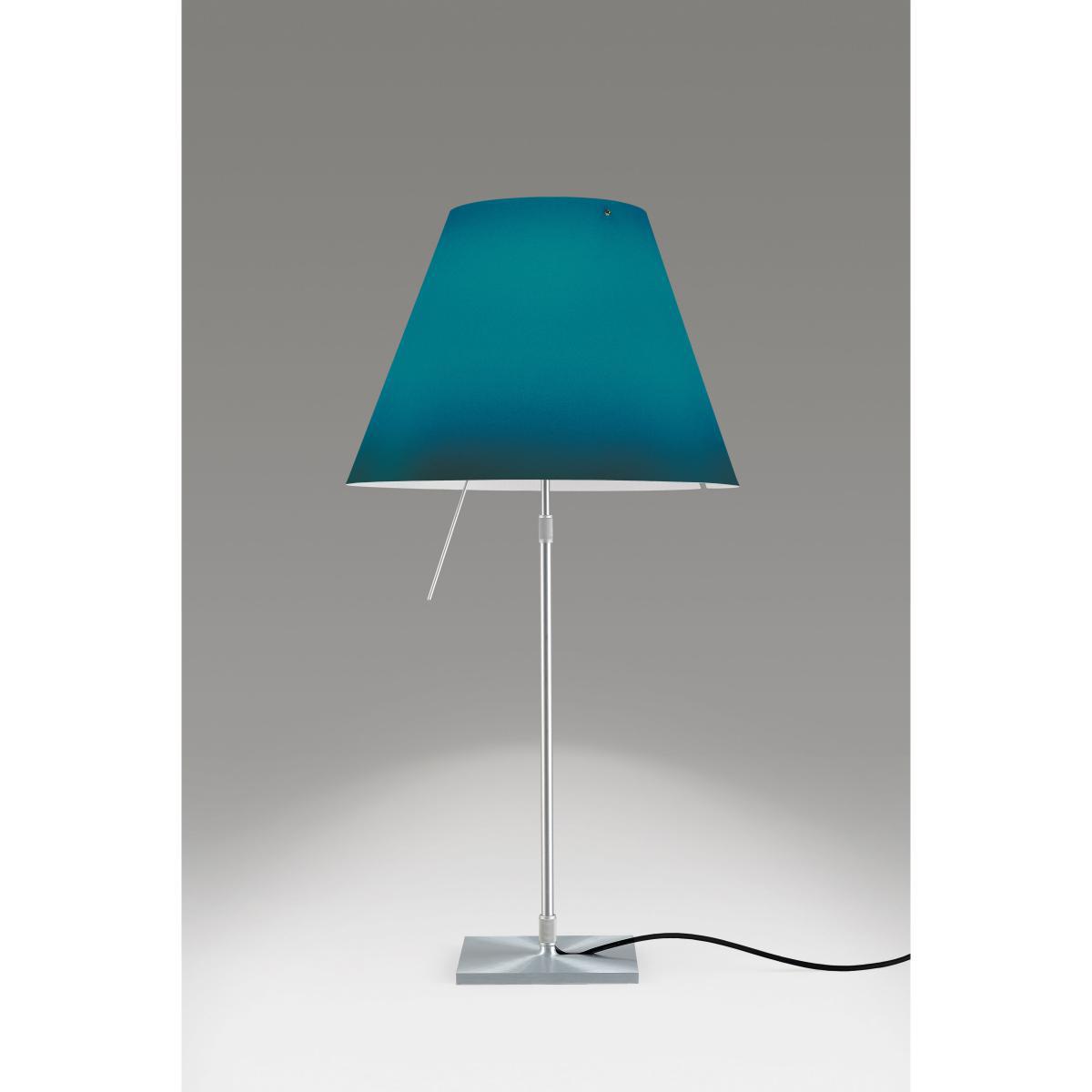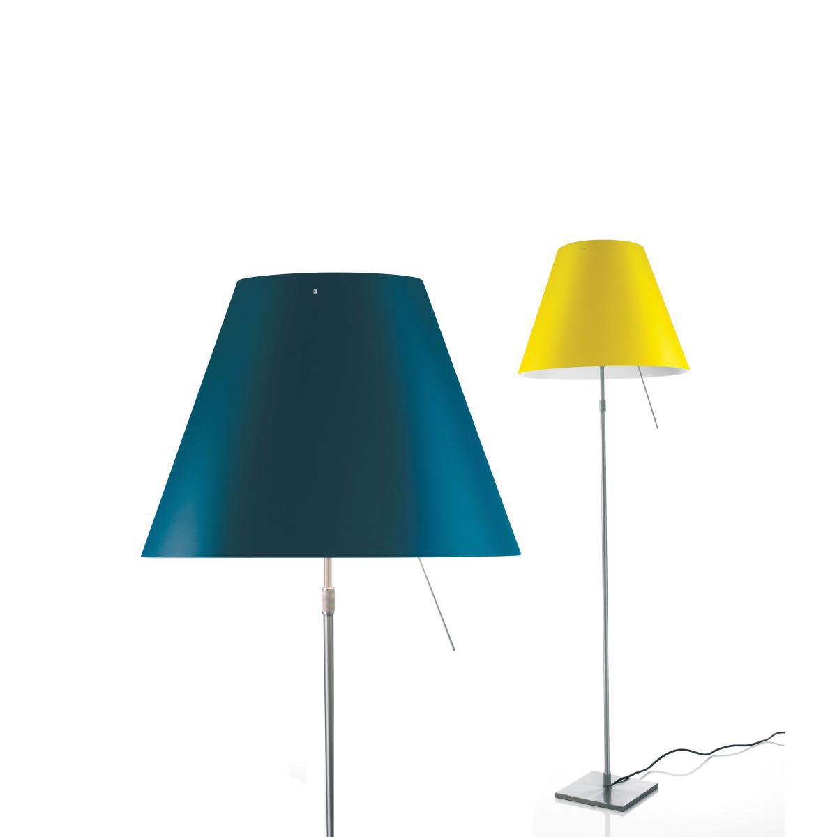 In Costanza ''the switch has moved!'' The lamp uses a sensorial dimmer rod-switch close to the light, which only has to be lightly touched to adjust its on-off intensity through four levels of brightness. The light and washable shade, resting on two points of balance and therefore capable of oscillating if bumped, diffuses a warm and pleasant light. Its unmistakable, subtle but structurally solid profile fits naturally into any interior, thanks also to the telescopic rod that can be adjusted to different heights.