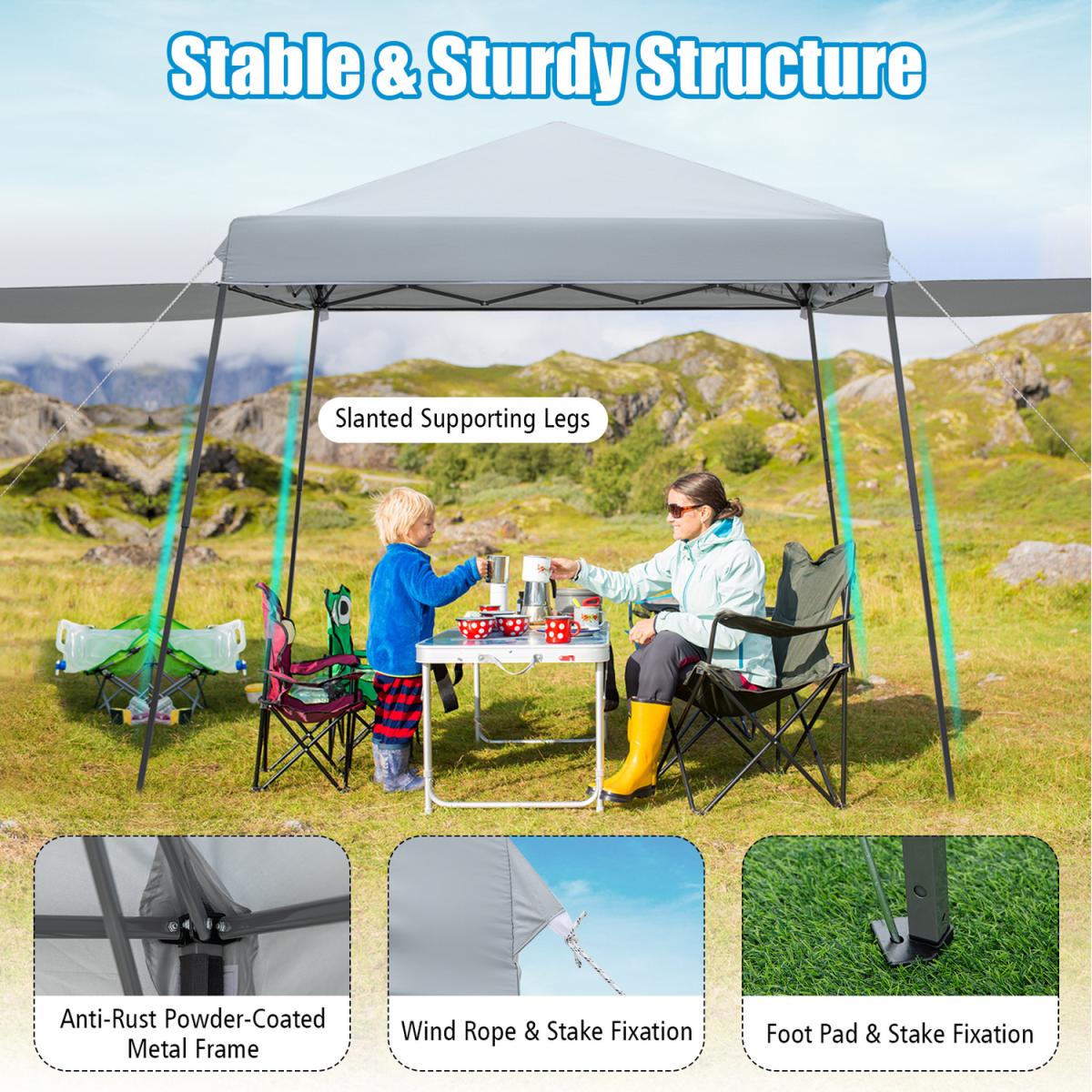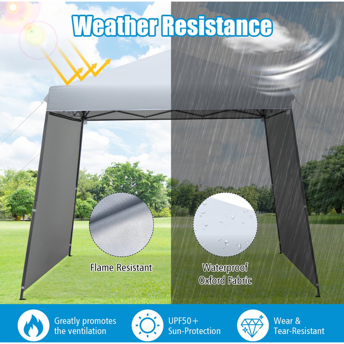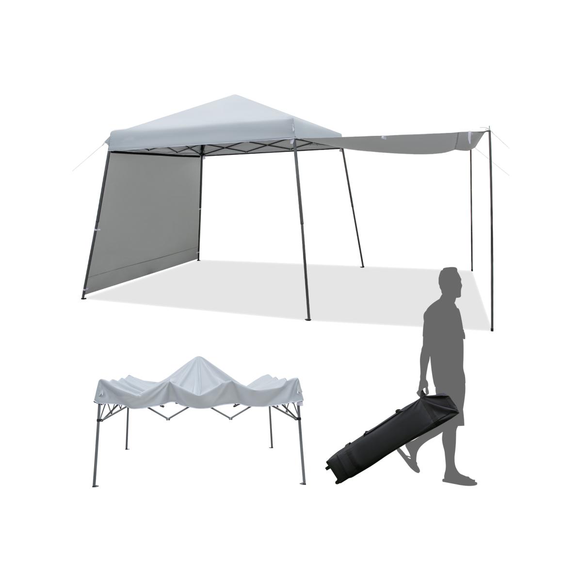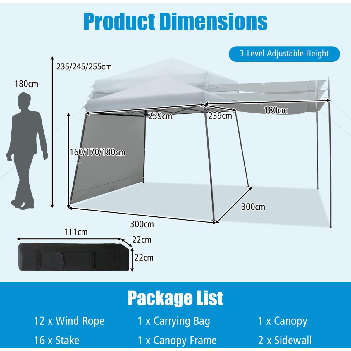 Provide a Cool & Comfy Shade Area for Enjoying Outdoor Leisure Time with Your Friends & Family!Our instant pop-up canopy with awnings measures 599 x 300 x 235-255 cm (L x W x H), providing a large outdoor shade area for enjoying picnics, BBQs, holding parties, outdoor activities, camping, commercial use, and more. And there exist 2 sidewalls for adding more shade. Furthermore, you can support 2 sidewalls with 4 supporting rods and fixed by wind ropes, therefore you can get 2 side awnings, providing additional shade or rain protection. Thanks to the central locking system, the pop-up canopy frame can be easily folded and unfolded in seconds, and it requires no tools. More than that, we also provide a roller bag to store the folding canopy when not in use, so you can easily transport it anywhere you want. Besides, the canopy is crafted with silver-coated Oxford fabric and the frame is constructed of rustproof powder-coated metal, providing better protection for your outdoor activities. And there comes with 3 heights for you to choose from, allowing you to enjoy the sunshade at different times.