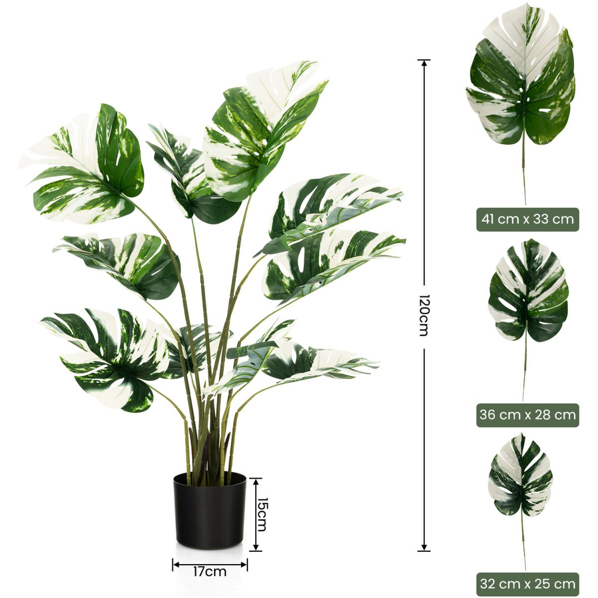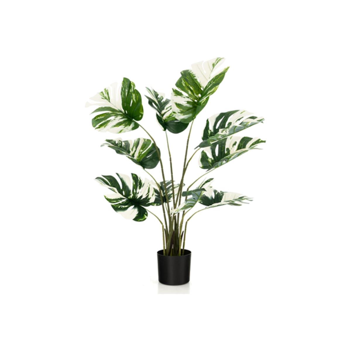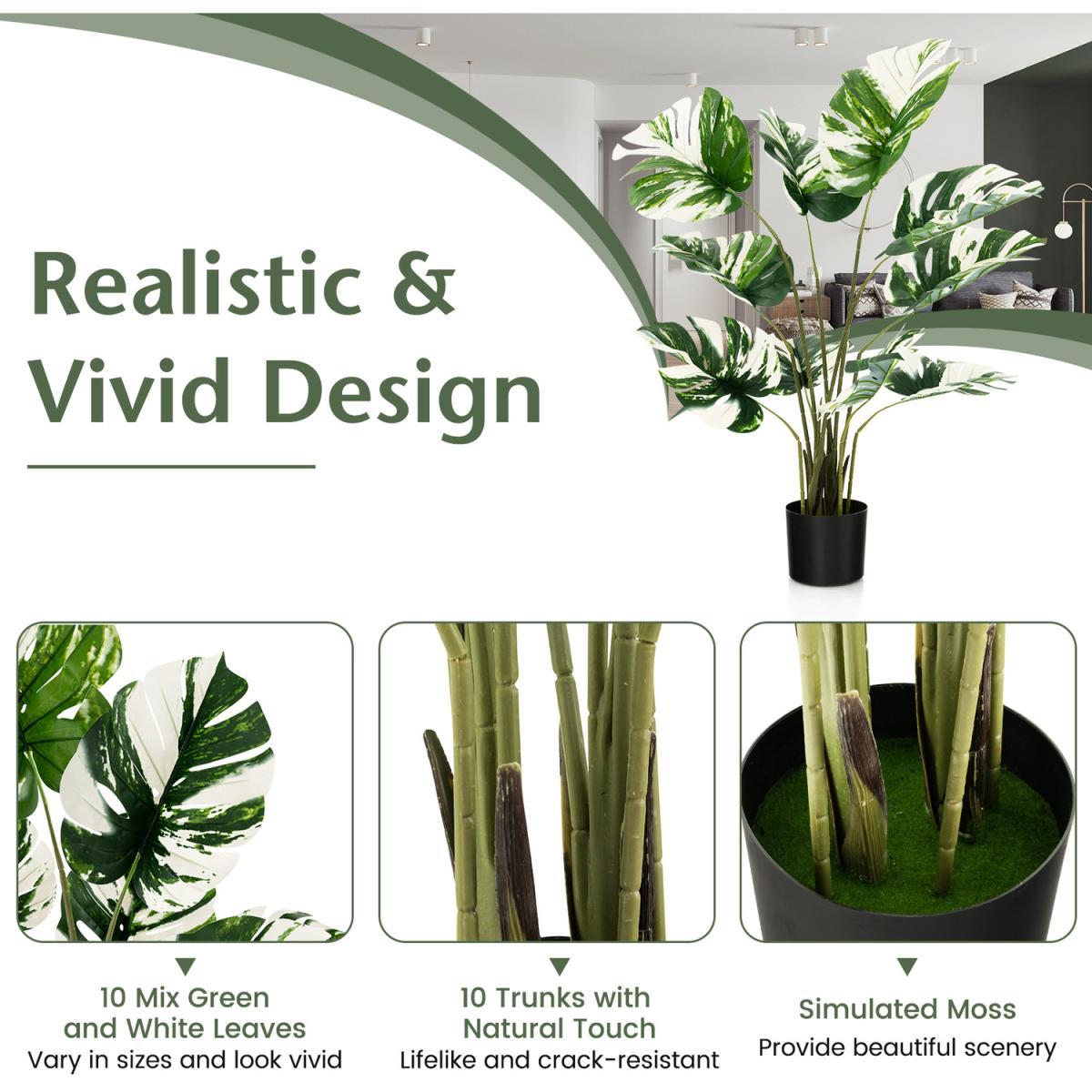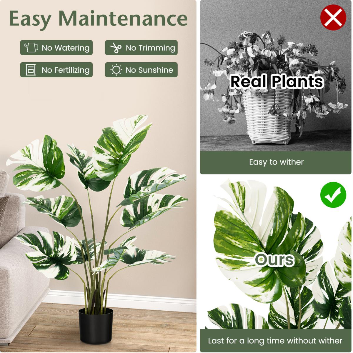 Light-up Your Home with our Evergreen Artificial Monstera Deliciosa Tree!Why choose our artificial tree? Taking care of real plants will be a trivial work. However, our simulated monstera deliciosa trees is no need of pruning, fertilizing, watering, which creates the vibrancy with easy maintenance! This fake monstera palm tree comes with 10 decorative split leaf and simulated moss looking really lifelike. What's more, the stems can be bent to different angles before display it to create different shapes, which is a perfect choice for DIY lovers! Besides, others use easy to crack and tip over flower pot and fragile stems that are not easy to keep straight shape, while we adopts metal wire strengthened stems and cement filled pot for excellent crack-resistance stability. Moreover, the evergreen faux tree is made of allergic-proof, no odour PEVA and PE for safe use. Due to the leaf are detachable, you just need to take out the leaves and insert them to the trunk to quickly get a natural decor for your home, office or other places!