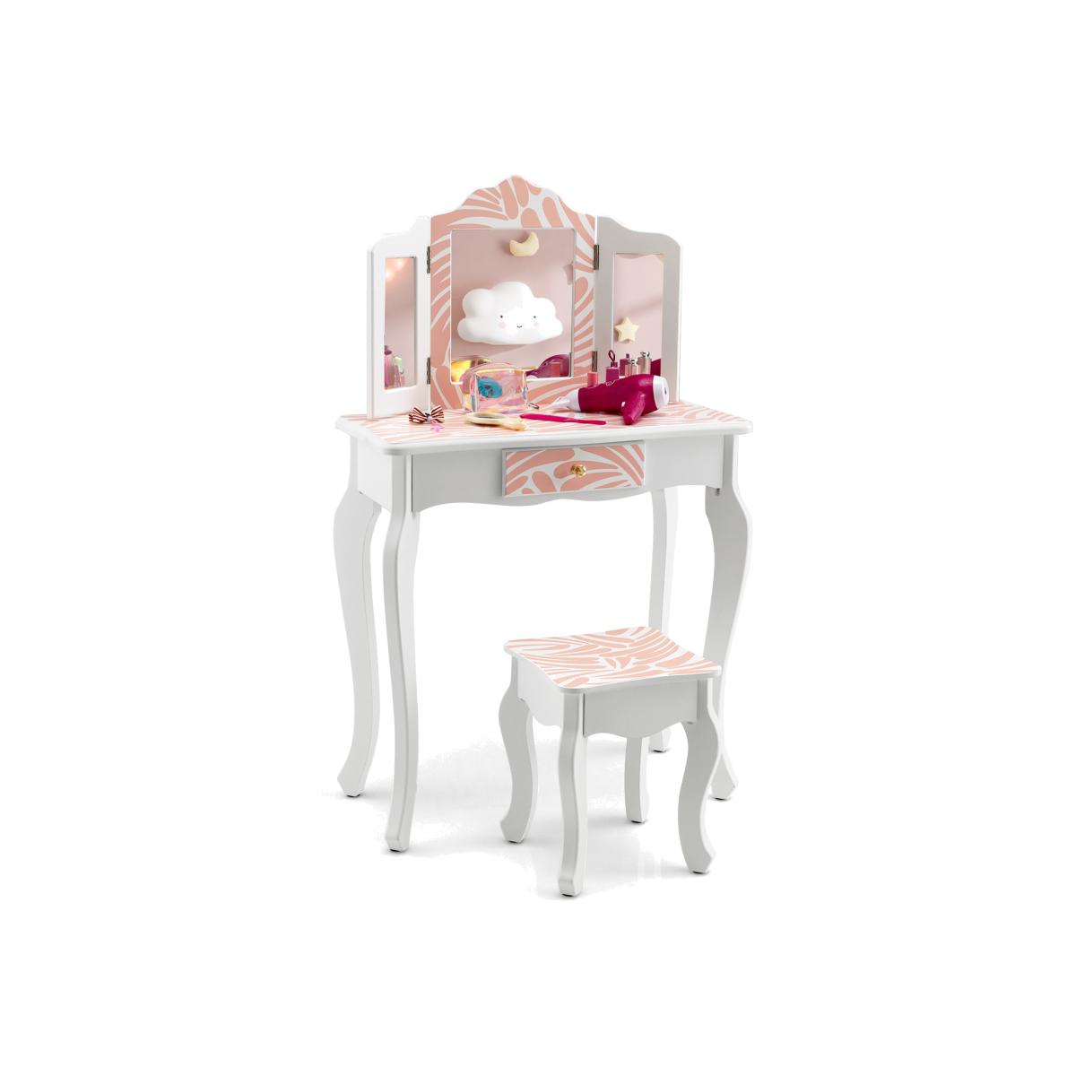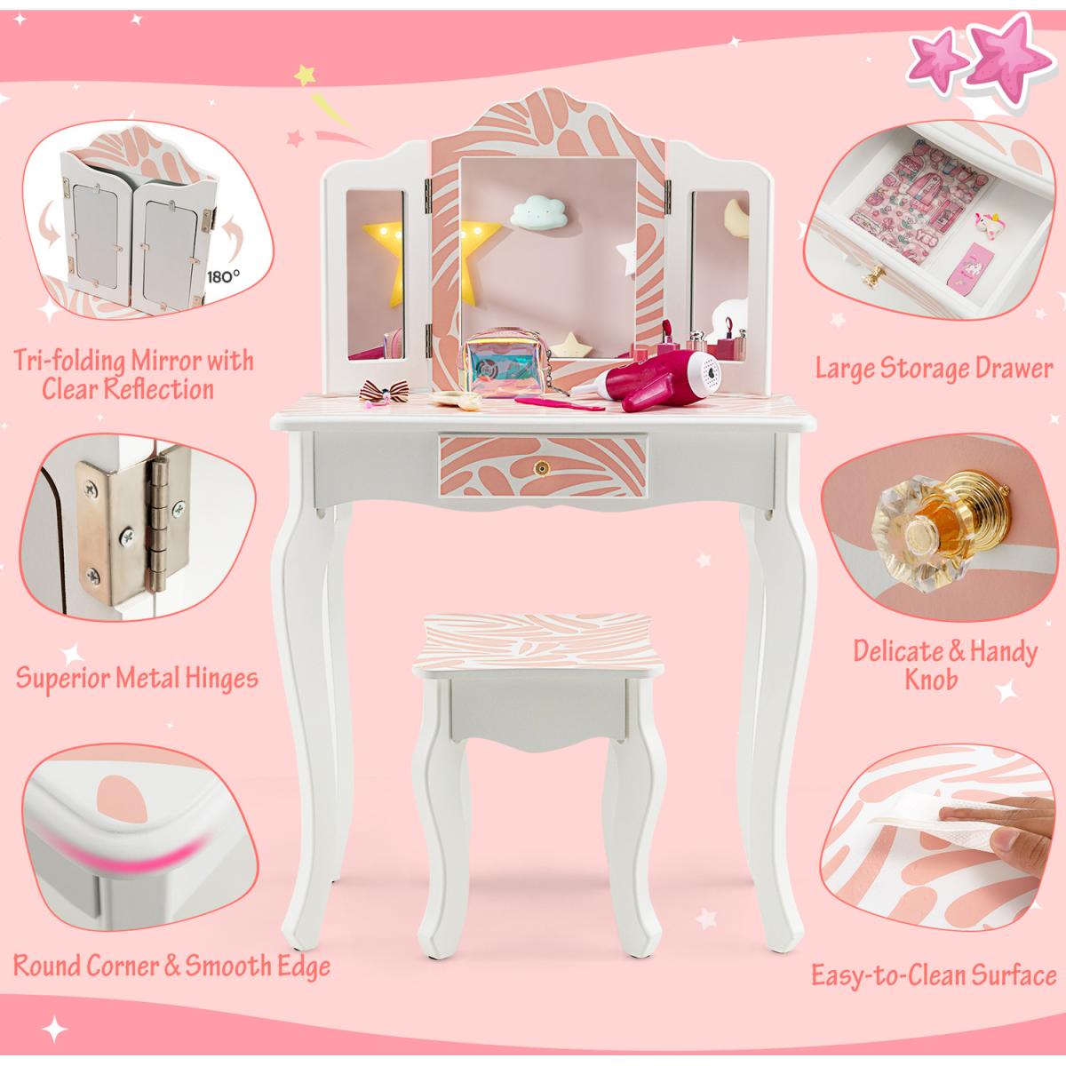 Our lovely vanity set with mirror and stool is a perfect gift for your little one! Featuring a pink and white design with cute zebra print, this makeup dressing table set can be an attractive addition to your kid's room or play area. The tri-folding mirror with clear reflection allows the child to adjust the angle flexibly to get a perfect reflection and make up better. What's more, the mirror is detachable, making the vanity table also suitable for kids to study or draw. The wide desktop and the large drawer provide ample storage space for kids' makeup, jewelry, toys or other items. Made of high quality MDF with non-toxic paint, this vanity set is sturdy and can be used for a long time. In addition, the curved legs with non-slip foot pads provide steady support and protect the floor from scratches. The rounded corner design and anti-toppling device ensure safe use.