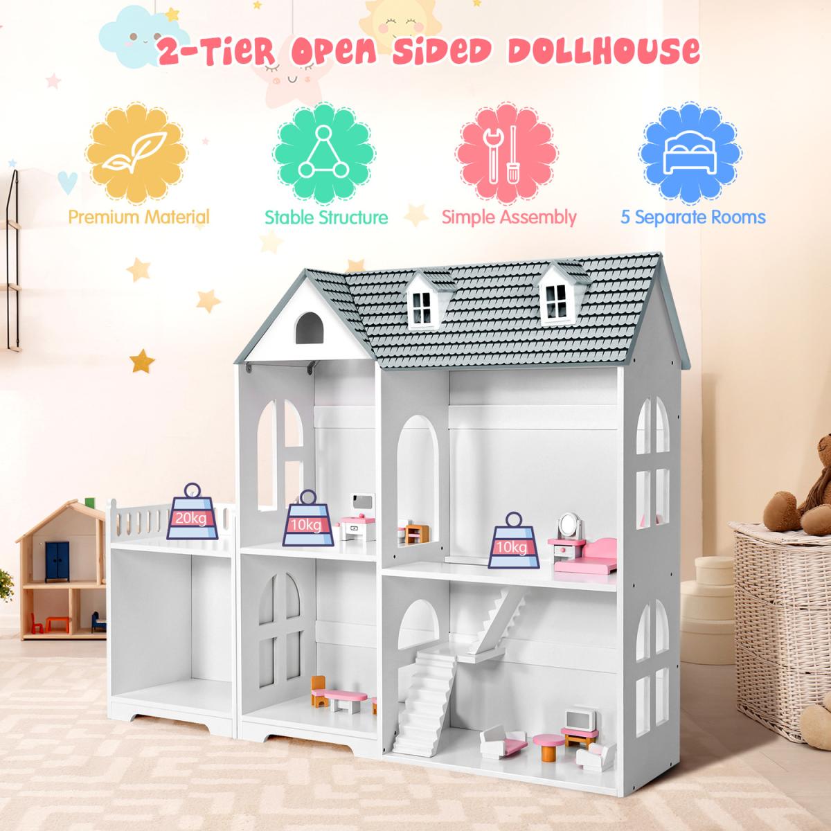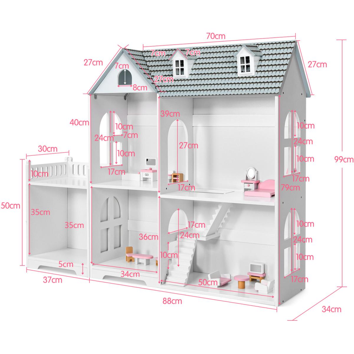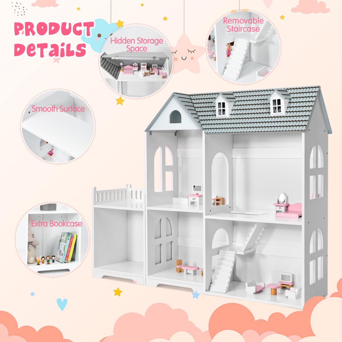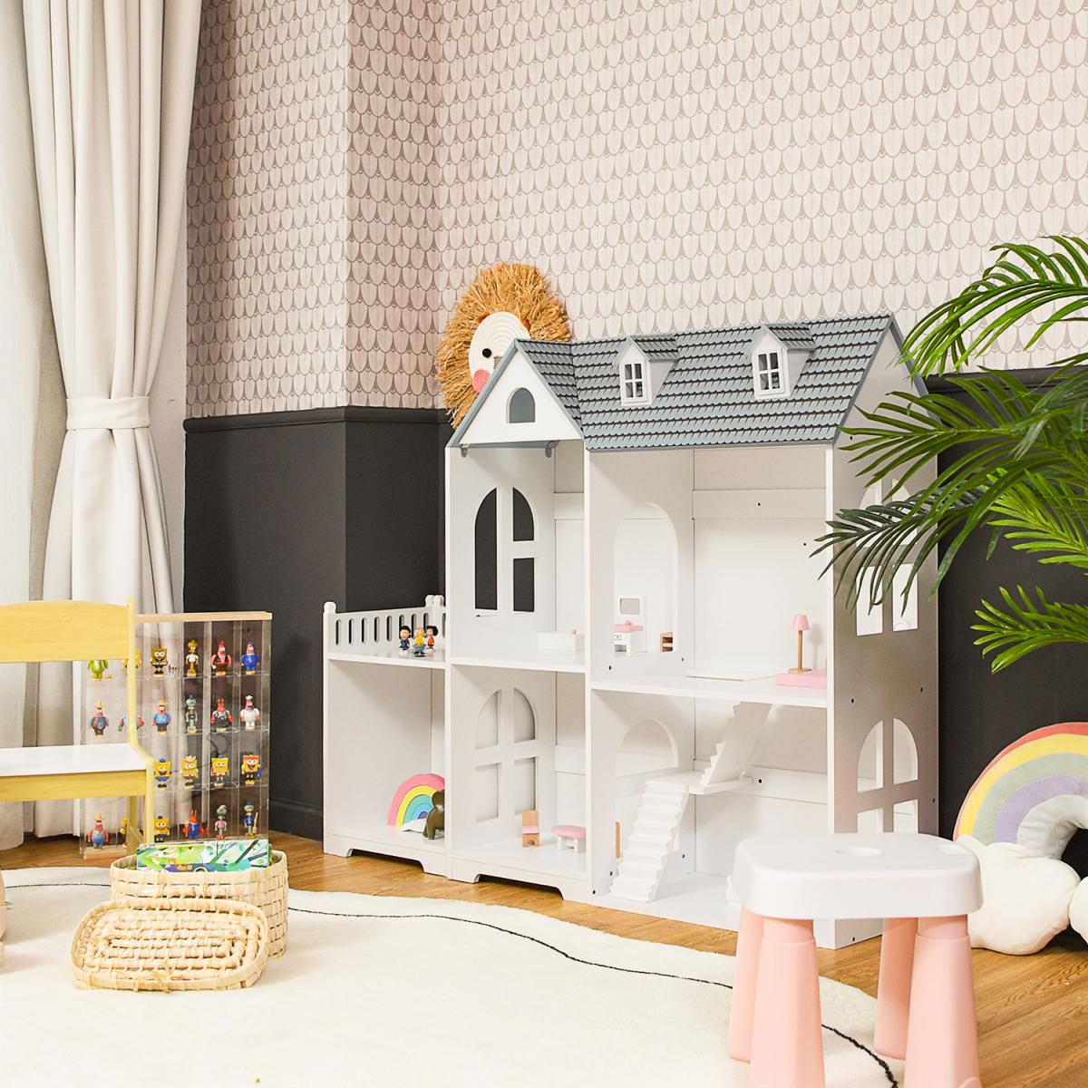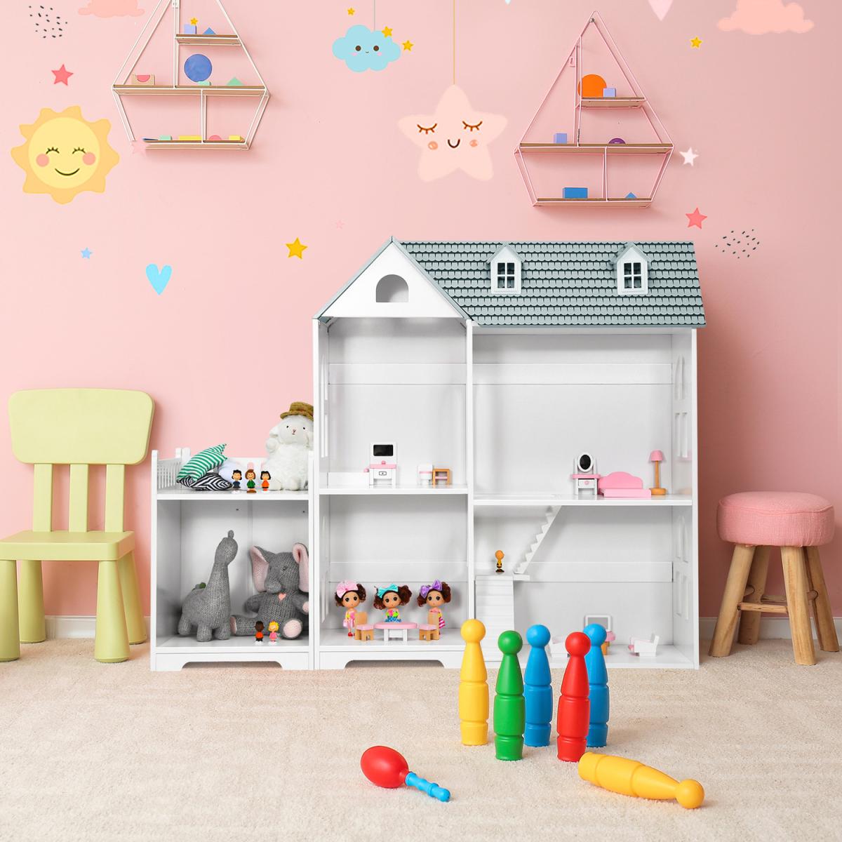 Our dollhouse bookcase is a perfect choice to accompany your little ones. Our semi-open dollhouse bookcase is equipped with 5 compartments and an additional balcony, offering kids with sufficient storage space. It can train kid's ability to organize and help them to acquire social skills. On the one hand, kids learn to place their toys and books in order. On the other hand, children can enjoy role playing fun. High quality MDF material makes it not easy to wobble. Each shelf can hold up to 10kg, while the balcony can support up to 20kg. With detailed instruction, you can install it in several minutes. Smooth surface allows you to clean it easily. Our dollhouse bookshelf is the ideal gift for your kids!