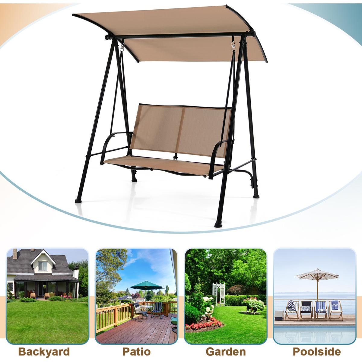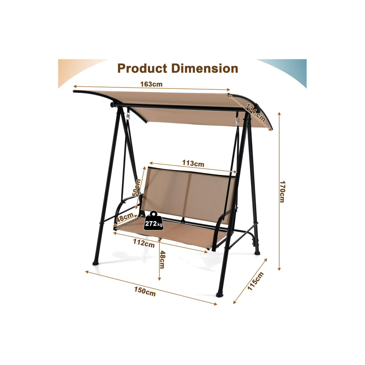 Description:Enjoy outdoor leisure time with your beloved one with our 2-person patio swing seat!By adjusting the canopy, you can always find an appropriate angle for a better shading effect. What's more, the breathable fabric seat enables you to feel cool on hot days, driving away fatigue for coziness. The sitting area is large enough for 2 people at the same time. With the solid support of the sturdy metal frame, this outdoor patio swing bench has a strong weight capacity of 272 kg. It is up to you where to put the outdoor canopy swing loveseat. Thus, a comfortable seat is available in the garden, backyard or balcony.