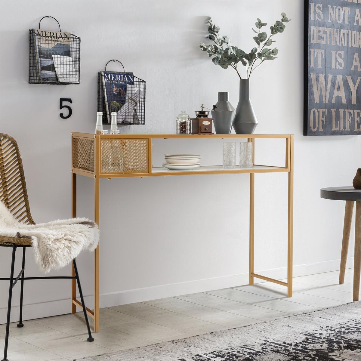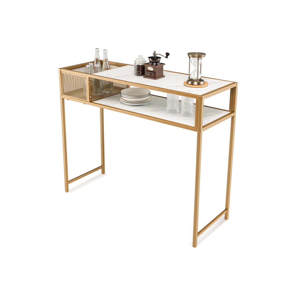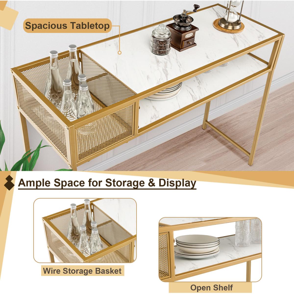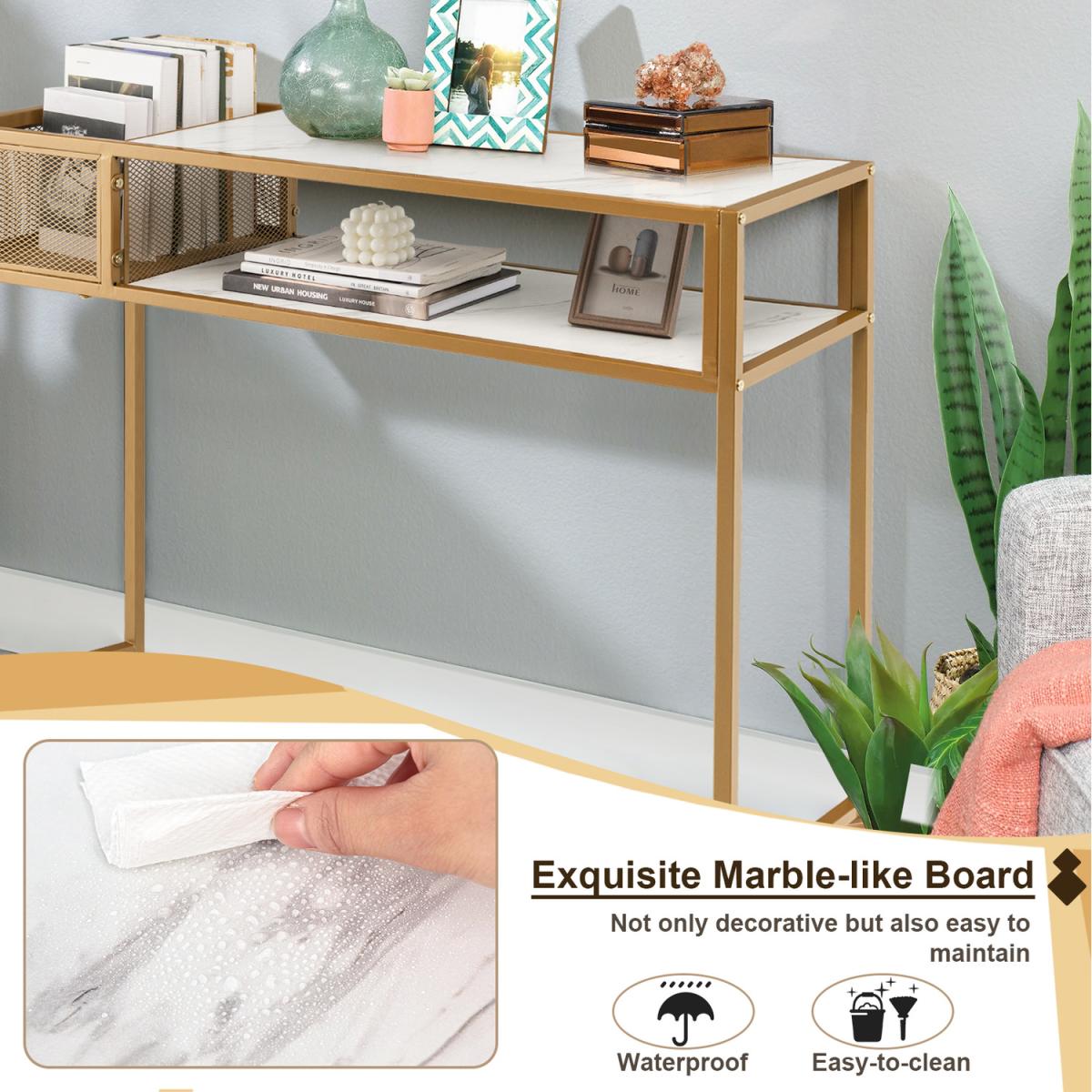 Have you found a practical yet stylish console table? This chic entryway table would be one of your ideal choice. The sleek lines, faux marble tabletop as well as gold steel frame add a sense of charm to your home and show your great taste, making this sofa table a stunning addition for various places. In addition, a wide tabletop, open shelf and storage basket can well suit your different needs, which is a great storage solution for optimizing space and also makes your room more tidy and clean. The combination of MDF tabletop and heavy-duty steel frame brings long-lasting reliable service to you. Meanwhile, the hallway table is equipped with anti toppling device for higher stability. All in all, the console table is a charming complement for any place, such as living room, bedroom, entryway, etc.