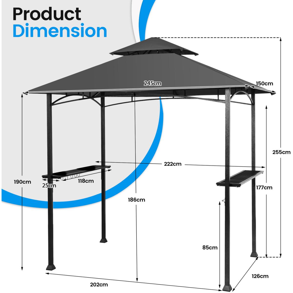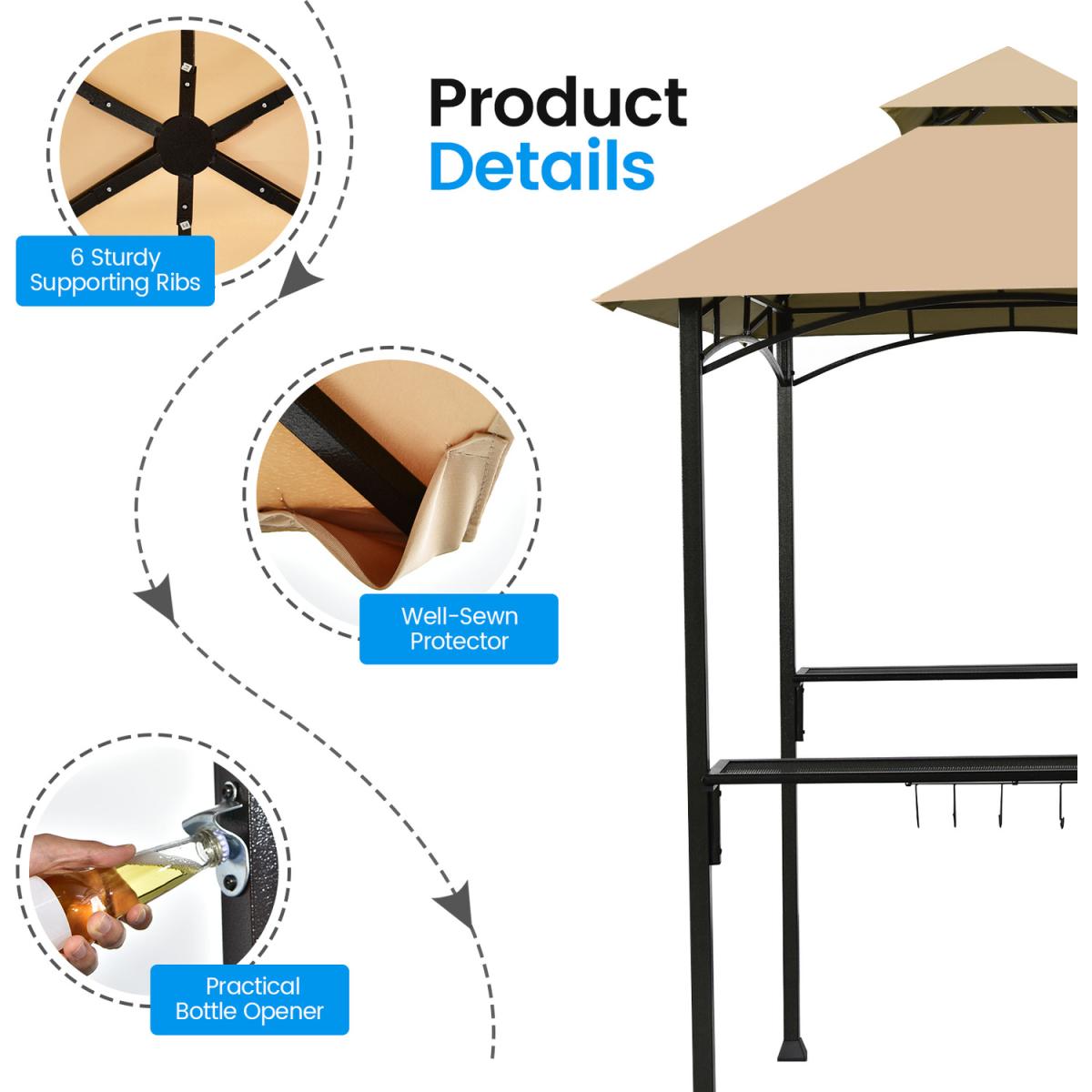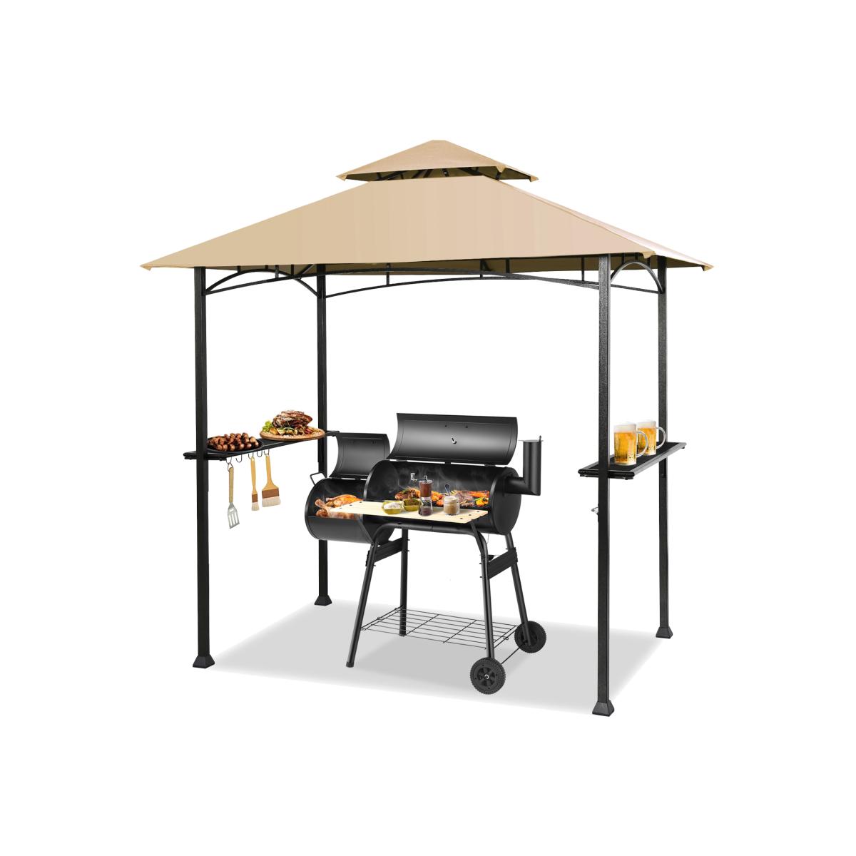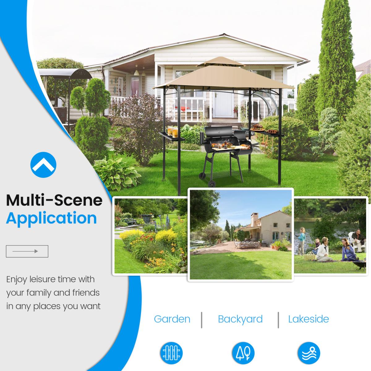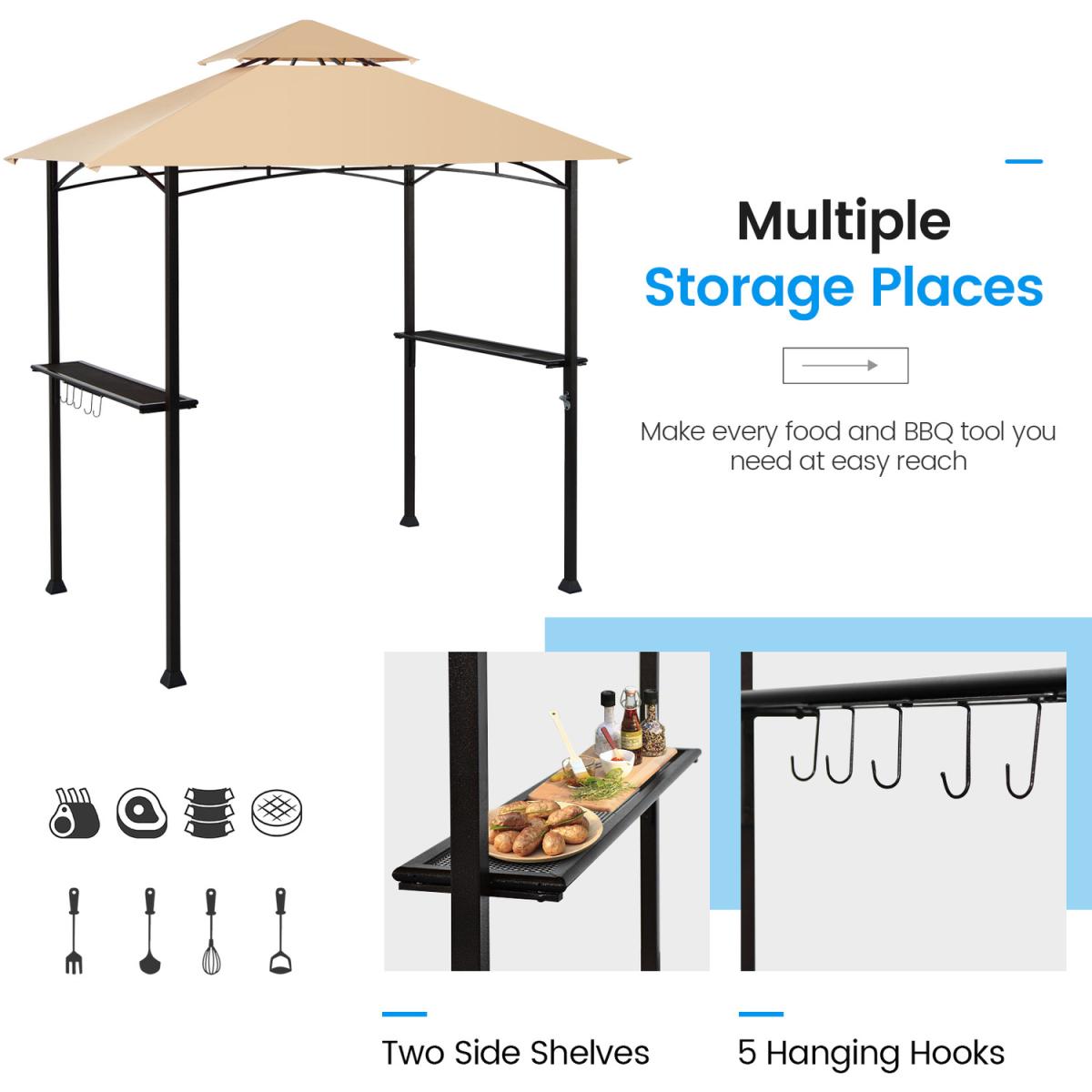 This outdoor grill gazebo creates a comfortable space for you to enjoy barbecue without scorching sunlight. Supported by super strong steel frame, this grill gazebo possesses high stability and ensures security. And the top canopy is made of high-grade polyester fabric, which is resistant to water, fire, sunlight and tearing, ensuring long-lasting service life and protecting you from all uncomfortable elements. The shelves on the two sides and the 5 hanging hooks provide additional space for you to place food and cooking accessories. Also, the practical bottle opener allows you to immediately open your drinks. This gazebo is not only perfect for barbecue, but also idea for picnic, party and other outdoor activities. It will satisfy your multiple needs for outdoor entertainment.