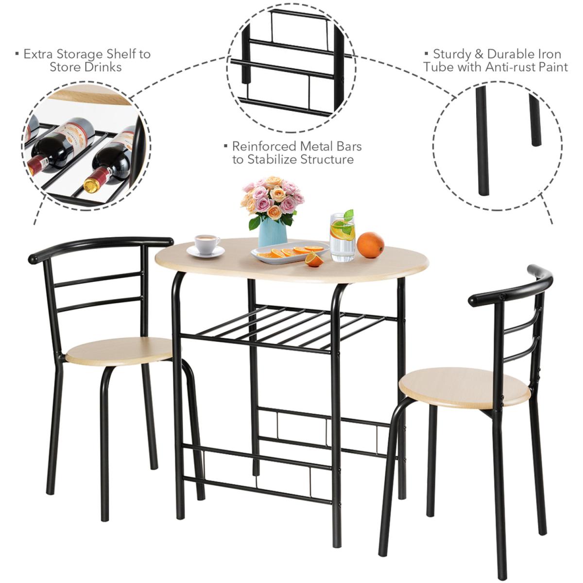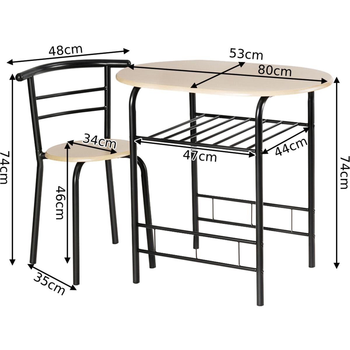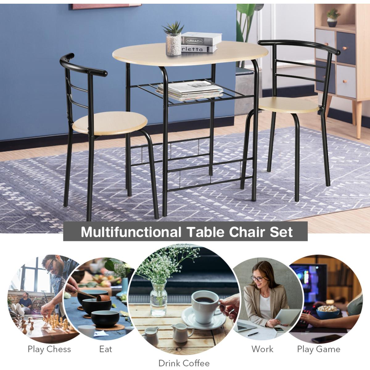 This style table and chair set with classic and simple design add elegance to your home kitchen and dining room, which is easily incorporated into many decorations. Made of composed board and painted iron pipe to form stable structure. Under the table is an additional storage rack, which can be used to store wine, magazines, cups, and bowls according to your needs. The curved backrest is ergonomically designed to make you feel comfortable. Compact size with big storage space makes it perfect or tiny apartment or your dining room or any other limited spaces. This dining set is suitable for your pool side, balcony, living room, garden, patio, etc.