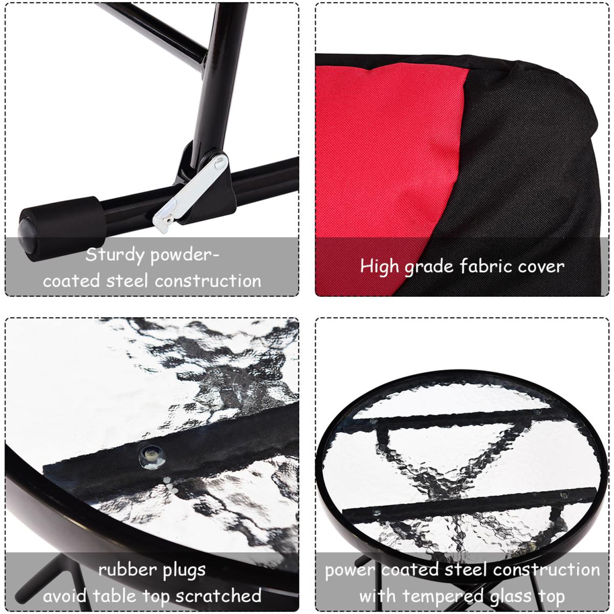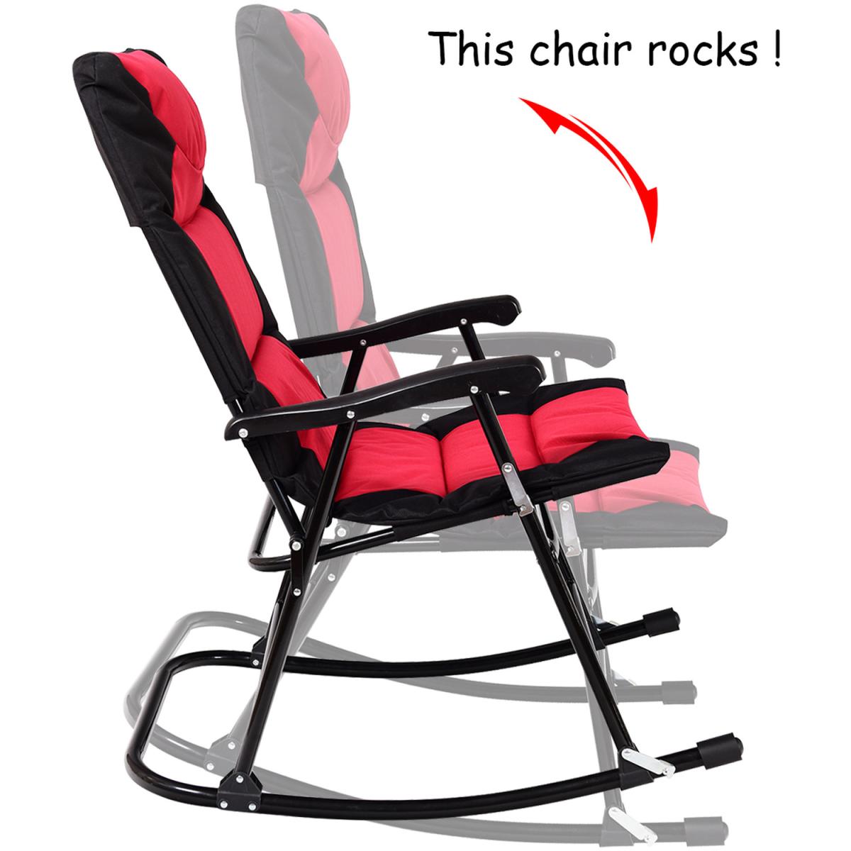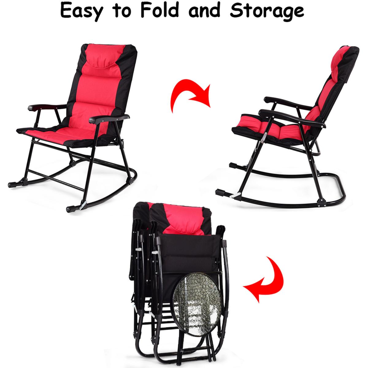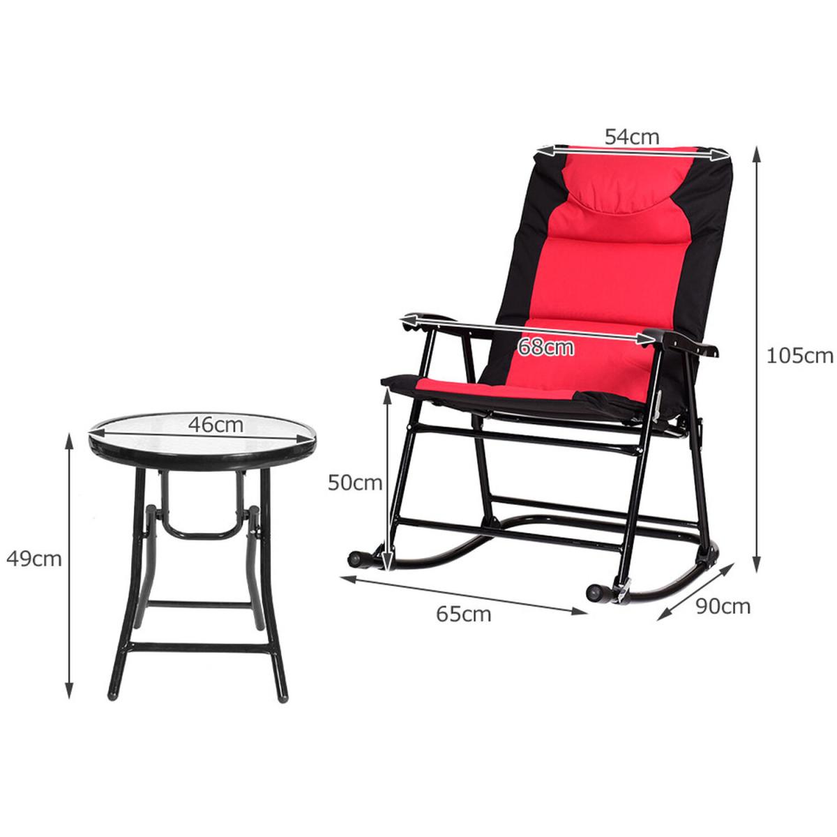 The combination of 2 rocking chairs and 1glass coffee table can make a great addition to your patio or deck. Unlike ordinary chairs, our chairs come with added rocking feature can provide you with more relaxed experience. Solid steel construction and premium PVC fabric ensure long lasting durability. The coffee table comes with tempered glass is perfect for holding drinks or wine. The thick padded cushion, backrest and headrest offer optimum comfort. Equipped with locking pins, the chairs will be more stable to ensure your safety during using. Because of the foldable design, our rocking chairs and table can be stored in any compact place when not in use. You can also bring this outdoor furniture set with you when you go out for camping. This fabulous folding rocking chair and table set will make your outdoor life more relaxed and enjoyable.