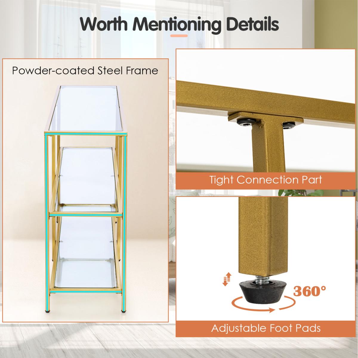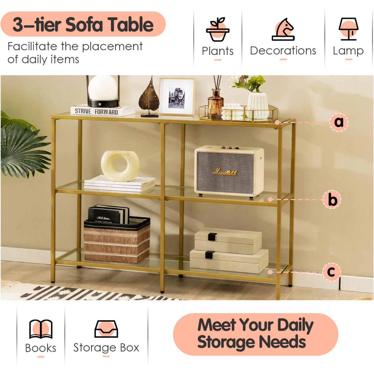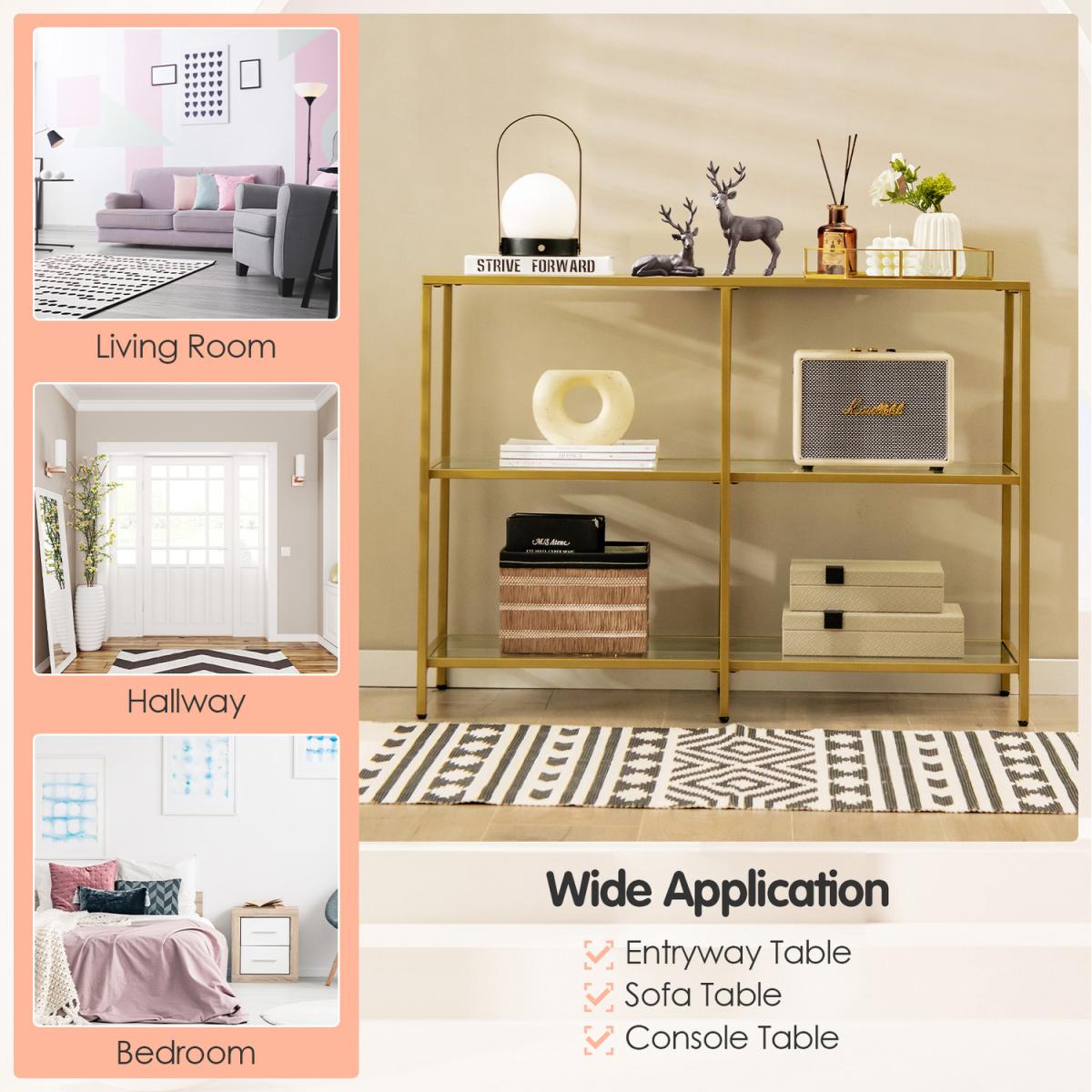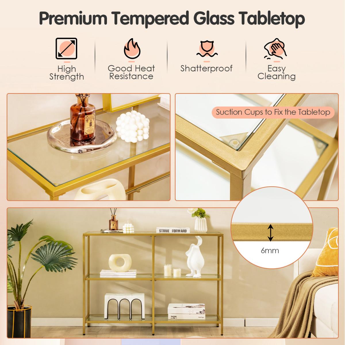 Our glass console table will undoubtedly be a perfect addition to your home! Solid tempered glass tabletop features good heat resistance, blast-proof, and high strength. Plus, sturdy steel frame is not easy to crack or deform. 3 tier shelf provides ample storage space for daily items and keeps everything you need with reach, which is fixed by suckers for higher stability. The combination of transparent tabletop and gold steel frame adds refined sensation to your home. Meanwhile, this stylish console table perfectly matches well with other furniture and applies to any corner of your home, such as living room and hallway.