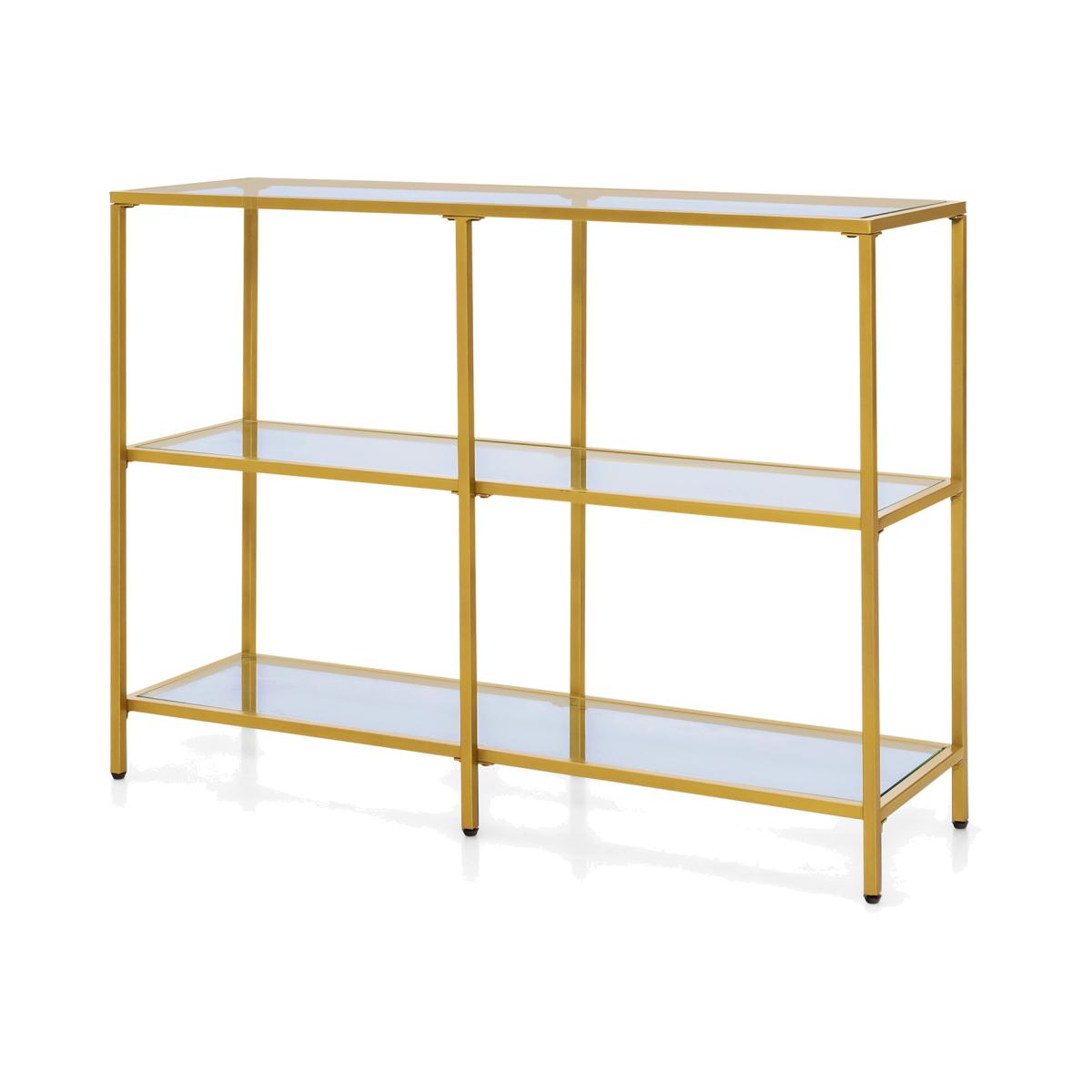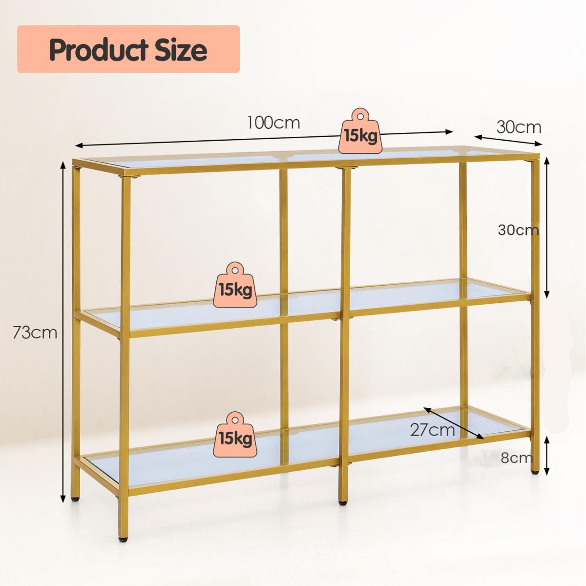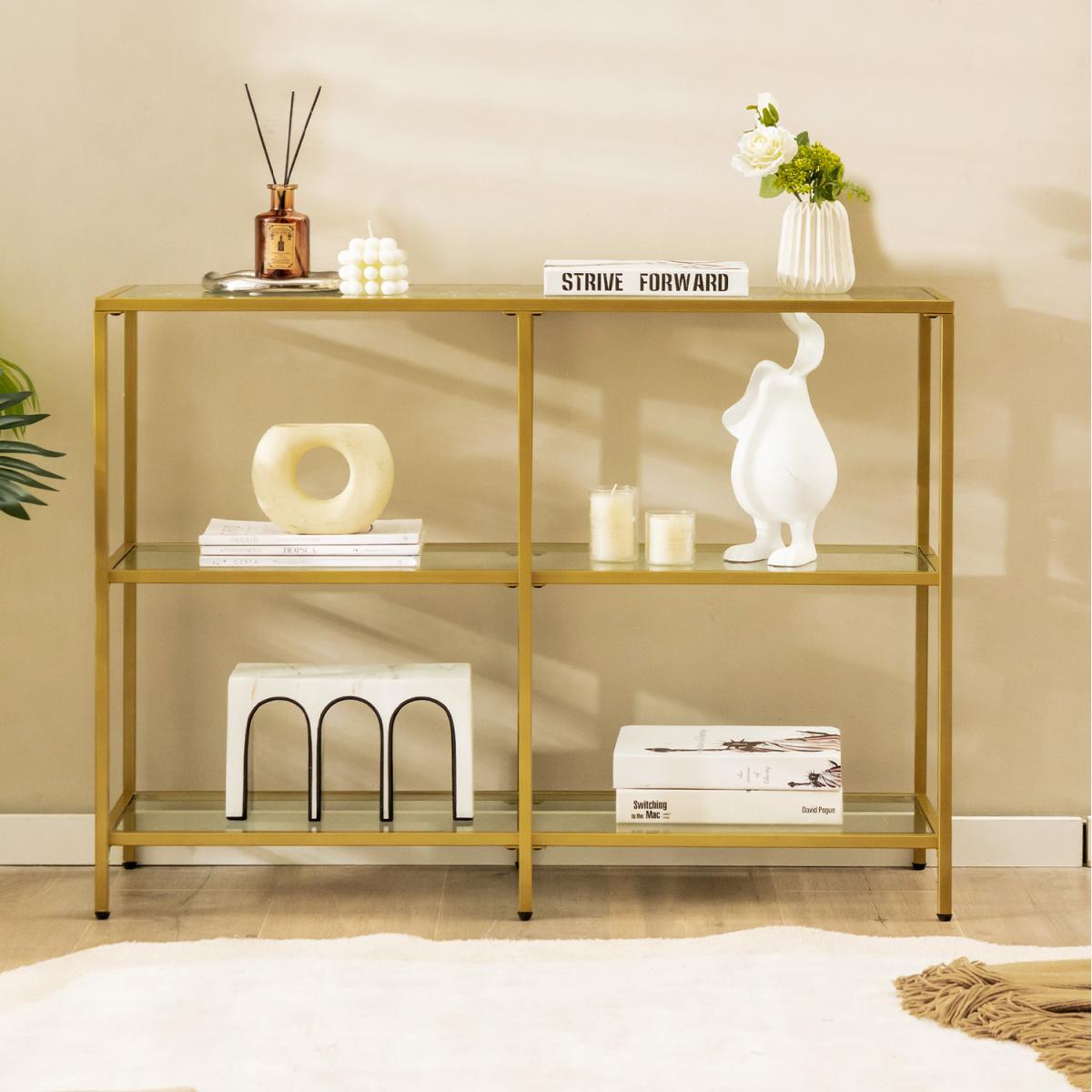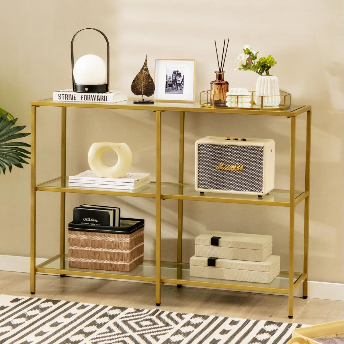 Our glass console table will undoubtedly be a perfect addition to your home! Solid tempered glass tabletop features good heat resistance, blast-proof, and high strength. Plus, sturdy steel frame is not easy to crack or deform. 3 tier shelf provides ample storage space for daily items and keeps everything you need with reach, which is fixed by suckers for higher stability. The combination of transparent tabletop and gold steel frame adds refined sensation to your home. Meanwhile, this stylish console table perfectly matches well with other furniture and applies to any corner of your home, such as living room and hallway.