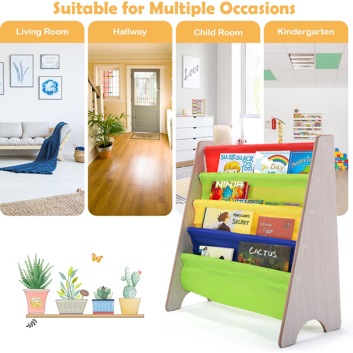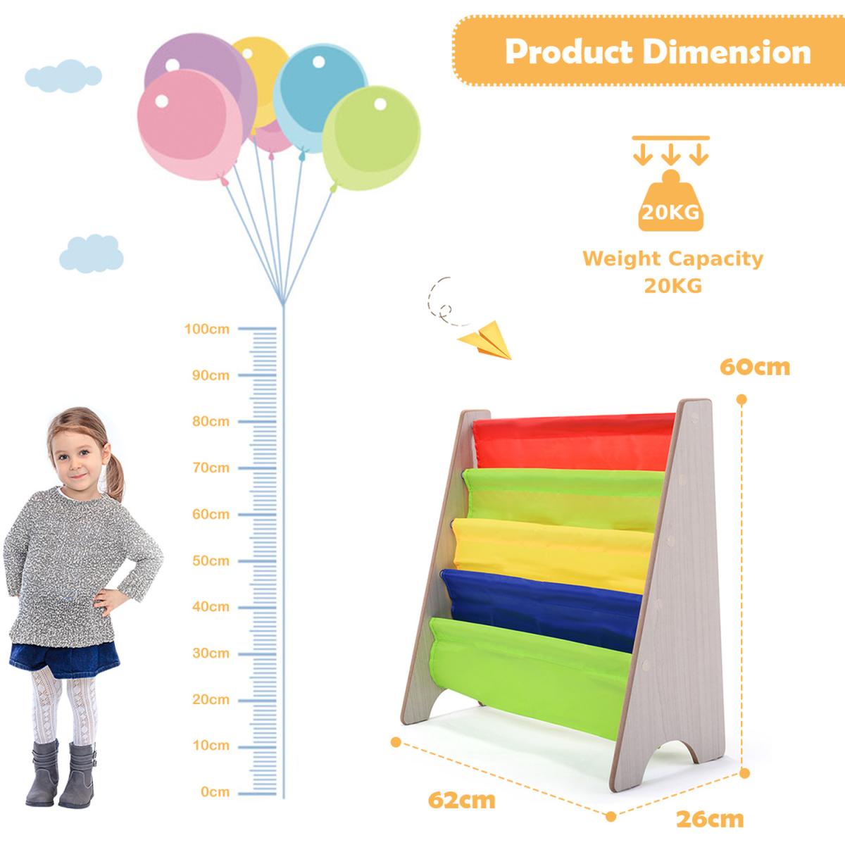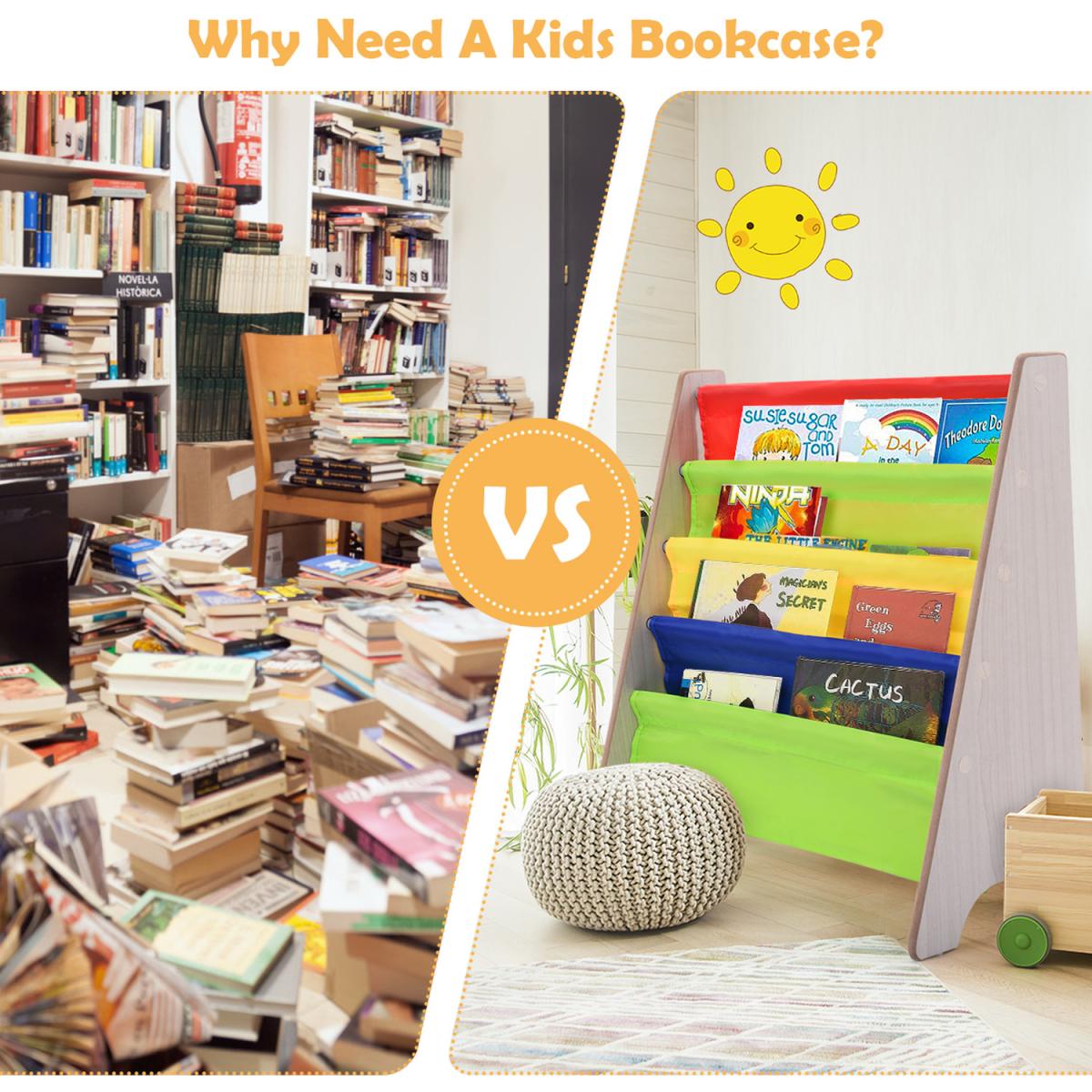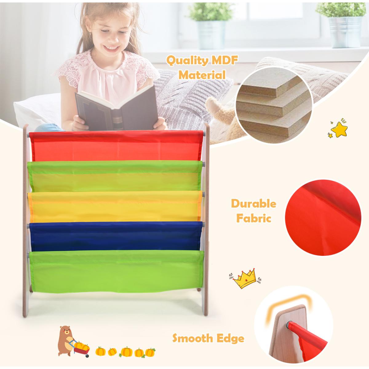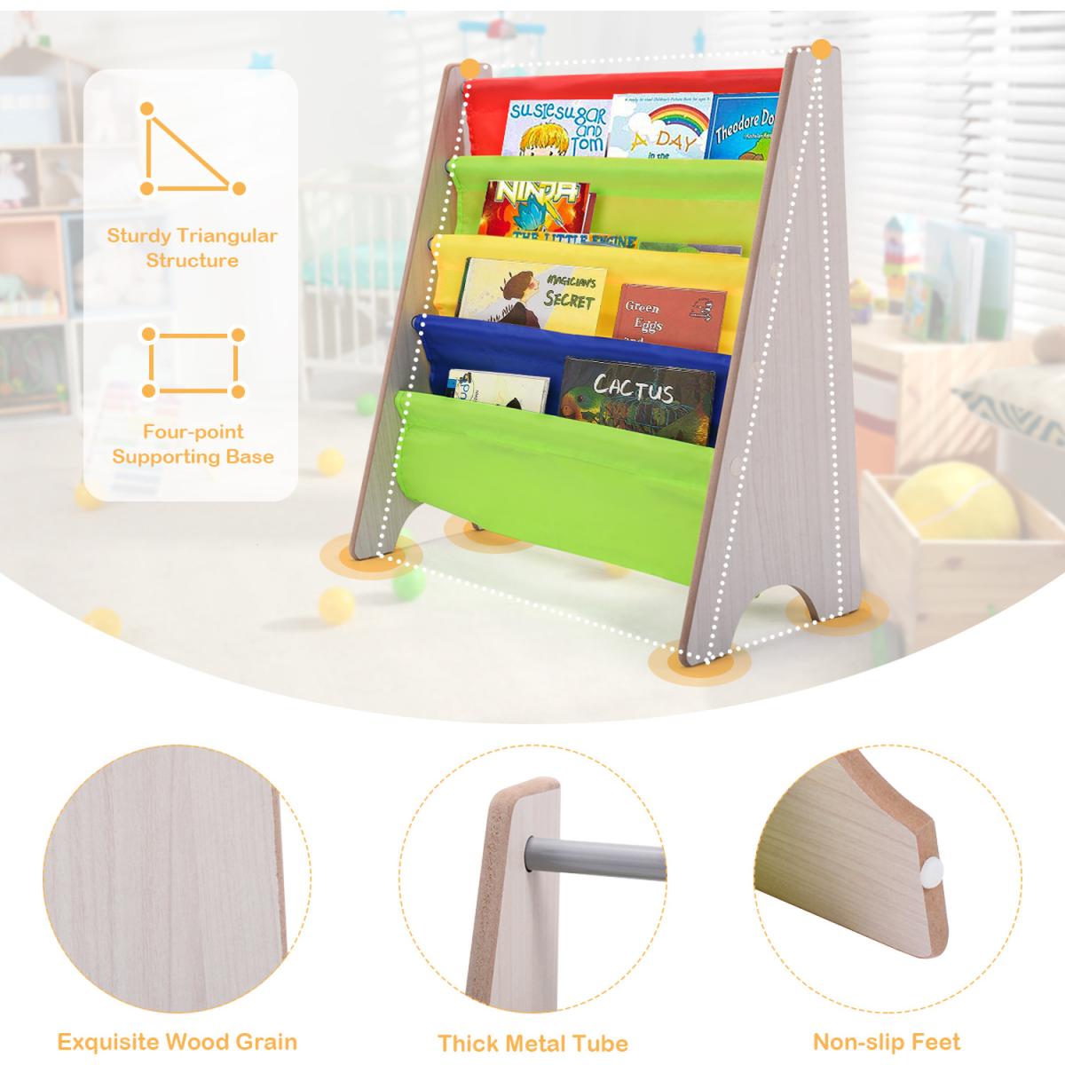 Description: Are you still looking for a good-looking and utility bookshelf for your little kids? Our kids bookshelf maybe a good choice for you!Made of wood, steel and fabric, it has high-quality materials, which can better protect the health of the kids. At the same time, it adopts a triangular structure, which is very strong and stable. In addition, the bookshelves have four tier storage areas, with a very large storage space, which can hold books of various sizes to help children develop their organization and reading skills from an early age.