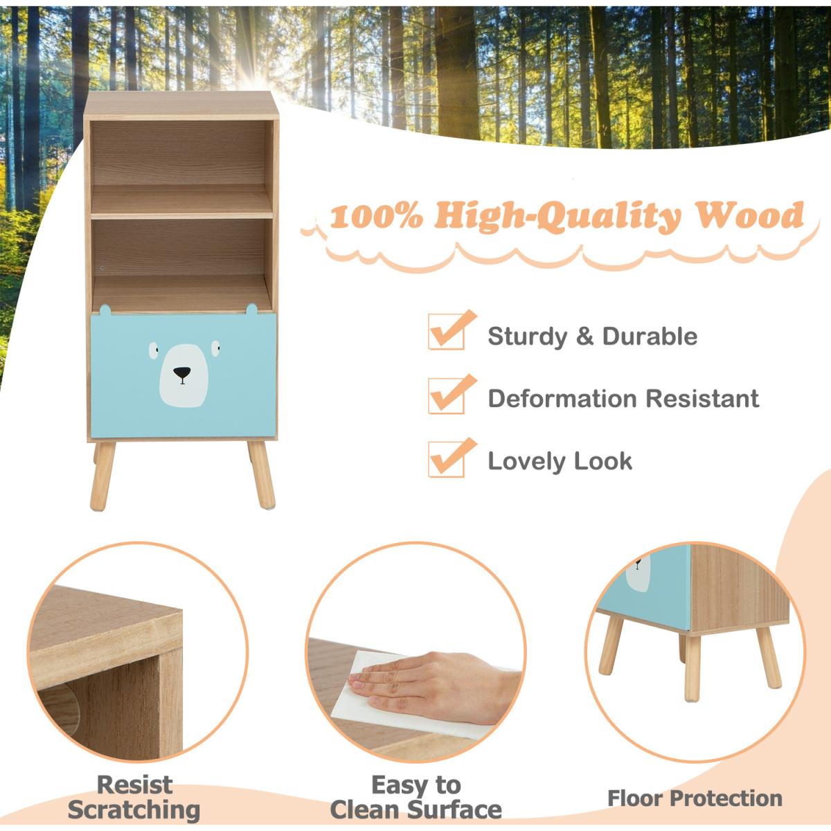Are you looking for a piece of furniture with storage function for your home? Then this cute 3-tier storage rack will satisfy your needs! 2 large storage shelves and a drawer for personal items can meet daily storage needs. Kids can keep their books on the shelf while storing their toys in the drawer. Quality MDF and strong connections provide excellent load-bearing capacity. The smooth, water-resistant surface makes the storage box easy to clean and maintain. What's more, the reliable anti-toppling device can also protect the storage rack from tipping over and ensure the safety of children. You can use this storage shelf in different places, such as playroom, bedroom or living room.