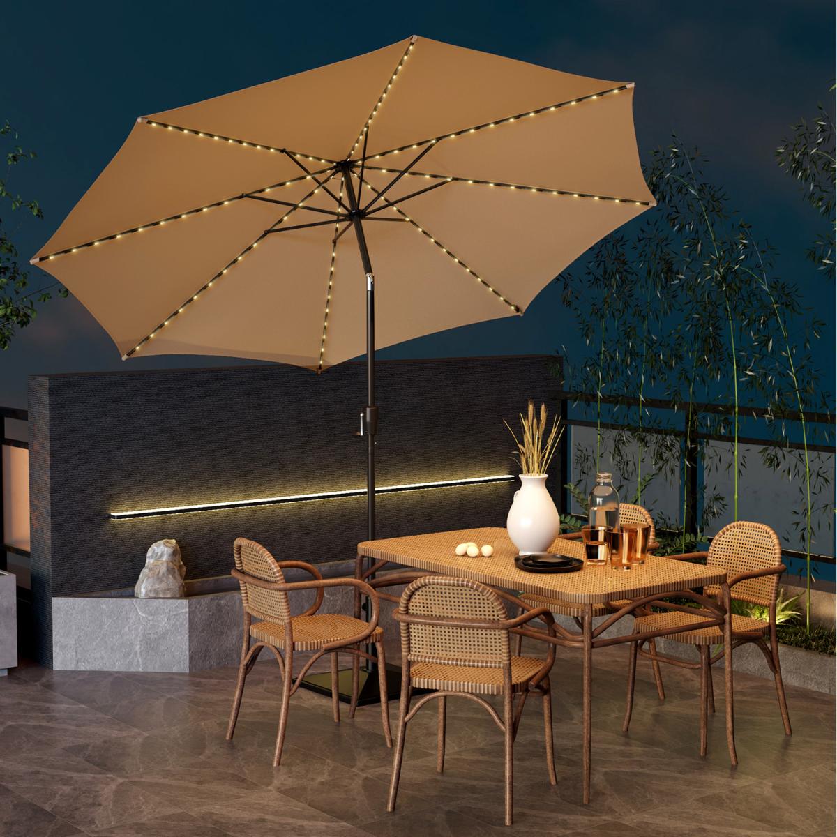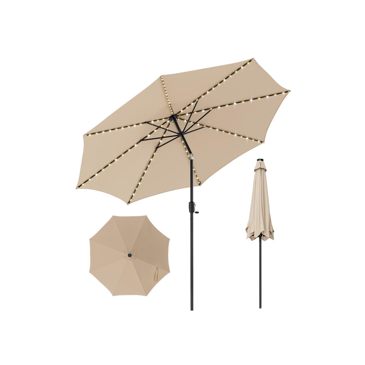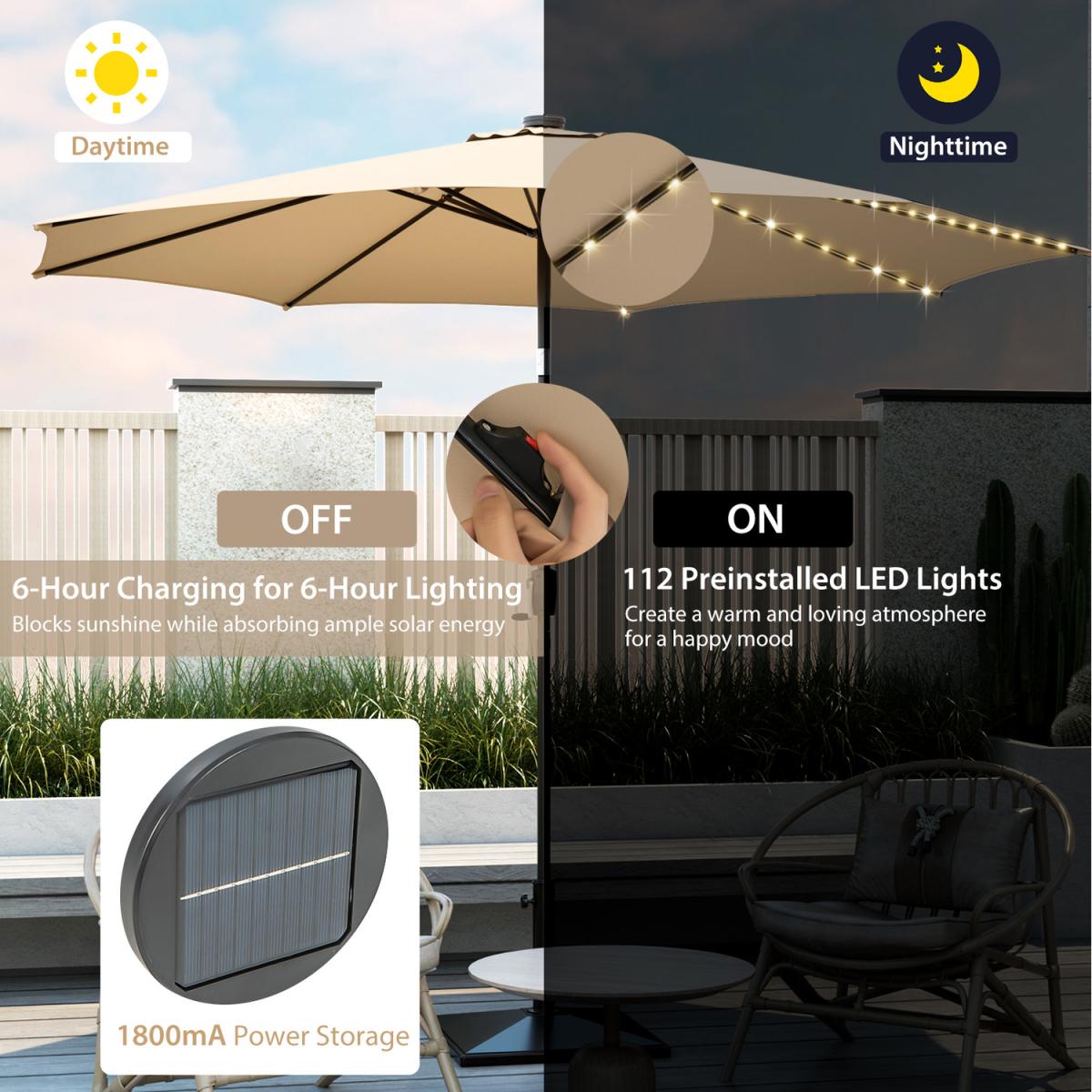 Ready to enjoy cool breeze with the large patio umbrella!The led-lighted large patio umbrella is equipped with a solar panel, allowing the 112 lights last for 6 hours. Once press the light switch on the rib, the patio umbrella will bring romantic atmosphere to you for a wonderful time. Besides, the canopy is made of premium polyester fabric, so you will get sun and drizzle protection during the day. With 7 m2 shade area, it is perfect for family chatting, gathering or party. Additionally, you can adjust the tilt level according to the angle of the sun to enjoy perfect shade. More conveniently, the patio umbrella is consist of 2 section poles for easy assembly. And you can quickly open it with the easy to operate crank handle. Thus, with our patio umbrella, you will quickly get a sun shelter in yard, poolside, patio, etc.