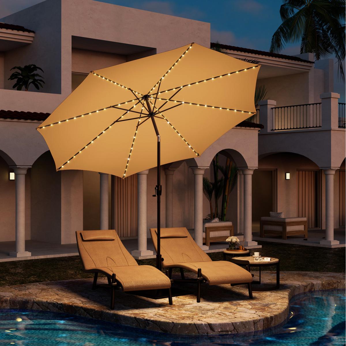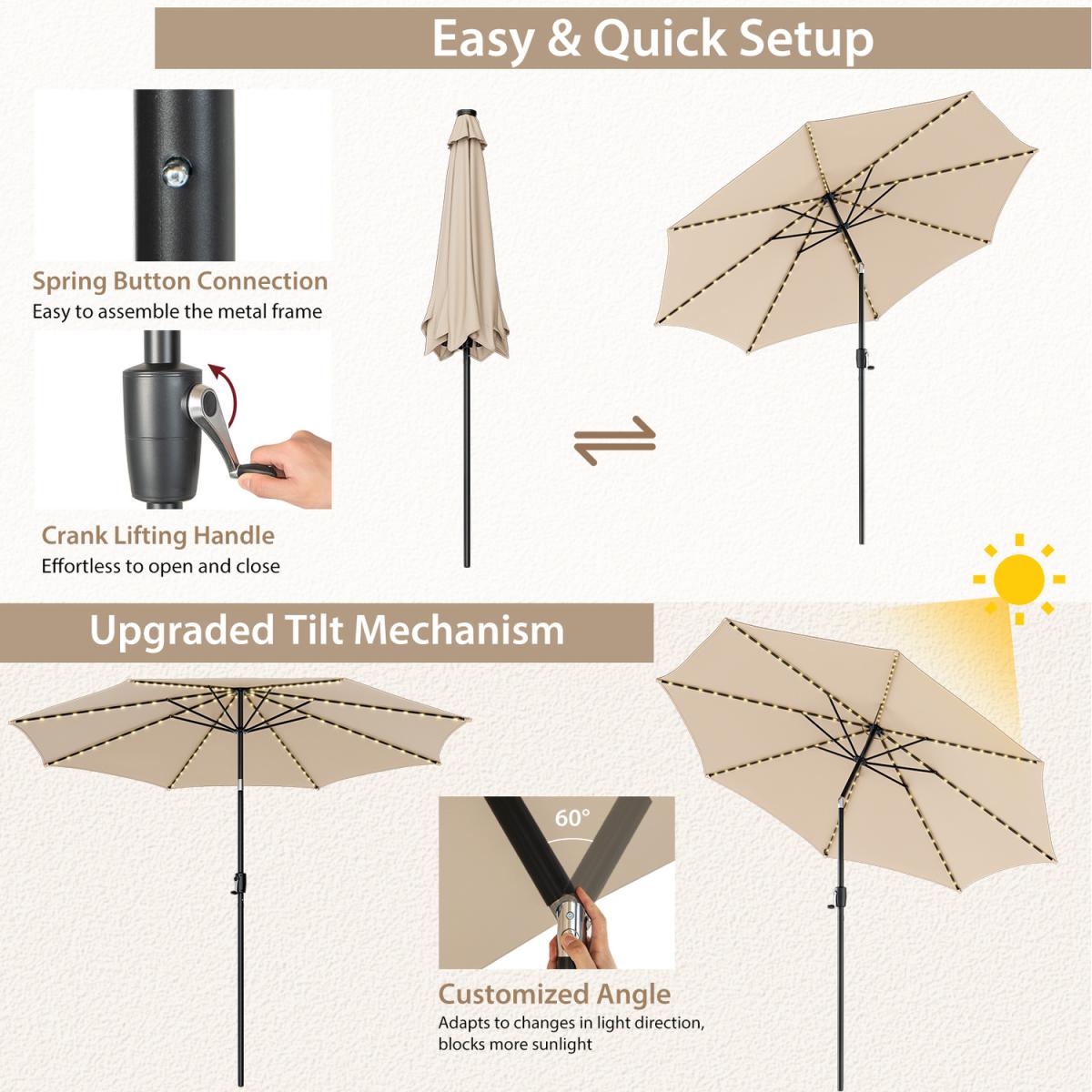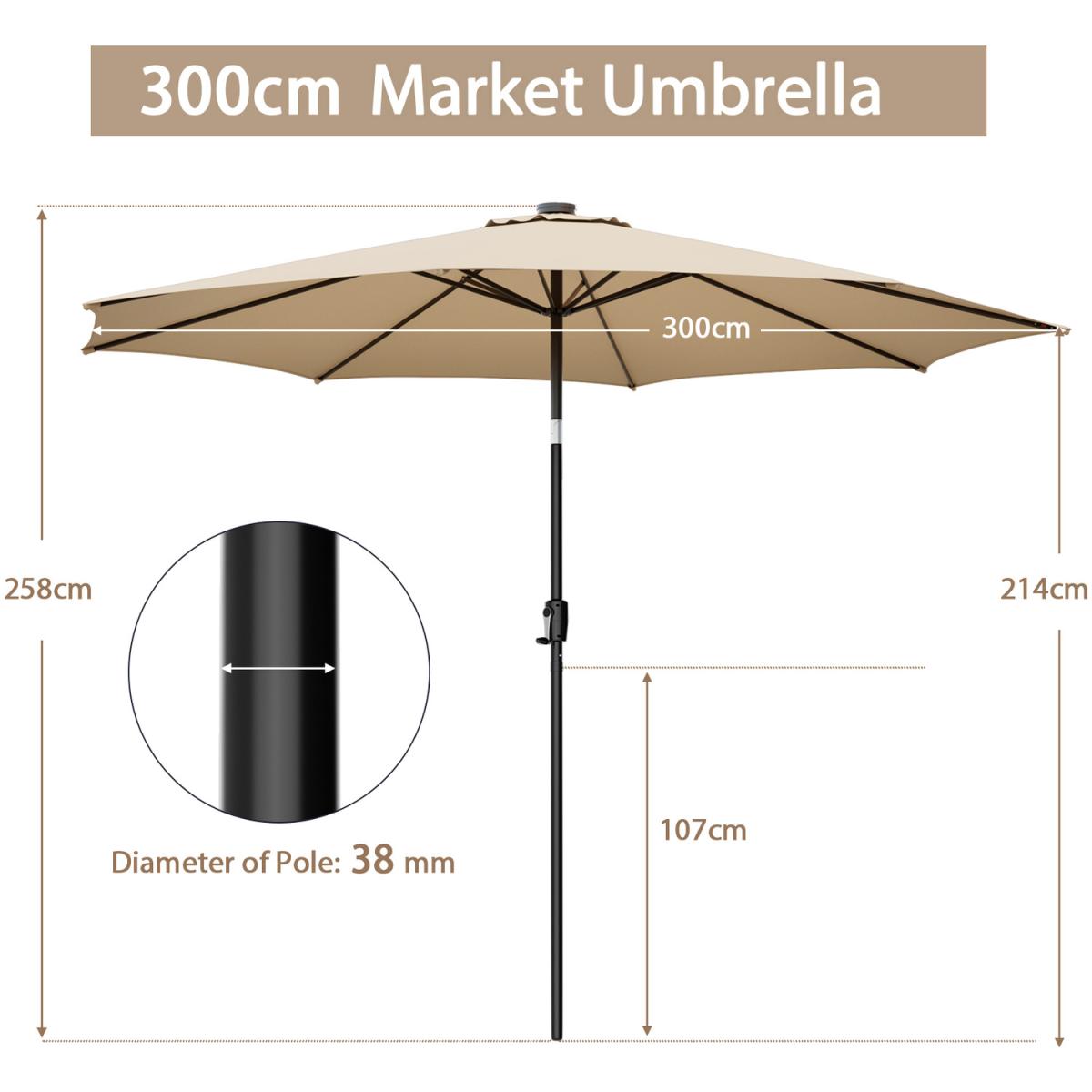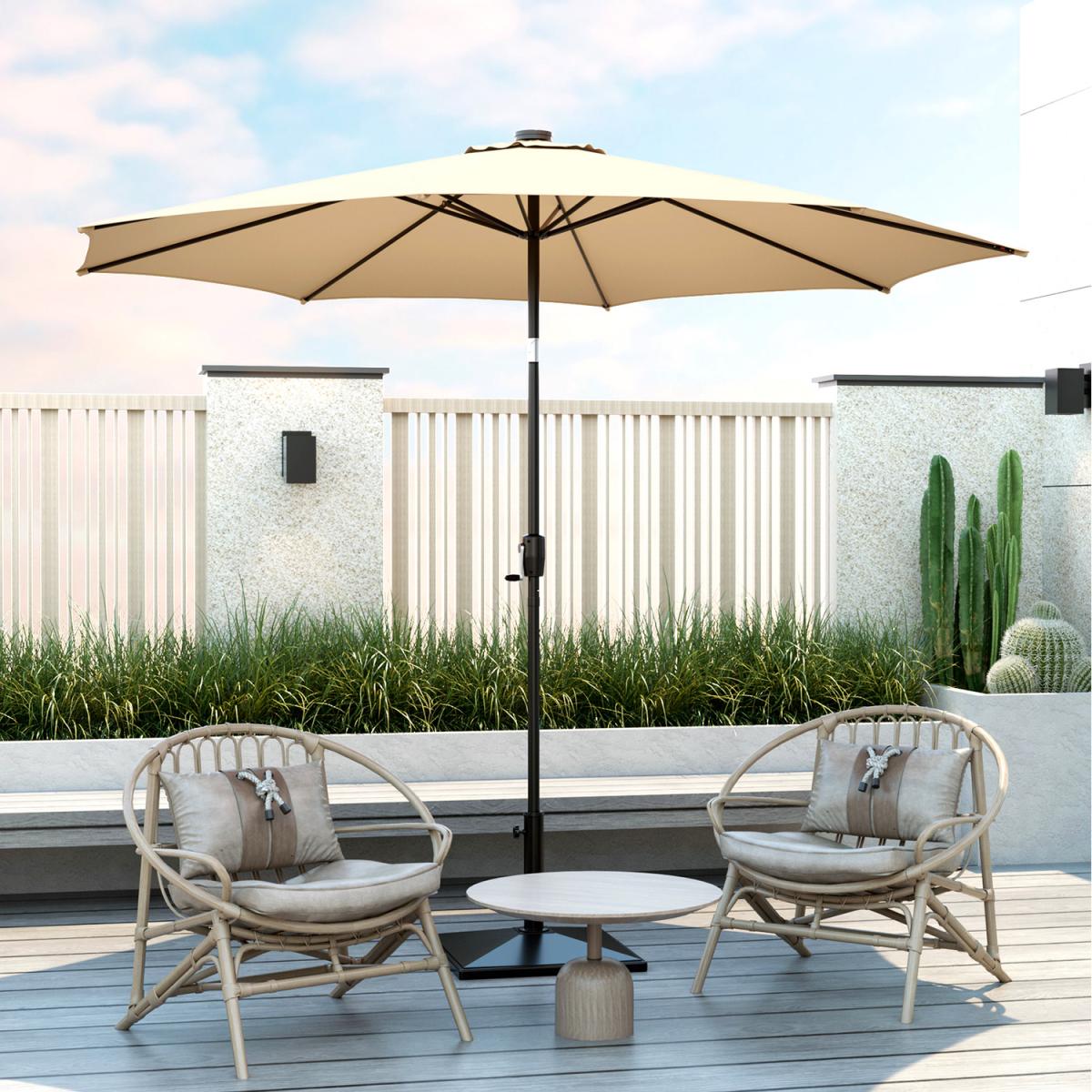 Ready to enjoy cool breeze with the large patio umbrella!The led-lighted large patio umbrella is equipped with a solar panel, allowing the 112 lights last for 6 hours. Once press the light switch on the rib, the patio umbrella will bring romantic atmosphere to you for a wonderful time. Besides, the canopy is made of premium polyester fabric, so you will get sun and drizzle protection during the day. With 7 m2 shade area, it is perfect for family chatting, gathering or party. Additionally, you can adjust the tilt level according to the angle of the sun to enjoy perfect shade. More conveniently, the patio umbrella is consist of 2 section poles for easy assembly. And you can quickly open it with the easy to operate crank handle. Thus, with our patio umbrella, you will quickly get a sun shelter in yard, poolside, patio, etc.