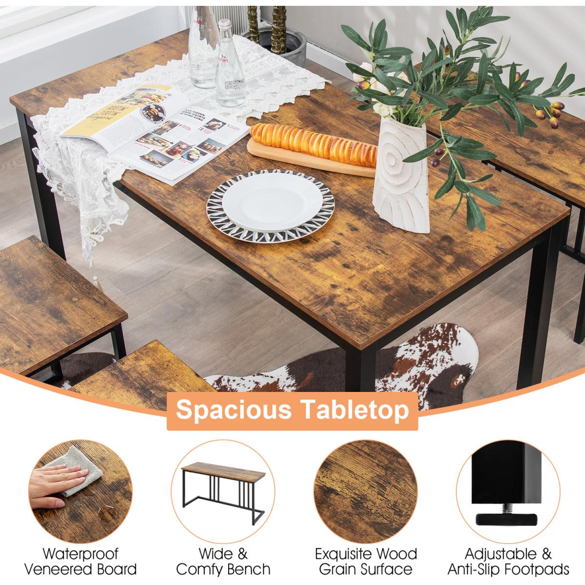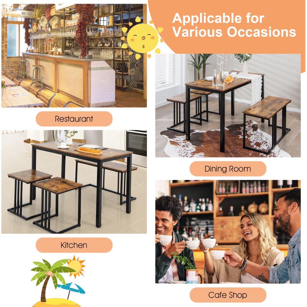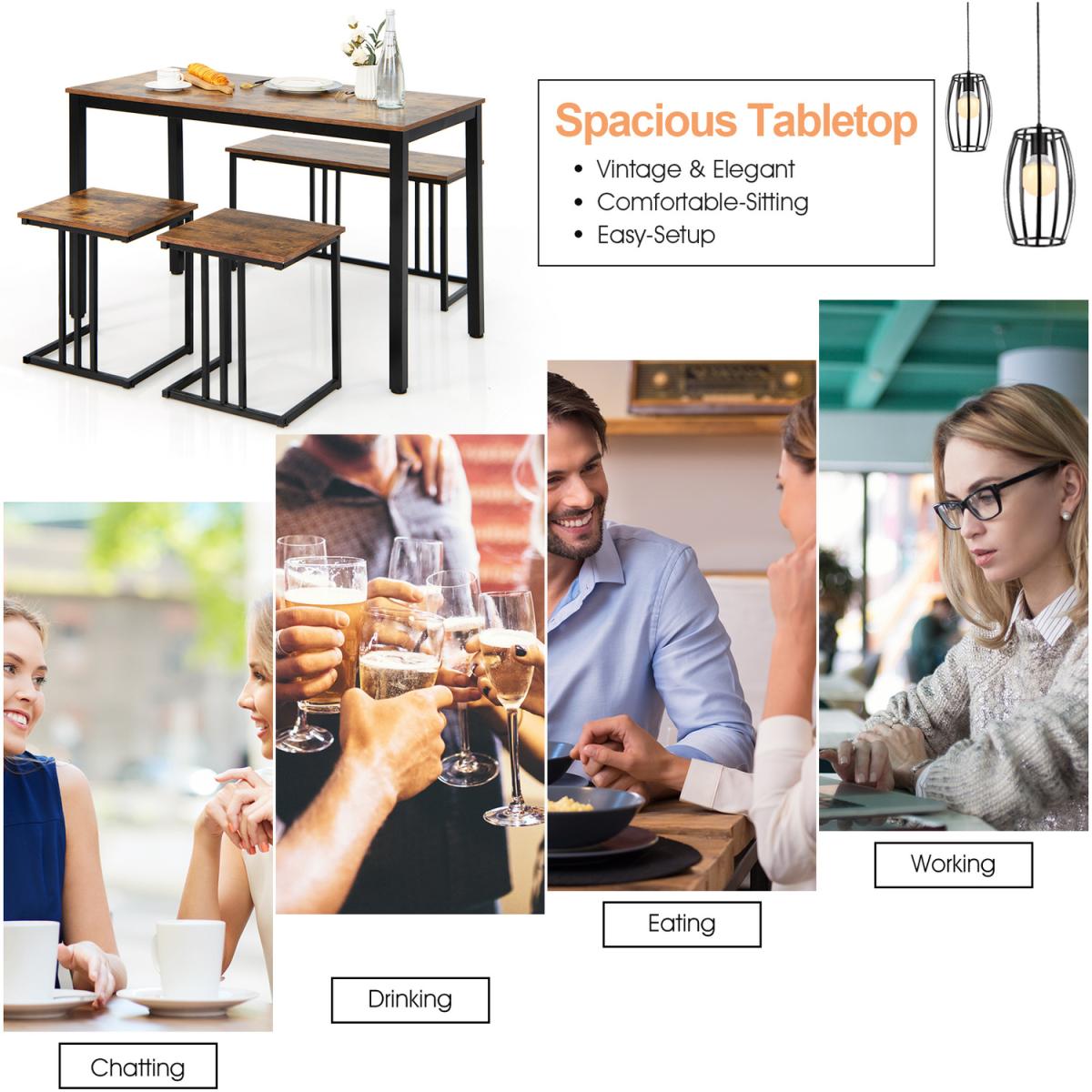 This 4 pieces dining table set starts delightful family time and friends gathering, allowing to enjoy entertainment all together. Large tabletop not only provides spacious space for the placement of dinnerware and decorative items, but also offers enough space for home office activities. Powder-coated steel frame and durable MDF tabletop through delicate craftsmanship ensure long service time. In order to save more space, the bench and stools can be nested under the table when not in use. Owning this well-designed dining set makes it easier to enjoy delicious food and have a good time with your family and friends. Moreover, the industrial dining table set brings a refreshing feeling to various occasions, such as dining room, kitchen, restaurant, cafe, and pub, etc.