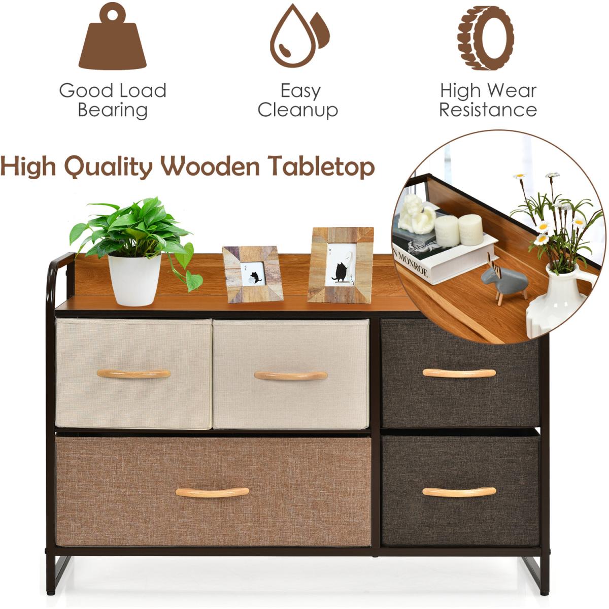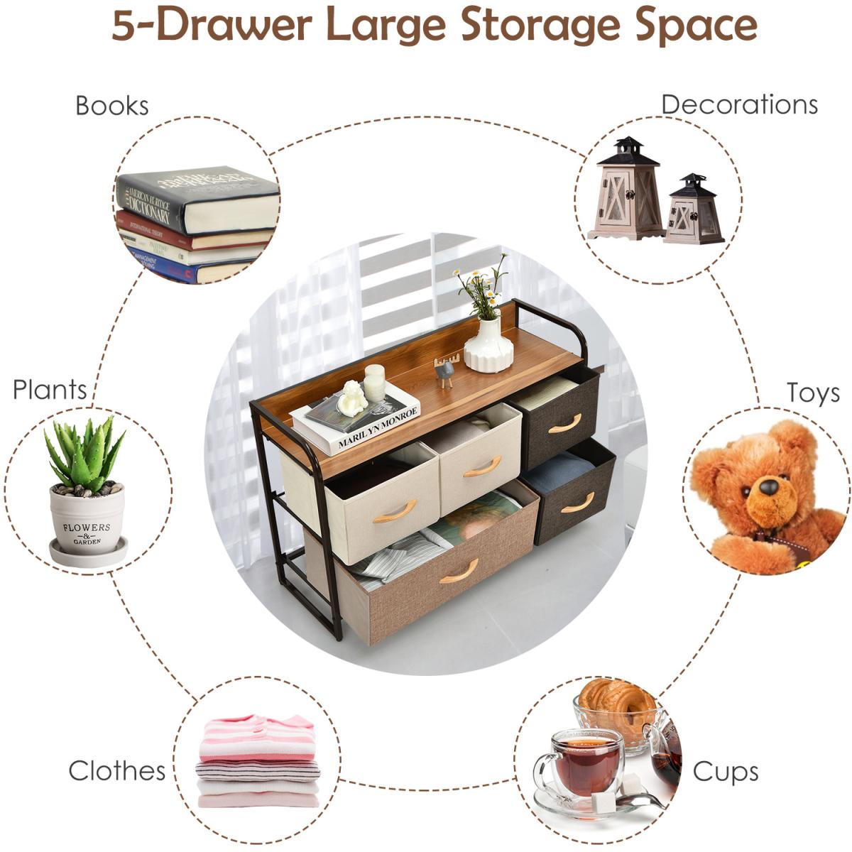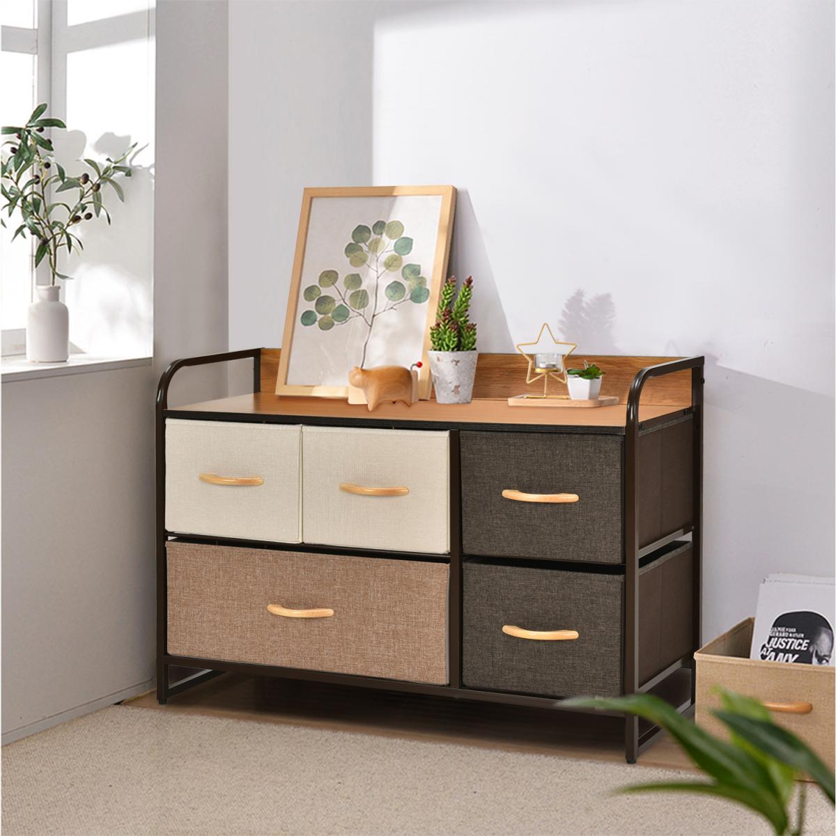 A multifunctional and nice-looking organizer unit for your home!This dresser storage tower with 5 foldable drawers will organize your items in good order to maximize your space and make your room tidy. High-grade fabric drawers can keep things in good condition and are more durable. Modern style allows the dresser to blend with any home decor easily. It is perfect for bedroom, nursery room, laundry room, living room, hallway, closets, etc. As for the quality, our cabinet is made of sturdy iron frame and durable MDF top, ensuring strong stability and long-lasting use. And the wooden top is smooth and waterproof for easy cleaning. Featuring a lightweight and compact design, this 5-drawer dresser chest stand is portable, easy to move and assemble.
