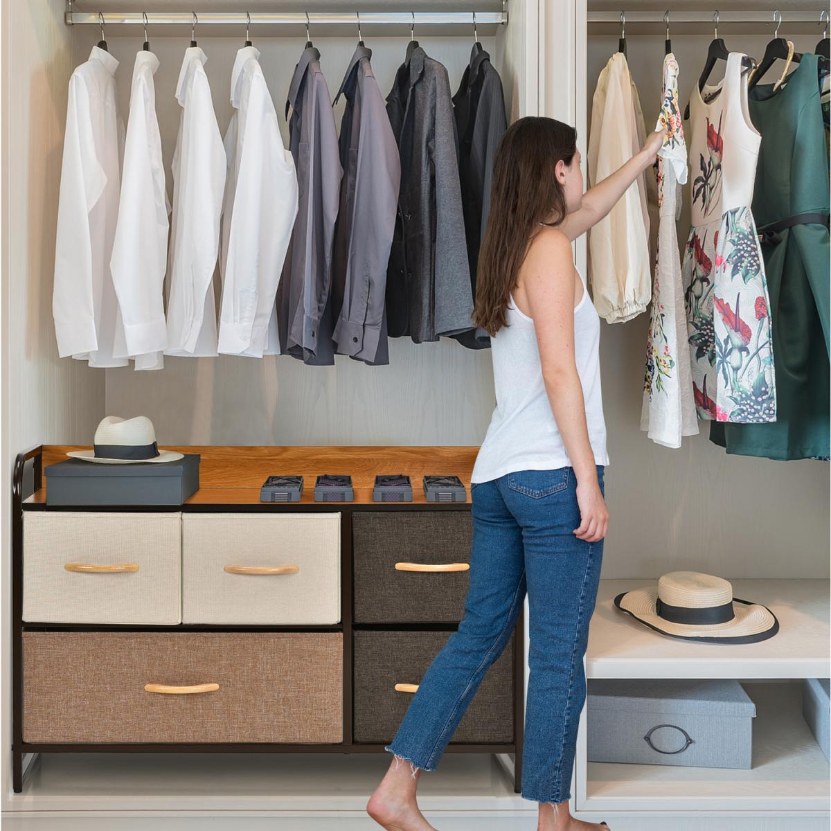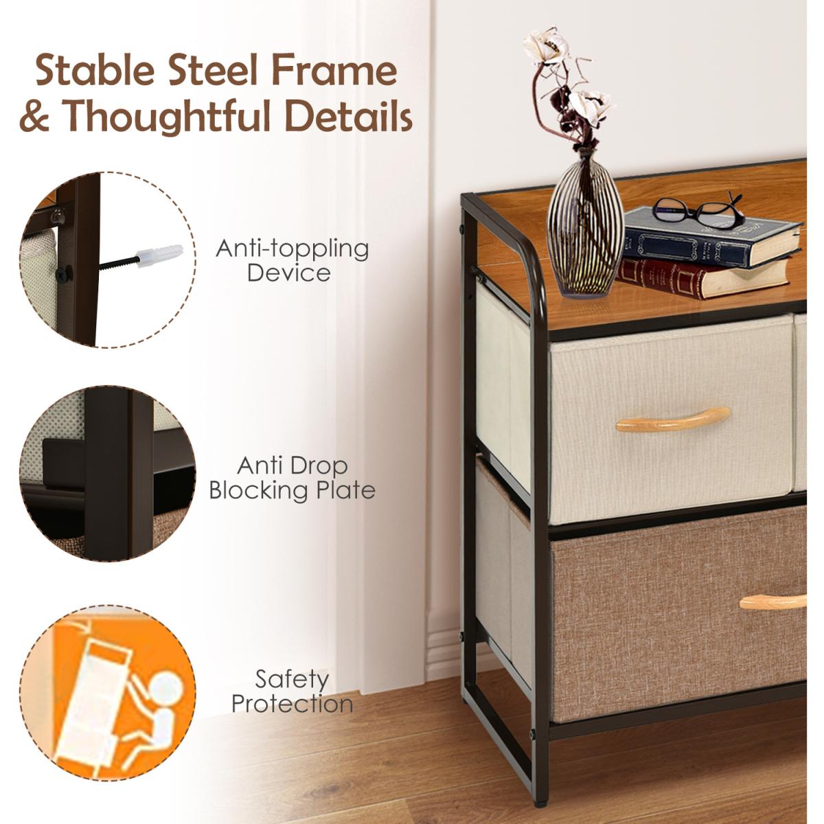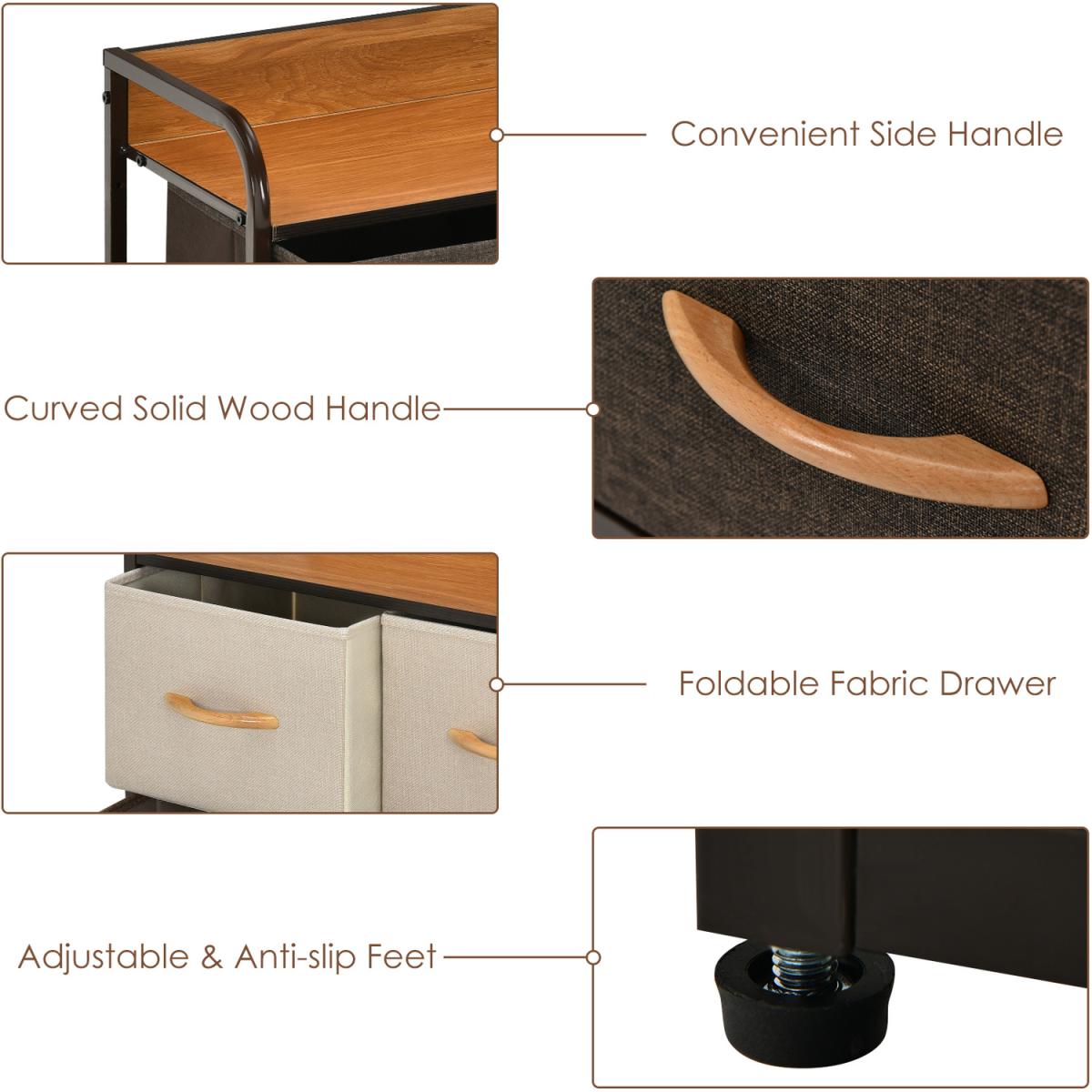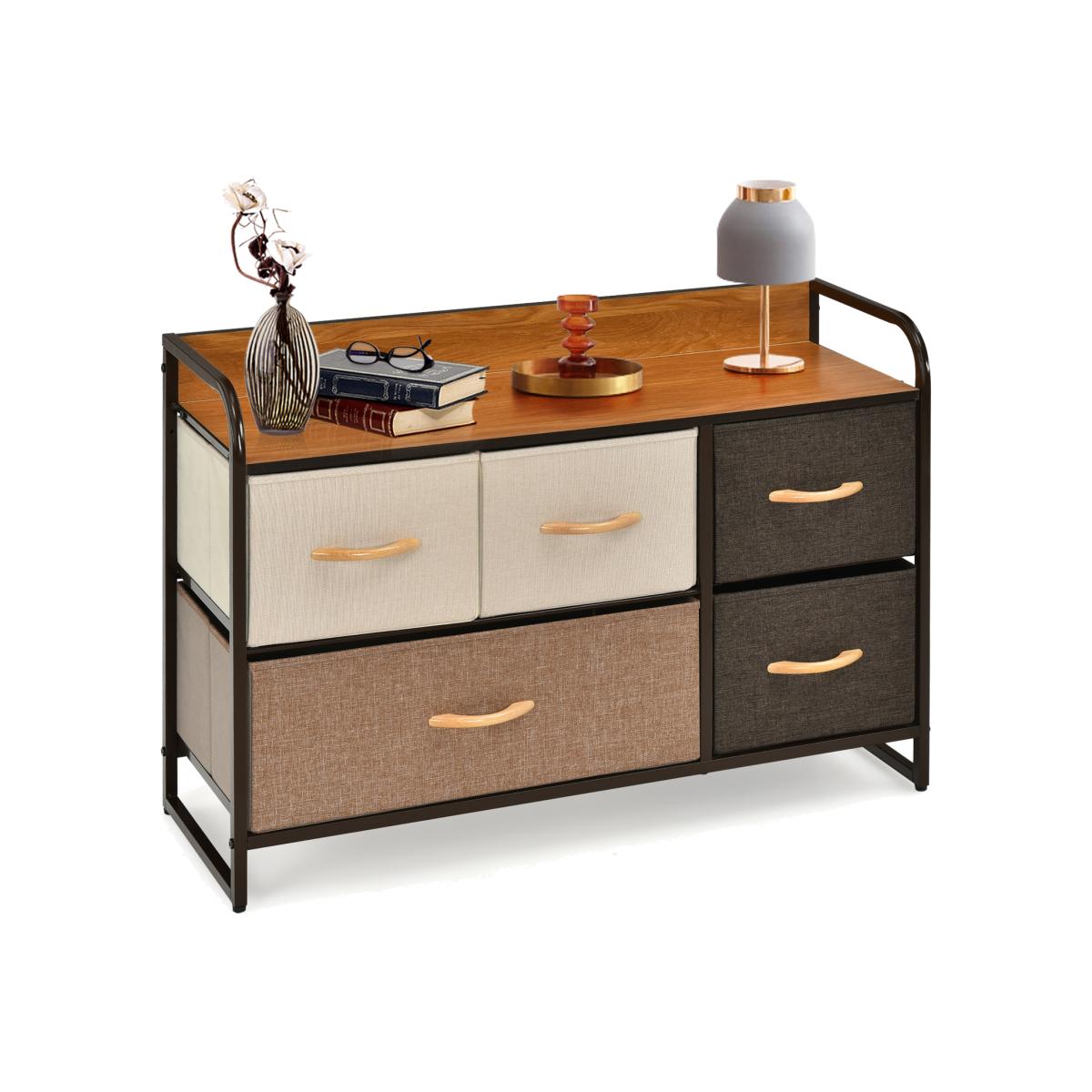 A multifunctional and nice-looking organizer unit for your home!This dresser storage tower with 5 foldable drawers will organize your items in good order to maximize your space and make your room tidy. High-grade fabric drawers can keep things in good condition and are more durable. Modern style allows the dresser to blend with any home decor easily. It is perfect for bedroom, nursery room, laundry room, living room, hallway, closets, etc. As for the quality, our cabinet is made of sturdy iron frame and durable MDF top, ensuring strong stability and long-lasting use. And the wooden top is smooth and waterproof for easy cleaning. Featuring a lightweight and compact design, this 5-drawer dresser chest stand is portable, easy to move and assemble.