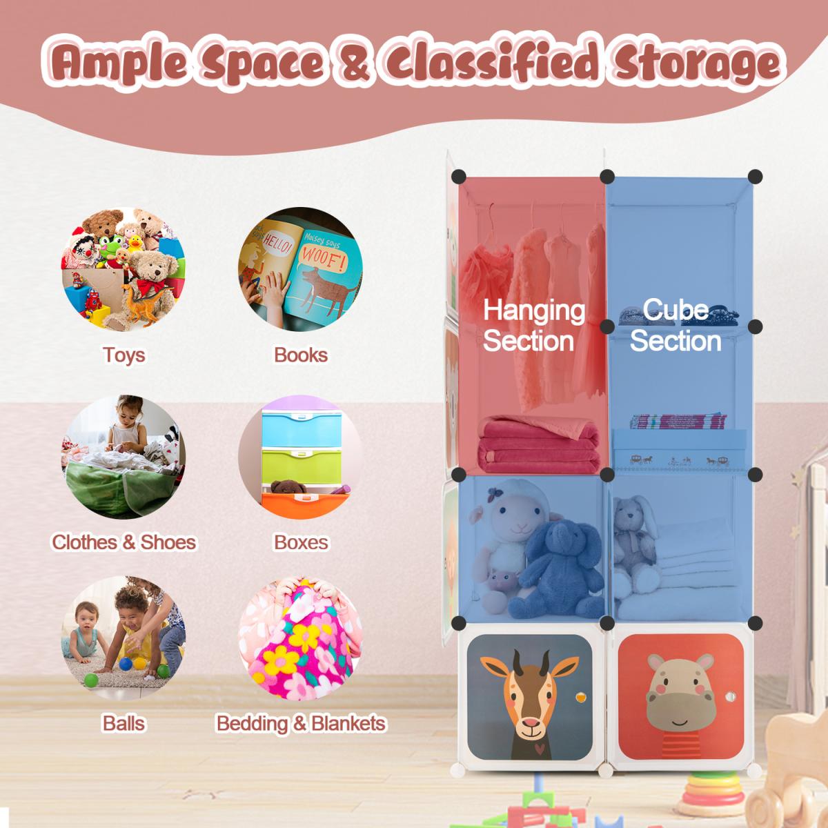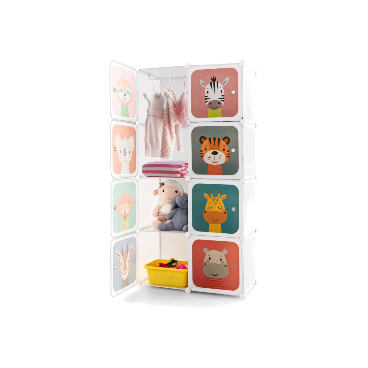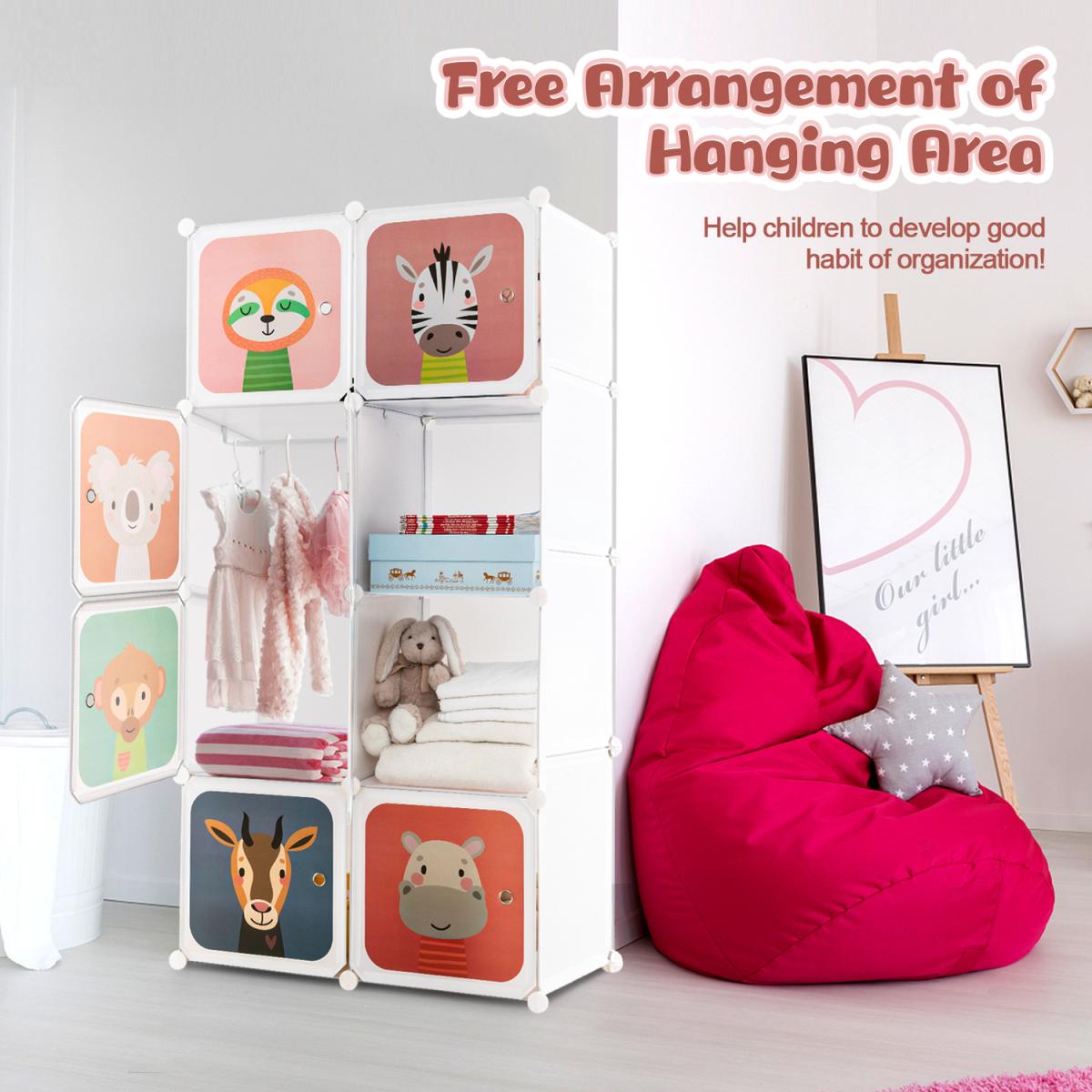 If you always have baby's clothes or toys cluttered here and there, this 8-cube storage organizer will be a good solution. First and foremost, the kid's room armoire features plenty of storage space to hold the sundries and keep the room clean. There's even a hanging section for baby's clothes. What's more, it can be freely combined according to specific needs, being used separately or be stacked for narrow corners. Usually it is combined for larger space. And the 2 x 4 cube organizer has cute patterned doors, which not only hide the mess, but also decorate the space. And tool-free assembly means you can easily put the wardrobe together without professional skills or technical tools.