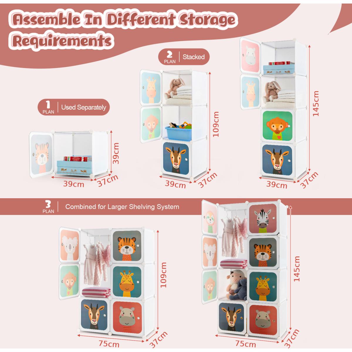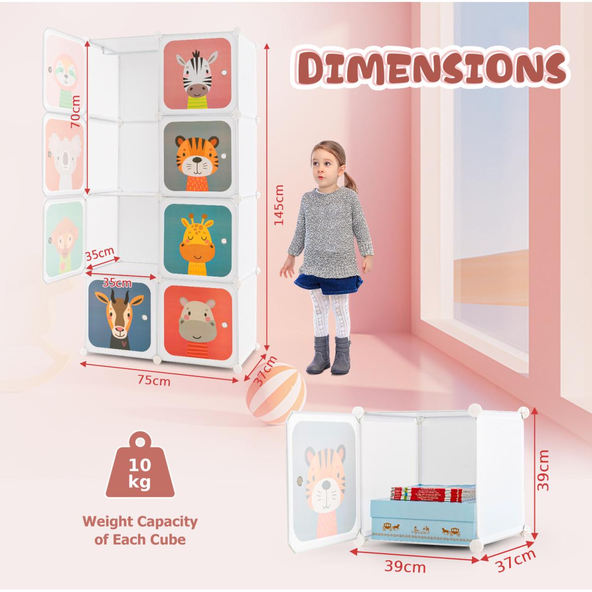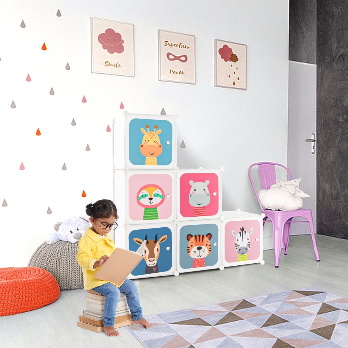 If you always have baby's clothes or toys cluttered here and there, this 8-cube storage organizer will be a good solution. First and foremost, the kid's room armoire features plenty of storage space to hold the sundries and keep the room clean. There's even a hanging section for baby's clothes. What's more, it can be freely combined according to specific needs, being used separately or be stacked for narrow corners. Usually it is combined for larger space. And the 2 x 4 cube organizer has cute patterned doors, which not only hide the mess, but also decorate the space. And tool-free assembly means you can easily put the wardrobe together without professional skills or technical tools.
