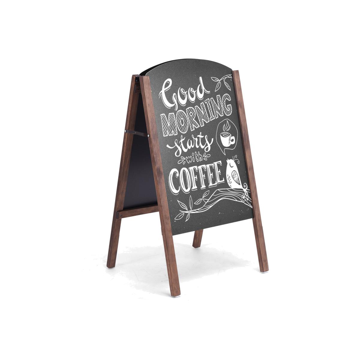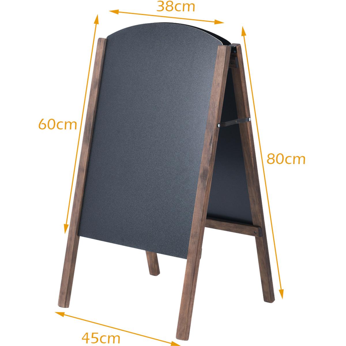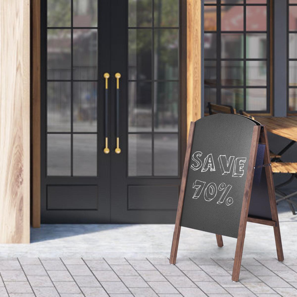 This beautifully handcrafted rustic chalkboard will upgrade and enhance any indoor and outdoor venue. This sidewalk sign is a perfect choice to draw customer attention to your business or welcome guests at your wedding reception. With solid pine wood legs, and durable MDF chalkboard, this sandwich board sign will withstand winds and last for years. Featuring 2 sides makes this menu chalkboard incredibly convenient for switching between 'open' and 'closed' signs. Dual blackboards provide ample writing space for promotional messages. If you want to make changes to your sidewalk sign or simply want to touch up the artwork on your display, you can wipe the sign with a damp cloth. You can start creating new ideas right away! You can use liquid chalk markers as well as standard chalk on this board. Our rustic sidewalk signs are designed for many occasions, enhancing the look of any event or business. Suitable for businesses, restaurants and weddings, retail stores, restaurants or cafes to advertise happy hours and promotional items!