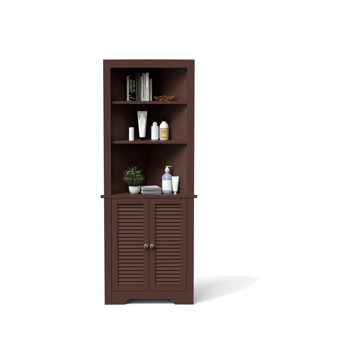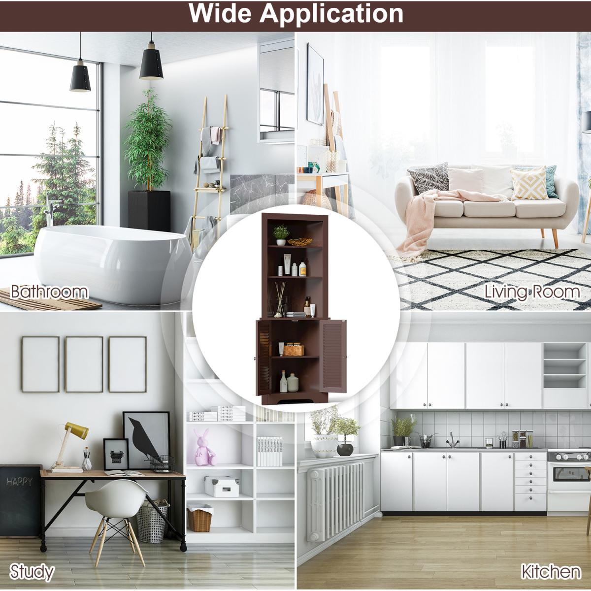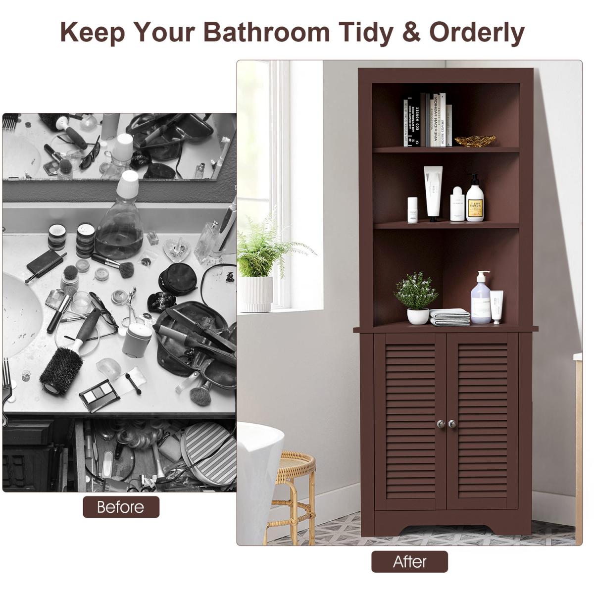 This is our multifunctional corner storage cabinet which will provide you with plenty of vertical storage space to put various items. Made of premium P2 MDF board, this bathroom cabinet is stable and durable for a long lasting use. The three-layer open shelf and a closed cabinet provide you with sufficient storage space, allowing you to organize towels, shower gel, books and other supplies in an orderly manner. The elegant and modern appearance is perfect for blending with your bathroom, bedroom and living room. If you are person who pursue a clean and orderly life, you will love it.