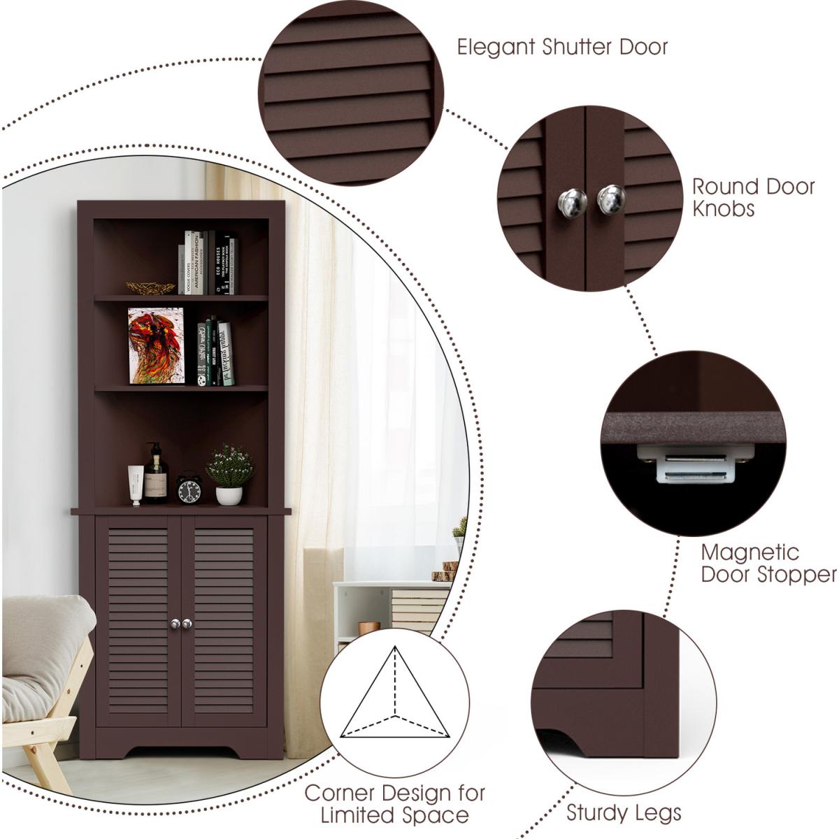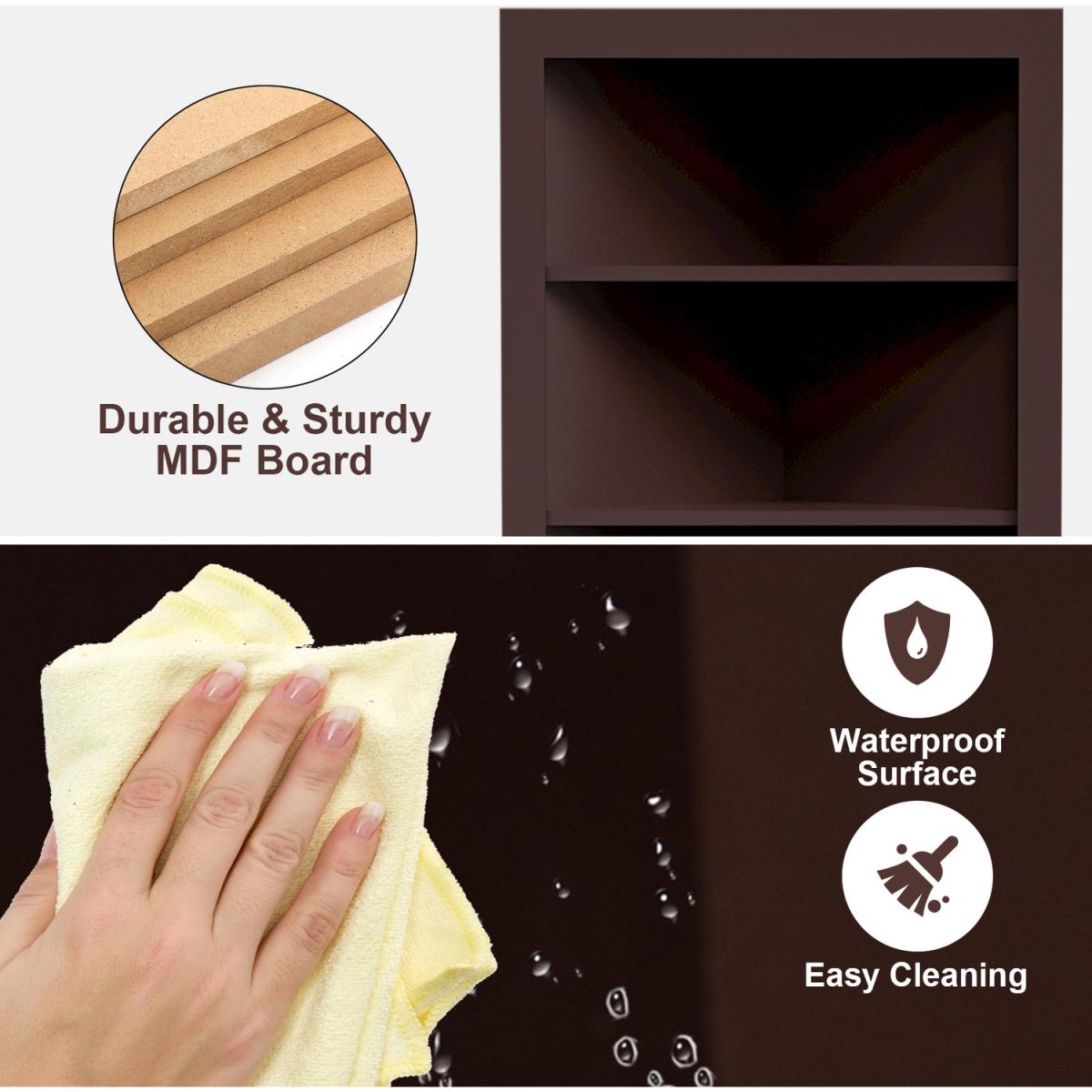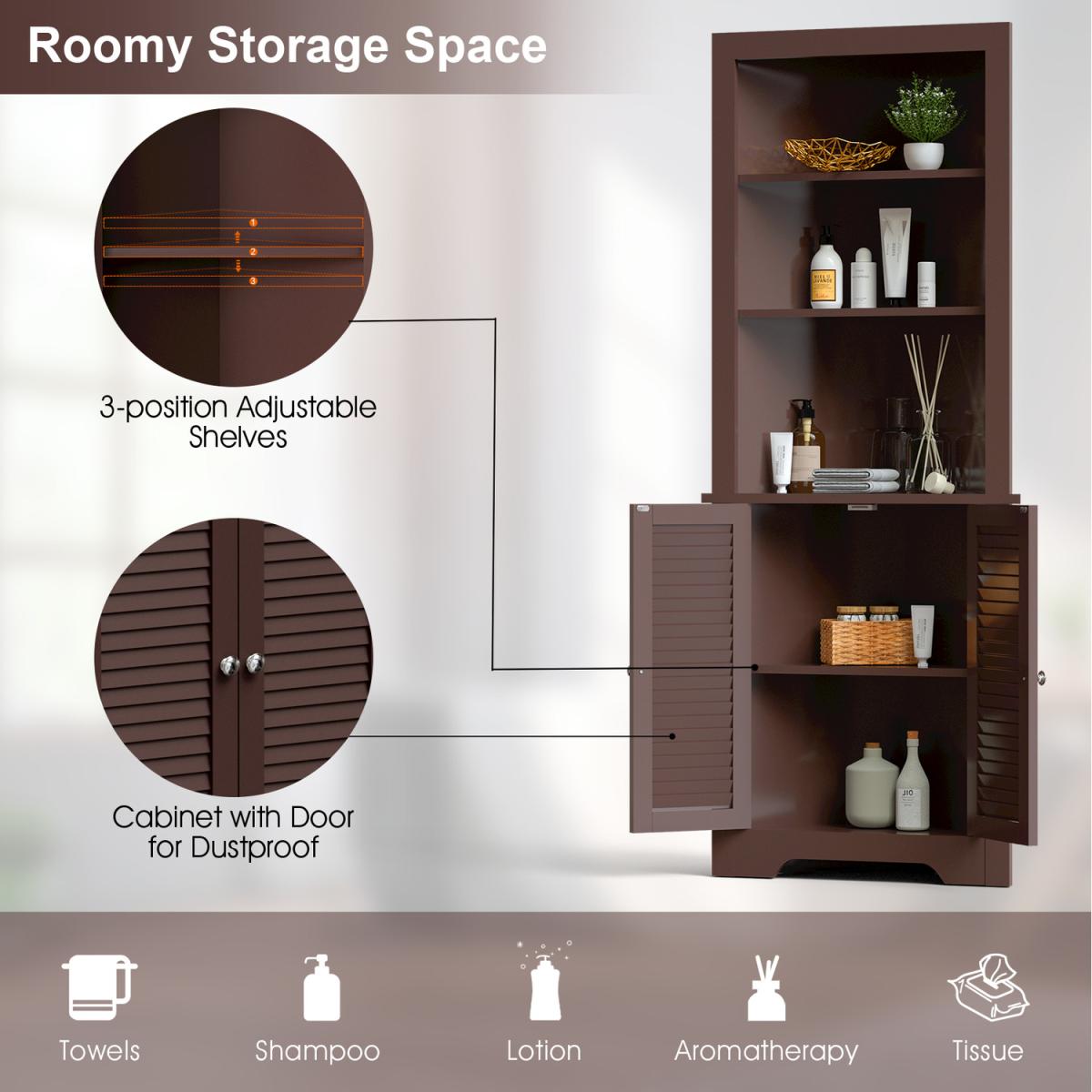 This is our multifunctional corner storage cabinet which will provide you with plenty of vertical storage space to put various items. Made of premium P2 MDF board, this bathroom cabinet is stable and durable for a long lasting use. The three-layer open shelf and a closed cabinet provide you with sufficient storage space, allowing you to organize towels, shower gel, books and other supplies in an orderly manner. The elegant and modern appearance is perfect for blending with your bathroom, bedroom and living room. If you are person who pursue a clean and orderly life, you will love it.