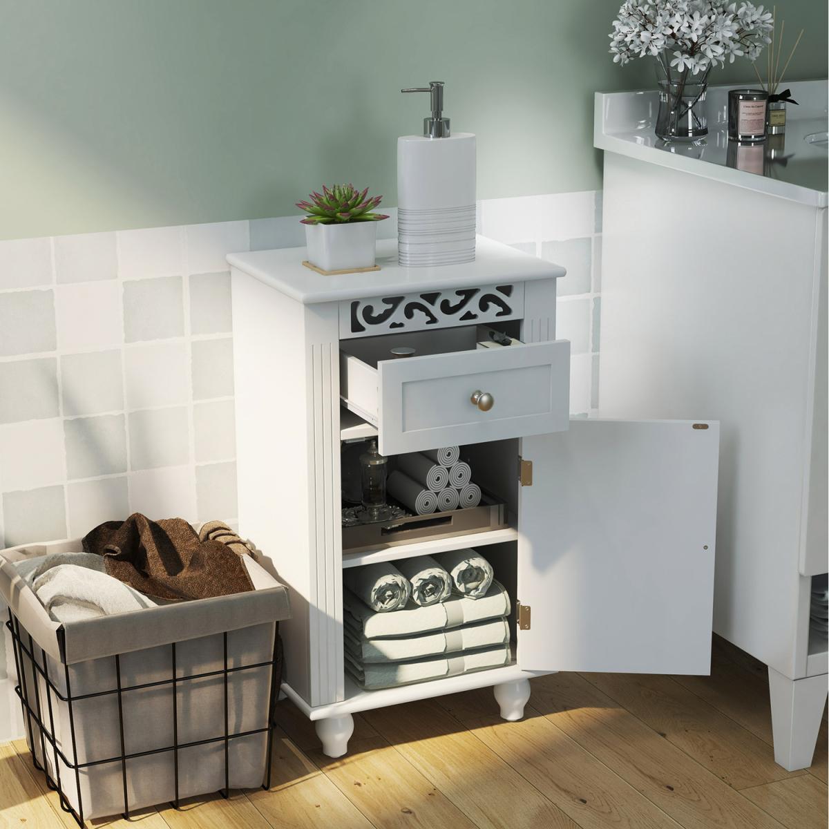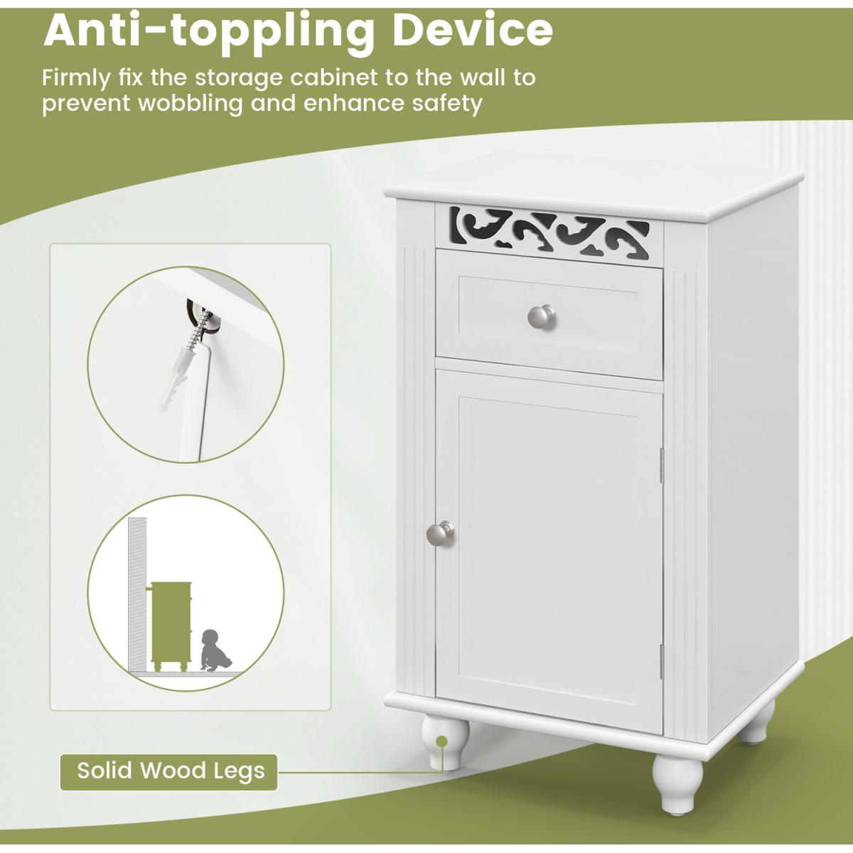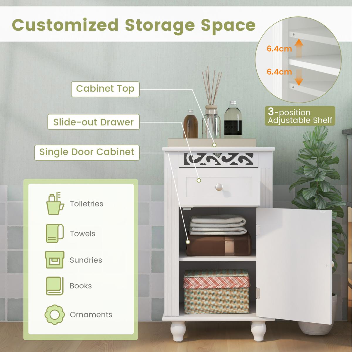 Enjoy a convenient and tidy life with this single door floor storage cabinet!Equipped with a pull-out drawer and a single door 2-tier cabinet, this freestanding storage organizer provides roomy storage space and is a good choice for tucking away bathroom clutter. Besides, there is a 3-position adjustable shelf to store items of different sizes. Made of premium MDF and solid wood legs, this bathroom floor cabinet is stable and durable. Moreover, the anti-toppling device helps to fix the cabinet to the wall firmly for added safety. The pure white finish, clean lines and unique carved flower pattern make this floor storage cabinet look elegant and fit well with any home decor.