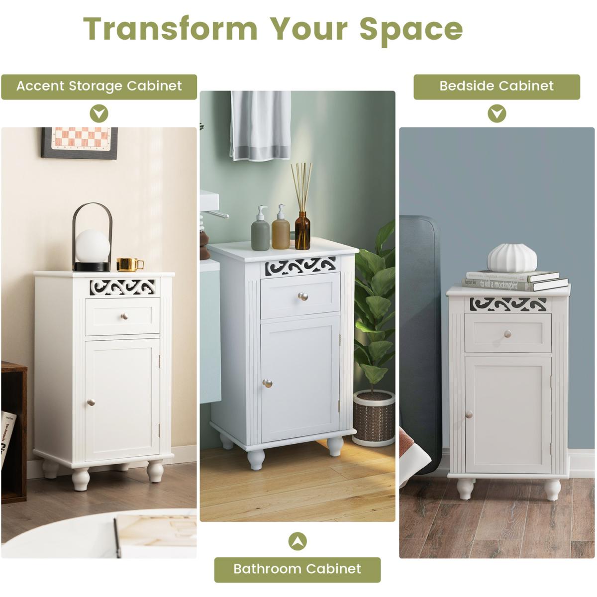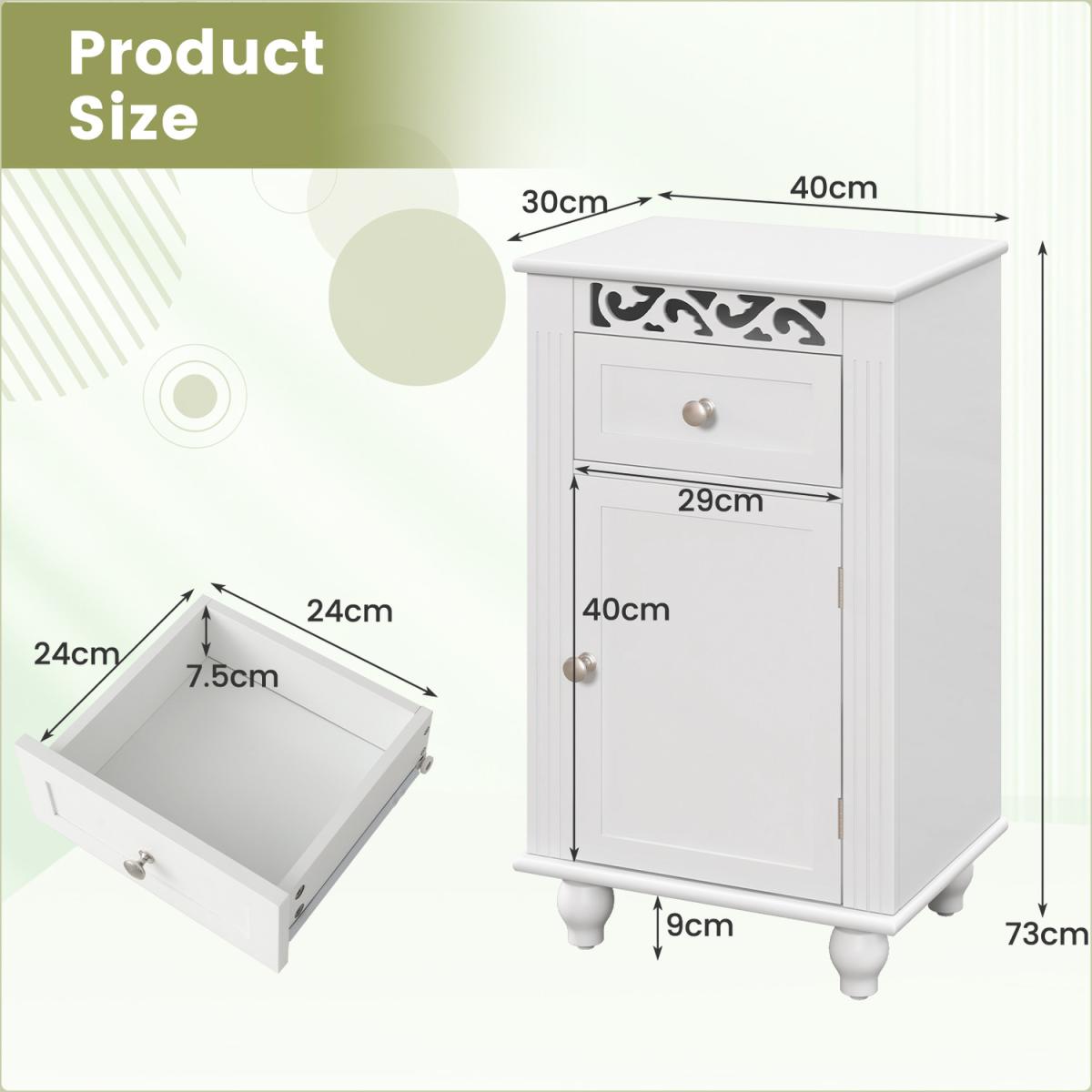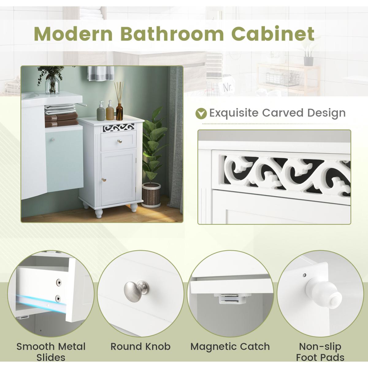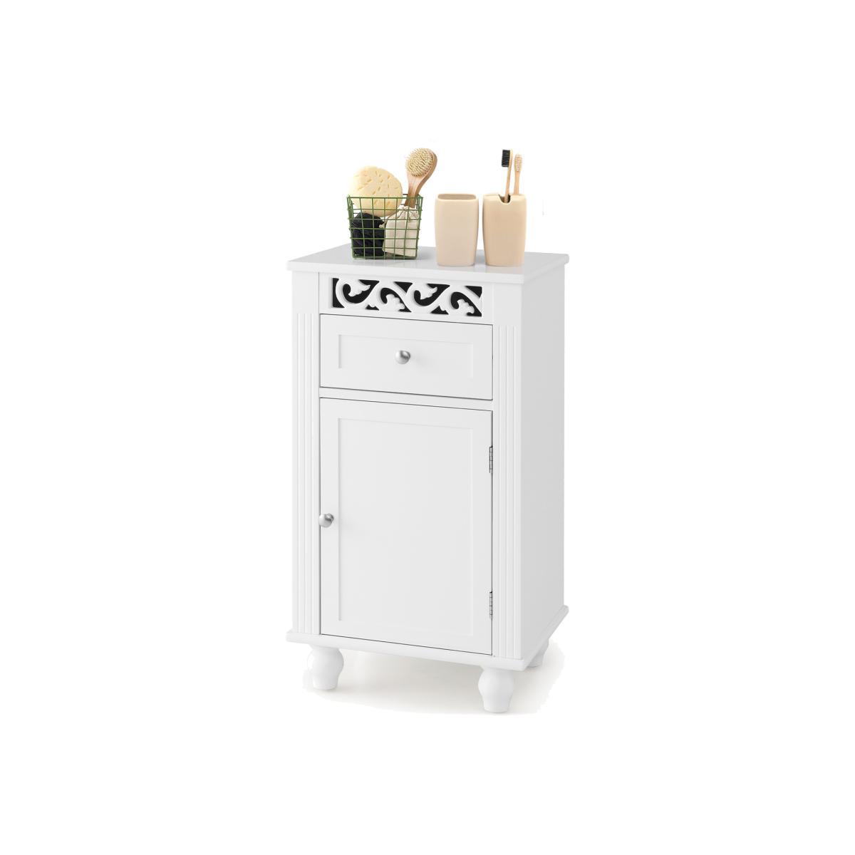 Enjoy a convenient and tidy life with this single door floor storage cabinet!Equipped with a pull-out drawer and a single door 2-tier cabinet, this freestanding storage organizer provides roomy storage space and is a good choice for tucking away bathroom clutter. Besides, there is a 3-position adjustable shelf to store items of different sizes. Made of premium MDF and solid wood legs, this bathroom floor cabinet is stable and durable. Moreover, the anti-toppling device helps to fix the cabinet to the wall firmly for added safety. The pure white finish, clean lines and unique carved flower pattern make this floor storage cabinet look elegant and fit well with any home decor.