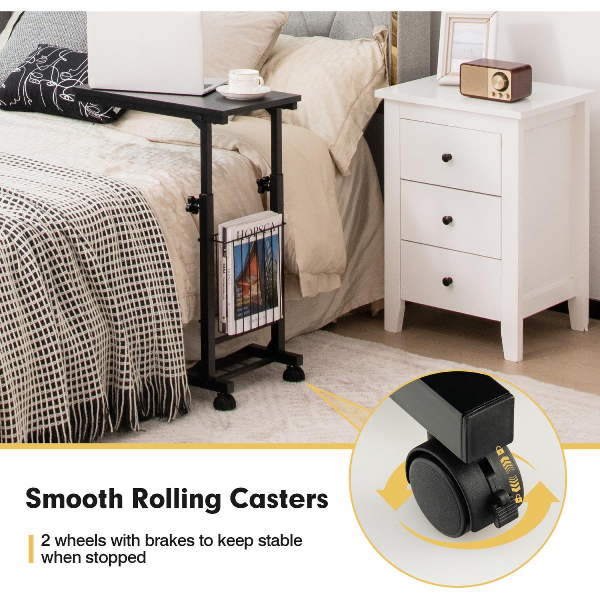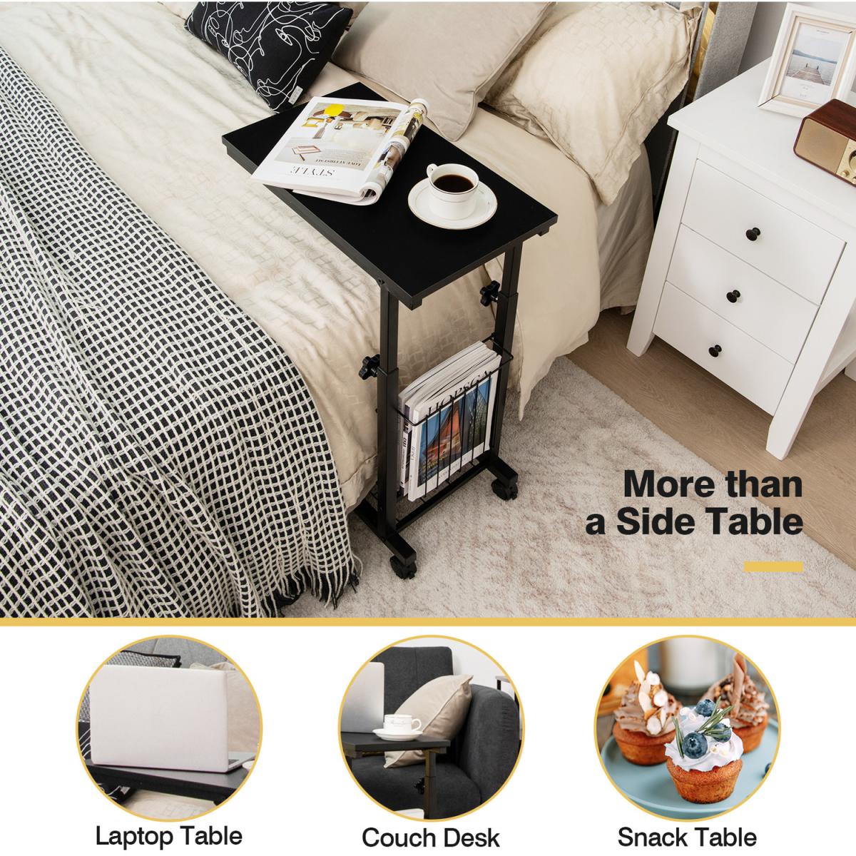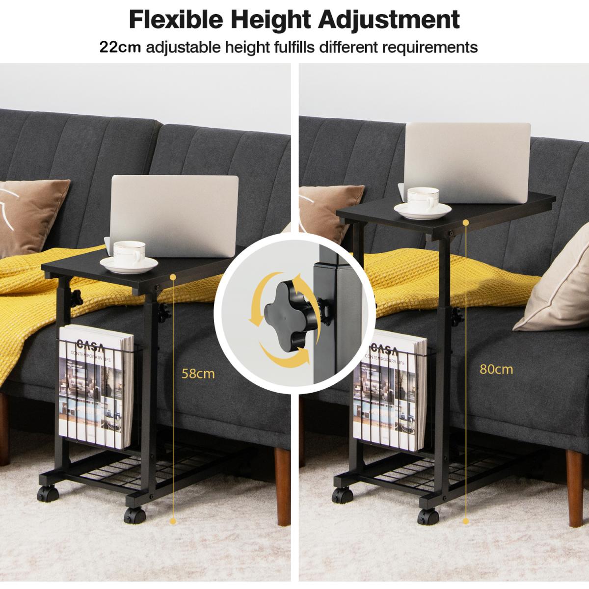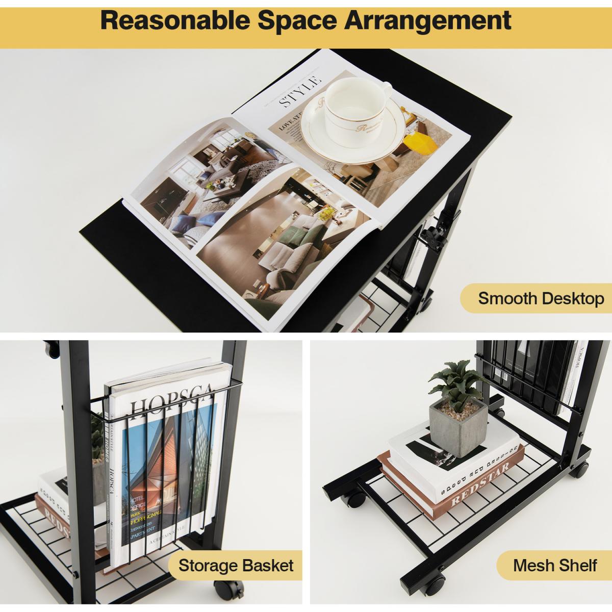 A good assistant for your working, studying or any other activities! Unique c-shape design is easy to insert the table into the bottom of the sofa or bed. The tabletop is spacious enough to put necessary office supplies. The combination of storage basket and bottom mesh storage shelf gives your more space to store daily items. Moreover, you can simply turn the knob to adjust your desired height. For great mobility and convenient use, the flexible casters make it easier to move the sofa side table from one place to another. Whether used in the living room, bedroom and office, our c-shape end table will undoubtedly be an ideal choice.